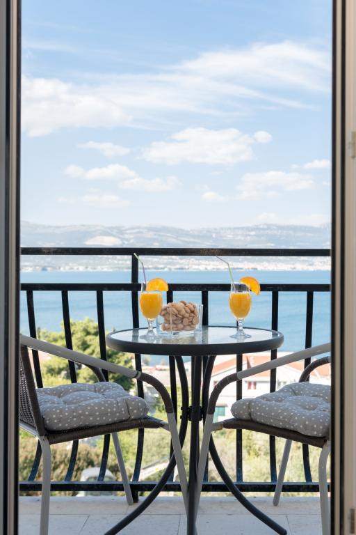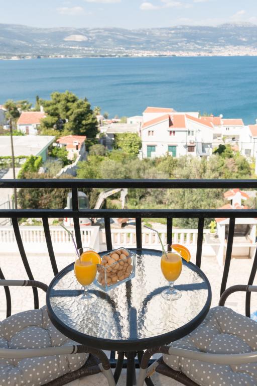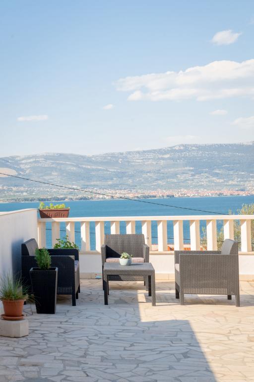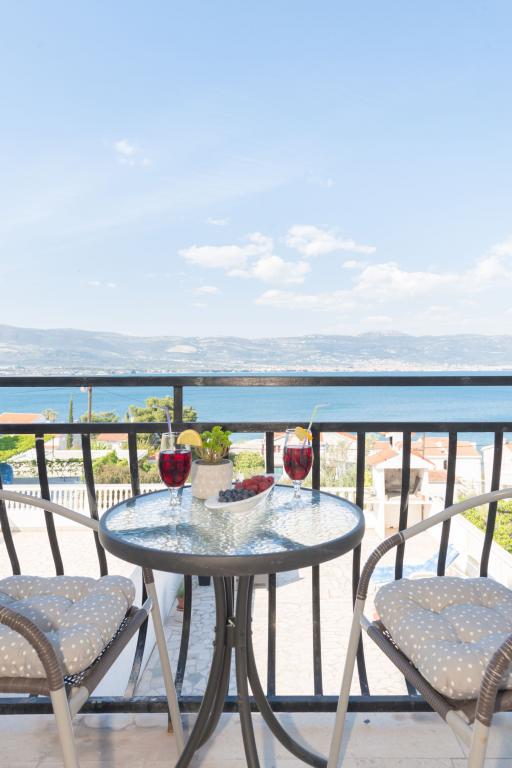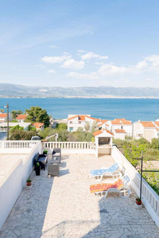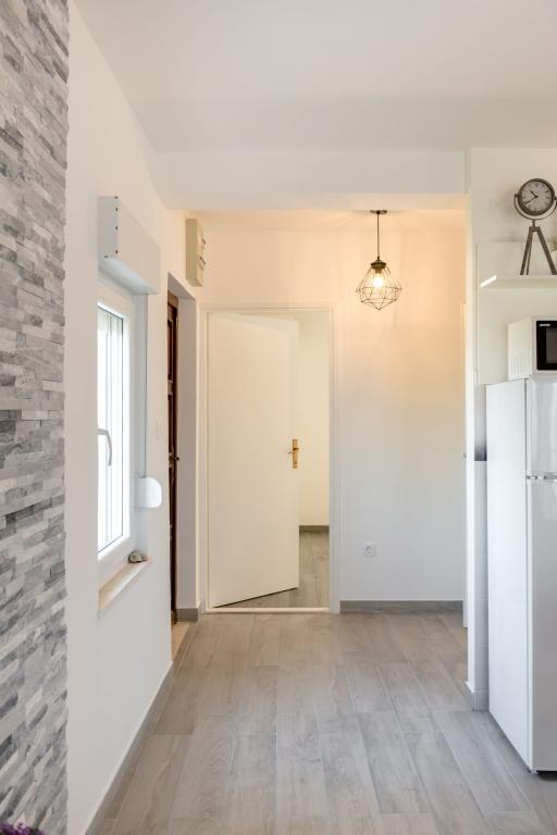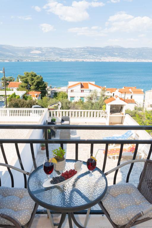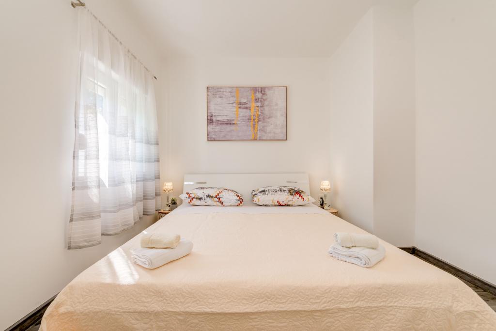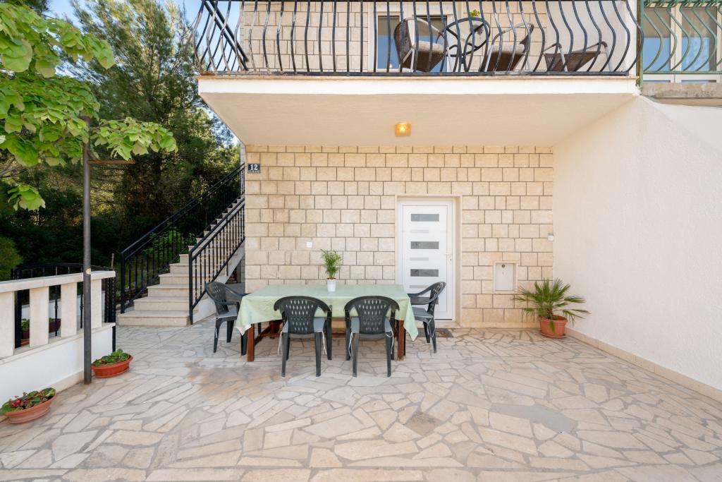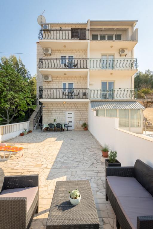 Kamena kuća prizemlje i tri kata s velikom terasom i kaminom udaljena 70m od mora. Iznajmljuju se prvi i drugi kat odnosno prvi i drugi apartman. Oba apartmana su jednako opremljena, a sastoje se od spavaće sobe,dnevnog boravka u kojemu se nalazi kauč na razvlačenje, kuhinja opremljena sa svime potrebnim za pripremu hrane uključujući i mikrovalnu pećnicu, kupatilo te balkon s predivnim pogledom na more. Dodatno postoji pomoćni ležaj i prenosivi krevetić za bebu na upit. Neograničen internet, smart TV sa satelitskim programima. Klima uređaj bez dodatne naplate.