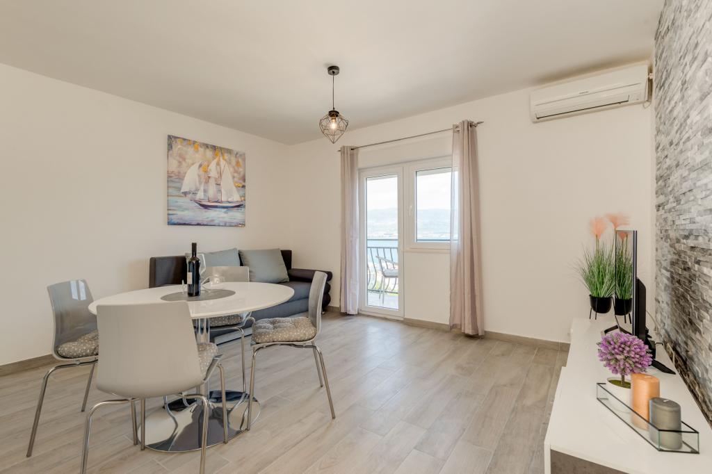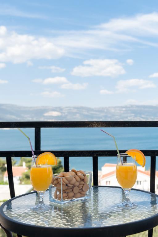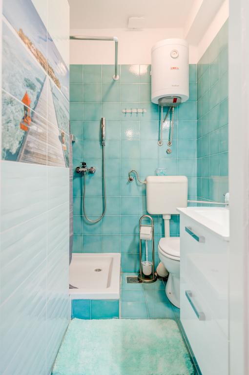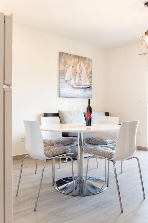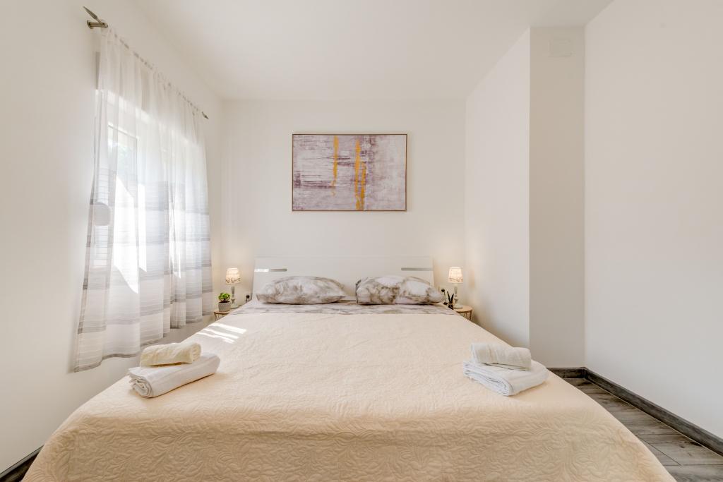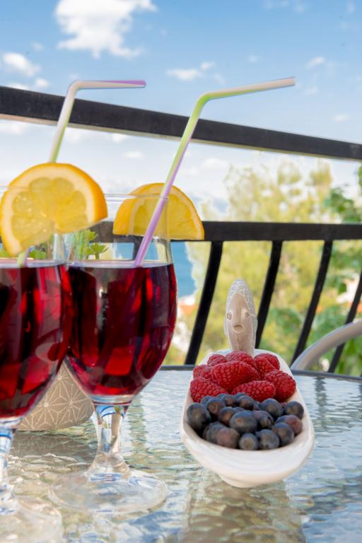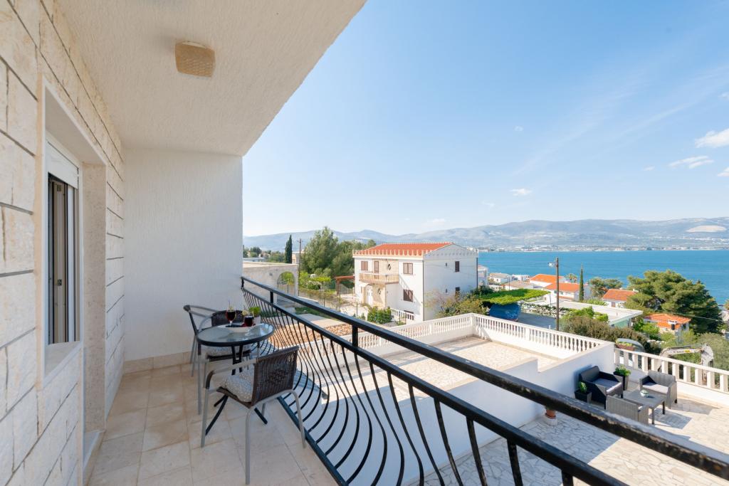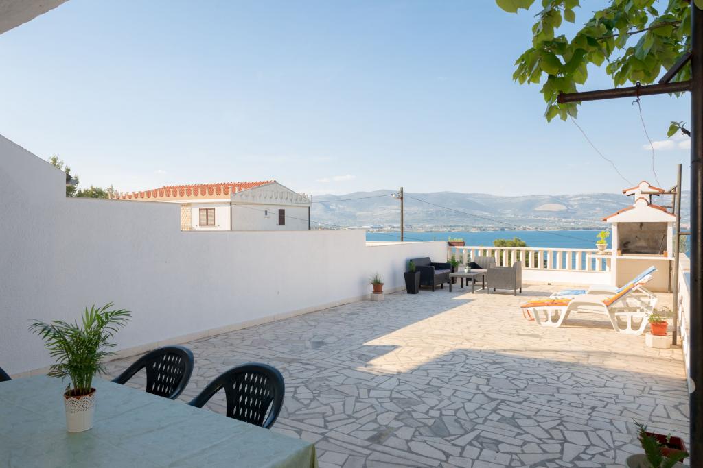 Kamena kuća prizemlje i tri kata s velikom terasom i kaminom udaljena 70m od mora. Iznajmljuju se prvi i drugi kat odnosno prvi i drugi apartman. Oba apartmana su jednako opremljena, a sastoje se od spavaće sobe,dnevnog boravka u kojemu se nalazi kauč na razvlačenje, kuhinja opremljena sa svime potrebnim za pripremu hrane uključujući i mikrovalnu pećnicu, kupatilo te balkon s predivnim pogledom na more. Dodatno postoji pomoćni ležaj i prenosivi krevetić za bebu na upit. Neograničen internet, smart TV sa satelitskim programima. Klima uređaj bez dodatne naplate.