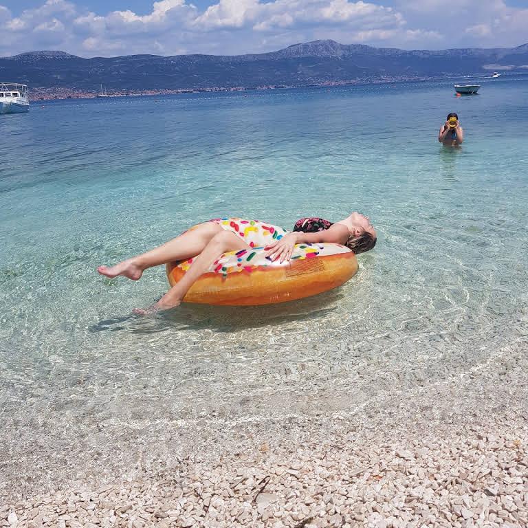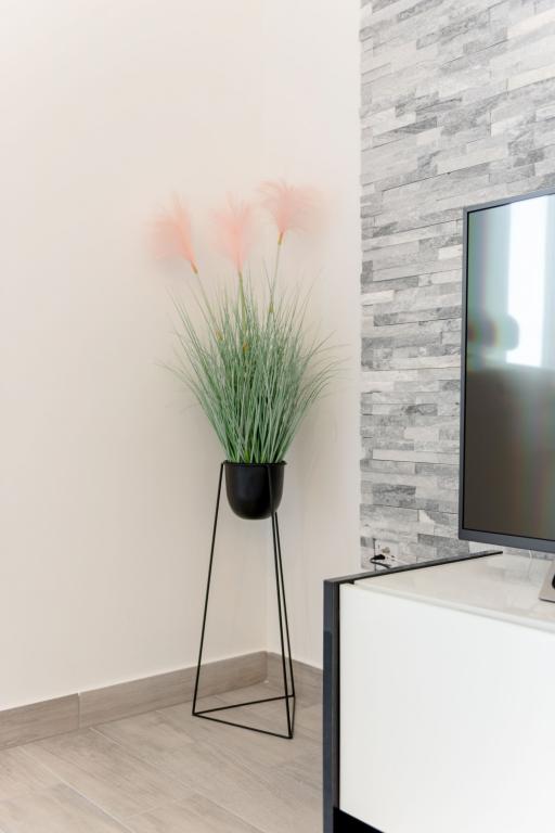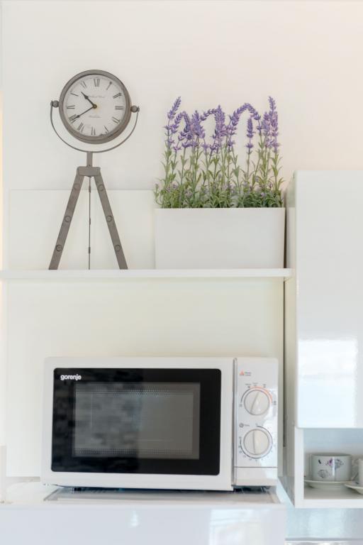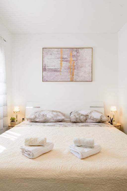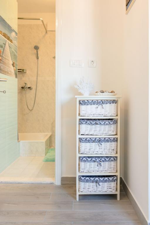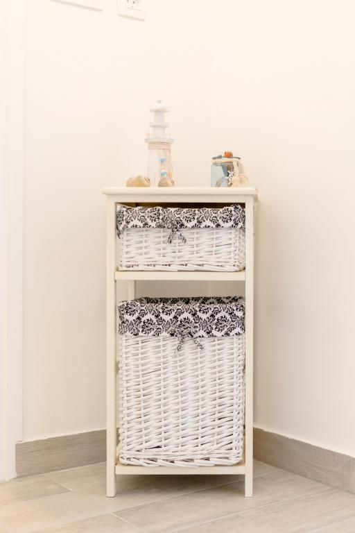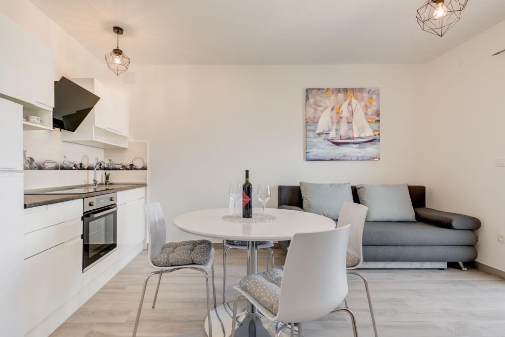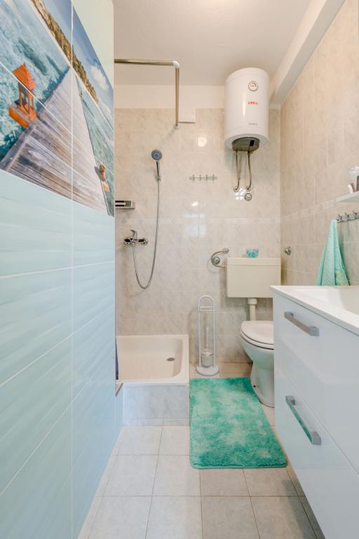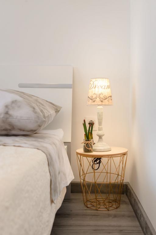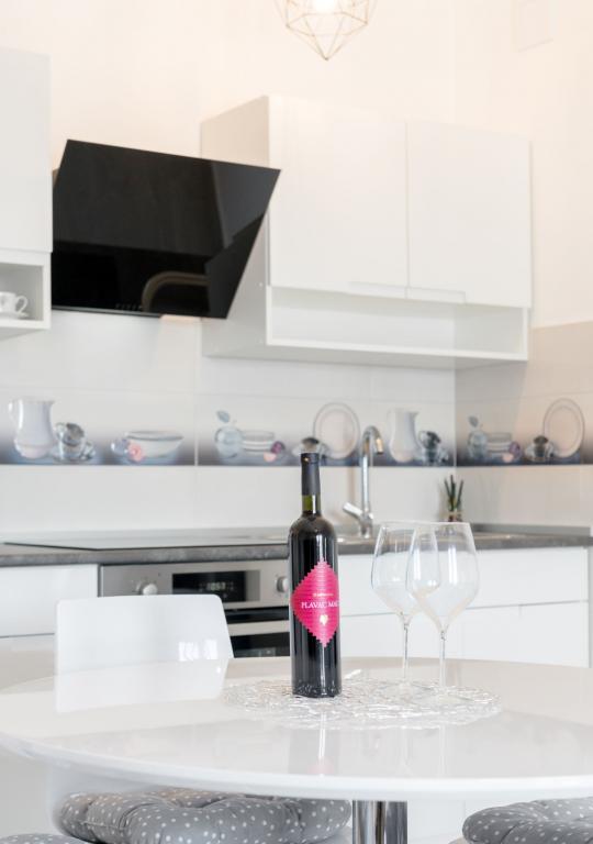 Kamena kuća prizemlje i tri kata s velikom terasom i kaminom udaljena 70m od mora. Iznajmljuju se prvi i drugi kat odnosno prvi i drugi apartman. Oba apartmana su jednako opremljena, a sastoje se od spavaće sobe,dnevnog boravka u kojemu se nalazi kauč na razvlačenje, kuhinja opremljena sa svime potrebnim za pripremu hrane uključujući i mikrovalnu pećnicu, kupatilo te balkon s predivnim pogledom na more. Dodatno postoji pomoćni ležaj i prenosivi krevetić za bebu na upit. Neograničen internet, smart TV sa satelitskim programima. Klima uređaj bez dodatne naplate.