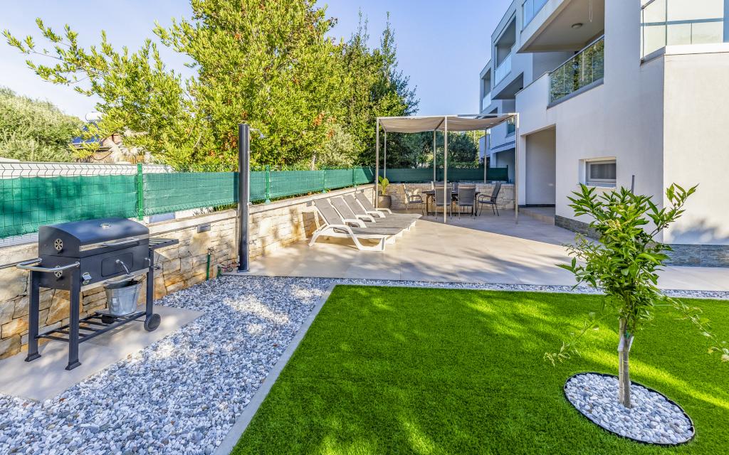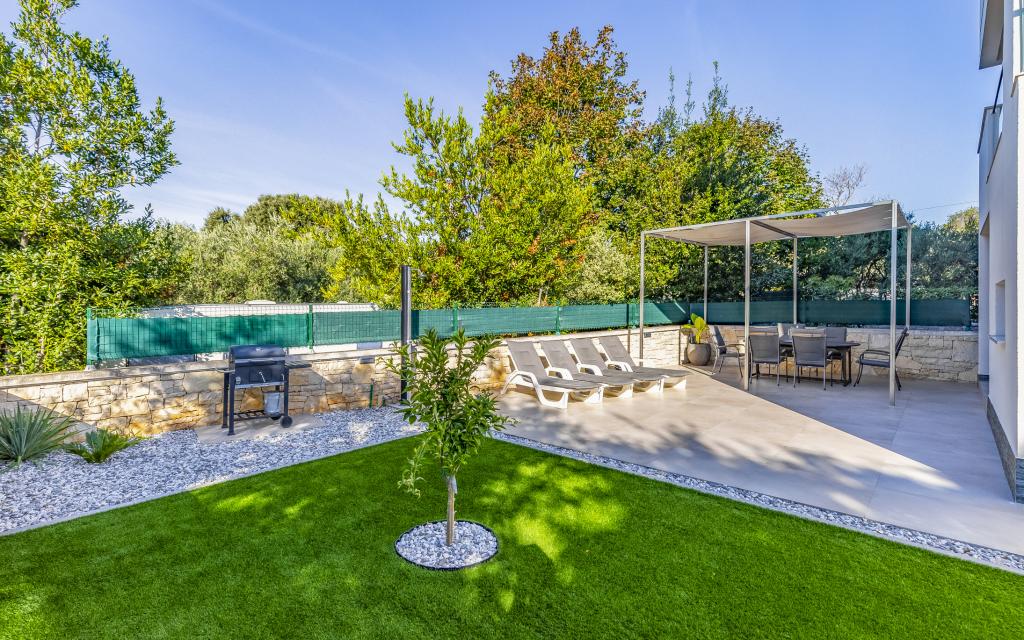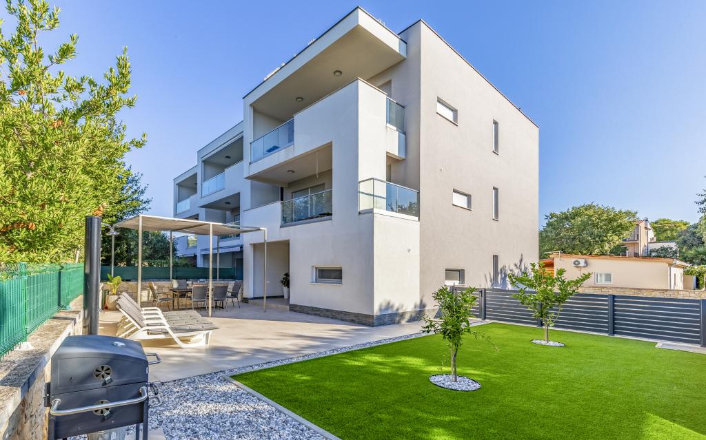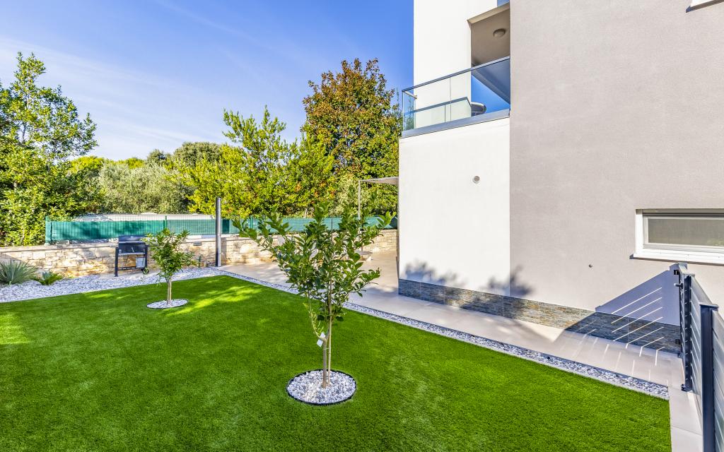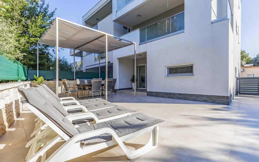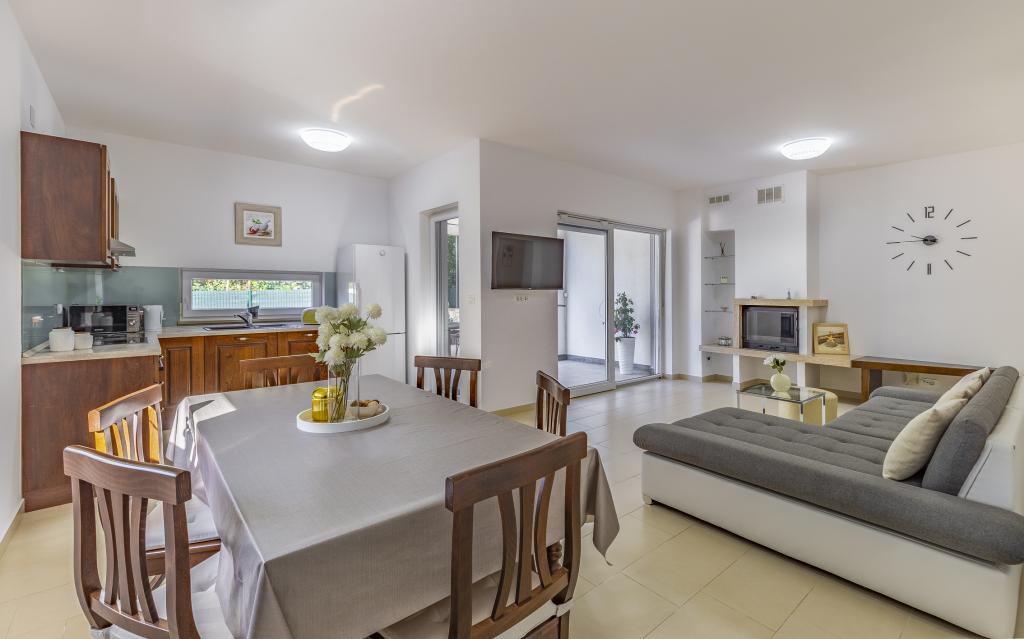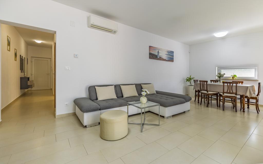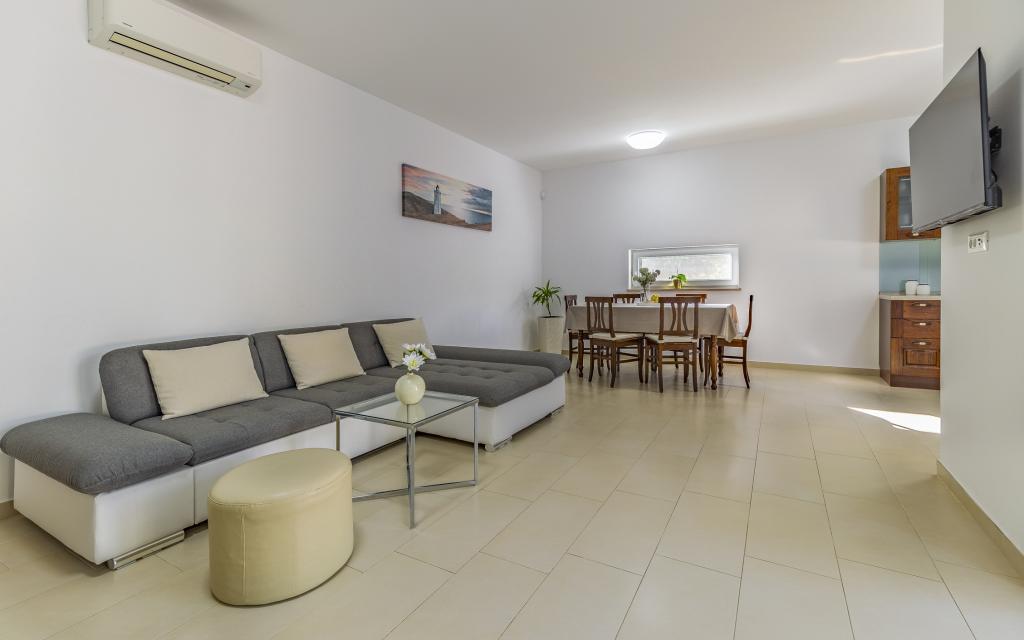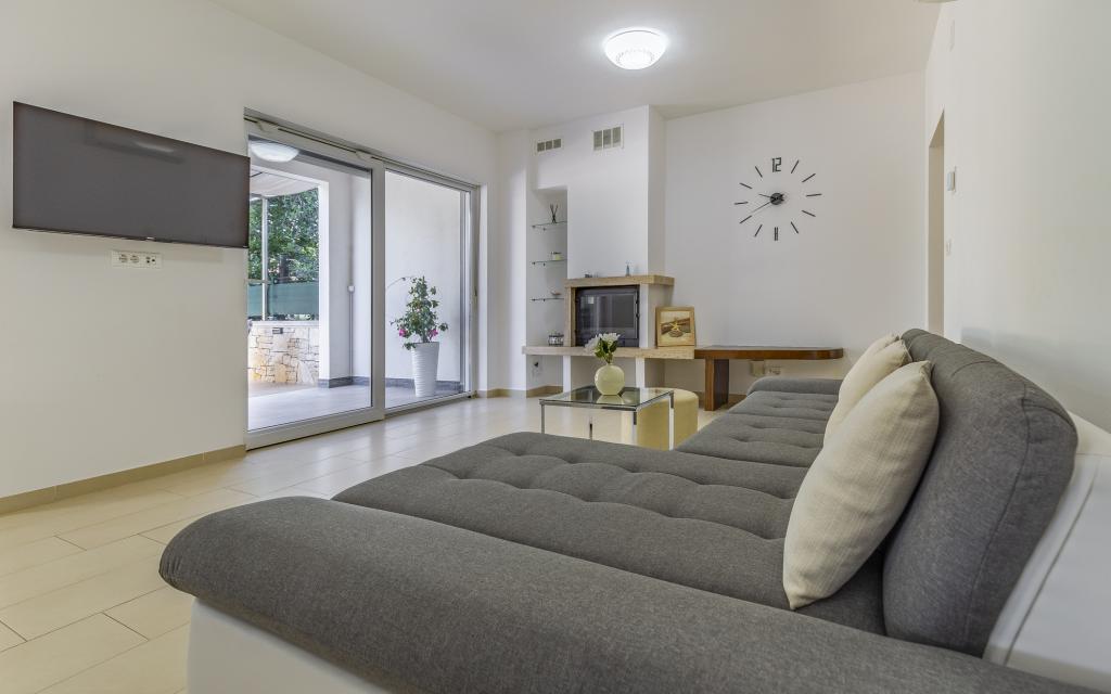 Potpuno i nadstandardno namješten apartman (80 m2) na izvrsnoj lokaciji u mirnom dijelu Banjola, samo 5 minuta (300 m) hoda do najljepših plaža na lokaciji. Apartman se nalazi u prizemlju stambene zgrade sa samo tri stana. Apartman ima vlasnički vrt (100 m2) sa terasom, stolom, ležaljkama, vanjskim tušem i roštiljem koji omogućava ugodno druženje uz puno privatnosti te je posebno pogodan za obitelji s djecom. Uz zgradu se nalazi privatno parkiralište s kojeg se ulazi direktno na vrt i terasu. Vrt je potpuno renoviran 2024. godine. Cijeli objekt je zaštićen sigurnosnom ogradom (pristup karticom). Apartman ima 2 spavaće sobe s bračnim krevetima, 2 kupaonice s WC-om i tuš kabinom, prostrani dnevni boravak s rastezljivim kaučom, blagovaonicom i kuhinjom. Apartman je klimatiziran i grijan zimi (podno grijanje) te ima unutarnji kamin pa je pogodan i za boravak u hladnijim mjesecima jeseni i zime. U neposrednoj blizini apartmana nalaze se brojni barovi i restorani, kao i uređene st