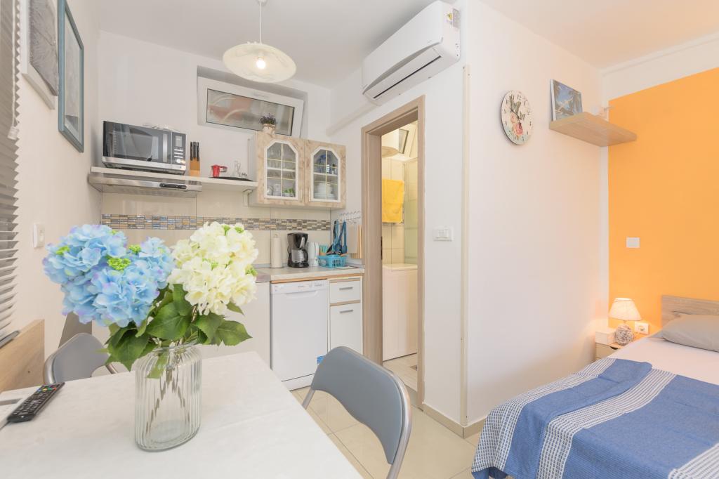Suvremeno opremljen studio apartman ( 2+1) prvi red do mora u veoma mirnom turističkom području kao samostalna kučica . Mala terasa sa svoj roštiljem vanjskim )tušem i pogled sa terase na more. Posjeduje vlastitu tendu za ugodan boravak u hladovini. Trgovina i restoran udaljen je 1000 metara a do prve plaže je 300 metara. Parking u blizini objekta bez naplate. Možete uživati u jutarnjim i večernjim šetnjama uz more do hotela Del Mar i nazad . Nadalje u blizini je nacionalni park kamenjak - Premantura na udaljenosti od cca 4000 metara .