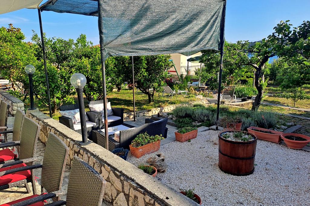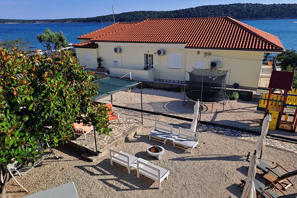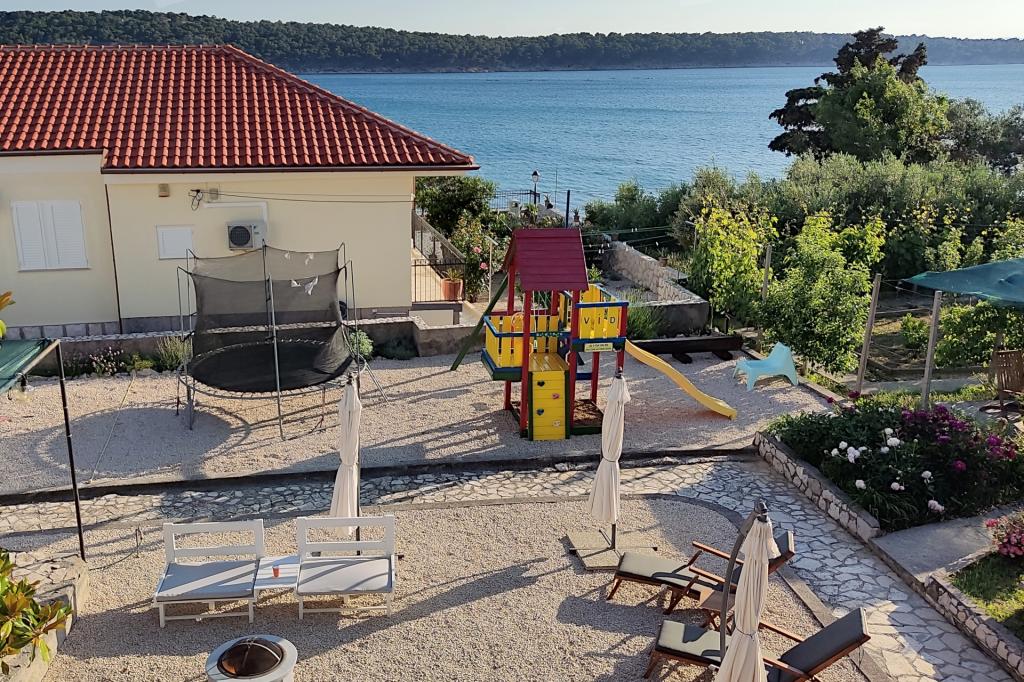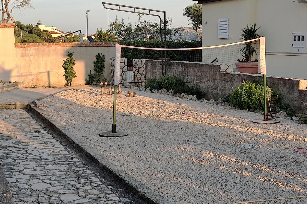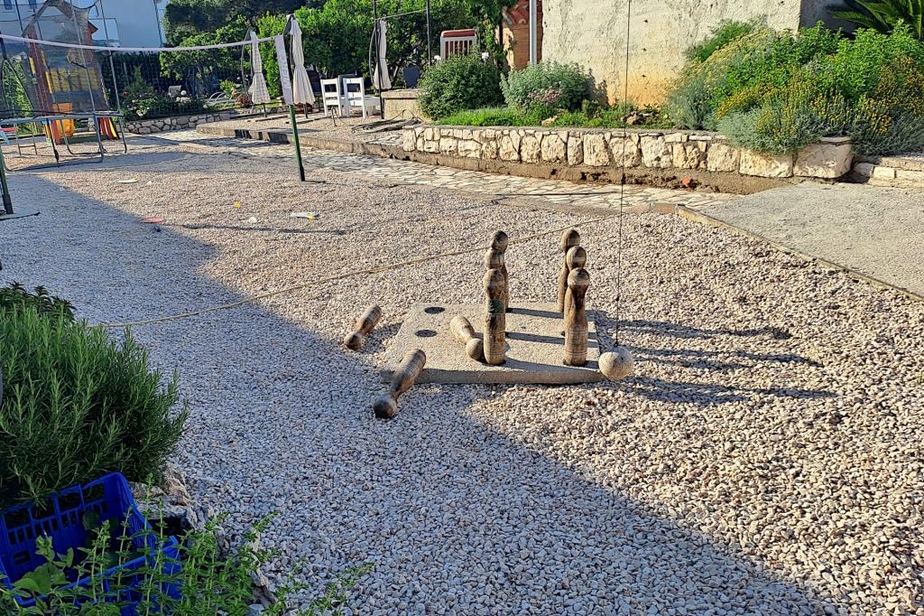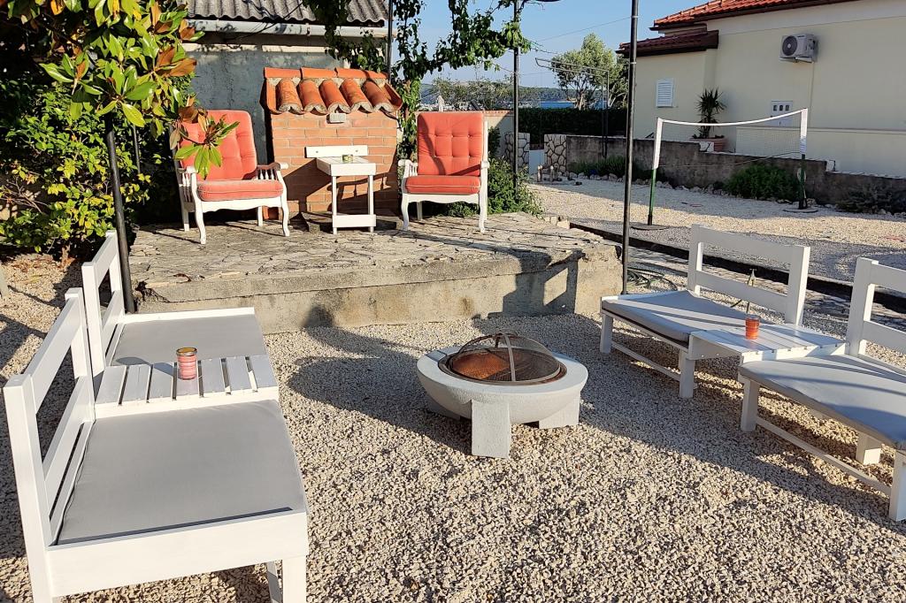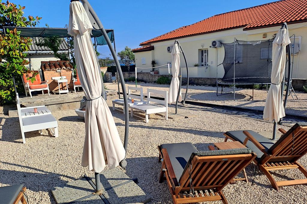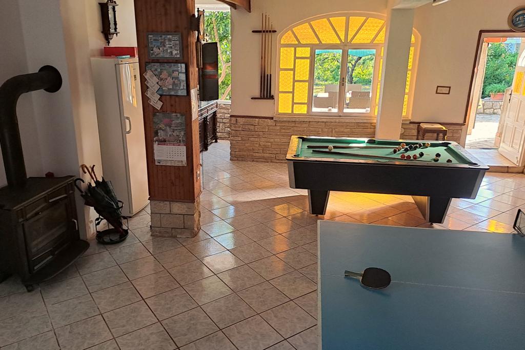 Vrtna terasa s roštiljem na drva i plin, vrtne garniture, suncobrani, druženja na otvorenom, samo vas čekaju! Nema ništa bolje od uživanja na otvorenom u finoj hrani i ugodnom društvu. Opustite se i uživajte u suncu na ležaljkama na terasi za sunčanje. Ako želite malo aktivnosti, u vrtu je igralište za djecu i odrasle. Tu su trampolin, badminton i zračna kuglana, a za vaše najmlađe članove ljuljačke, tobogan i pijesak za djecu. U zajedničkoj sobi nalazi se stolni tenis, bilijar, elektronski pikado, stolni nogomet i satelitska TV. 30 metara od kuće nalazi se mala plaža i besplatni privezi za brod na molu. Koristimo 5 vezova za brod. Brod morate najaviti prilikom rezervacije. Ako dođete s prikolicom i brodom, molimo vas da prvo parkirate brod i prikolicu kod krana. Na uskom prilazu do naše kuće nema mjesta za okretanje. Ograničenje odgovornosti: Ne preuzimamo nikakvu odgovornost za vezove i njihovo stanje. Vaša je odgovornost kao vlasnika plovila ispravno vezati plovilo.