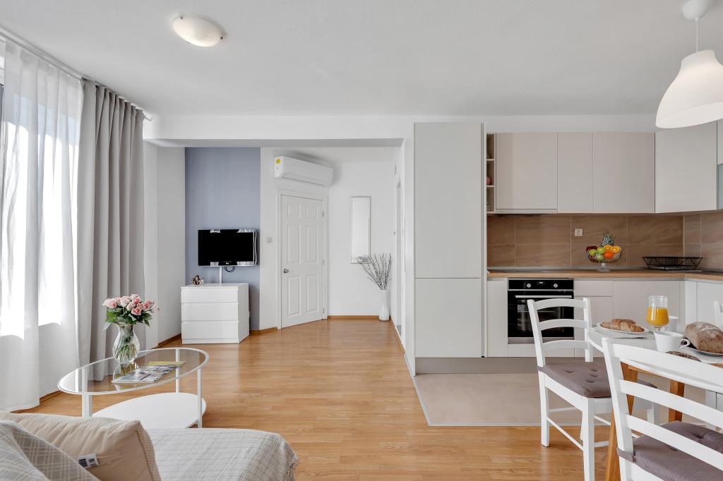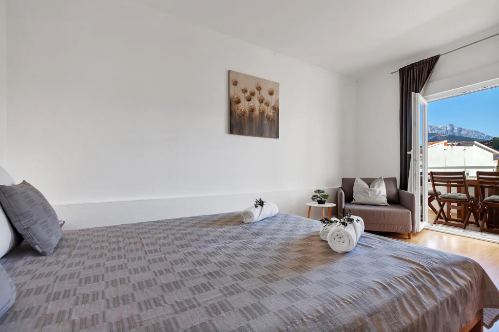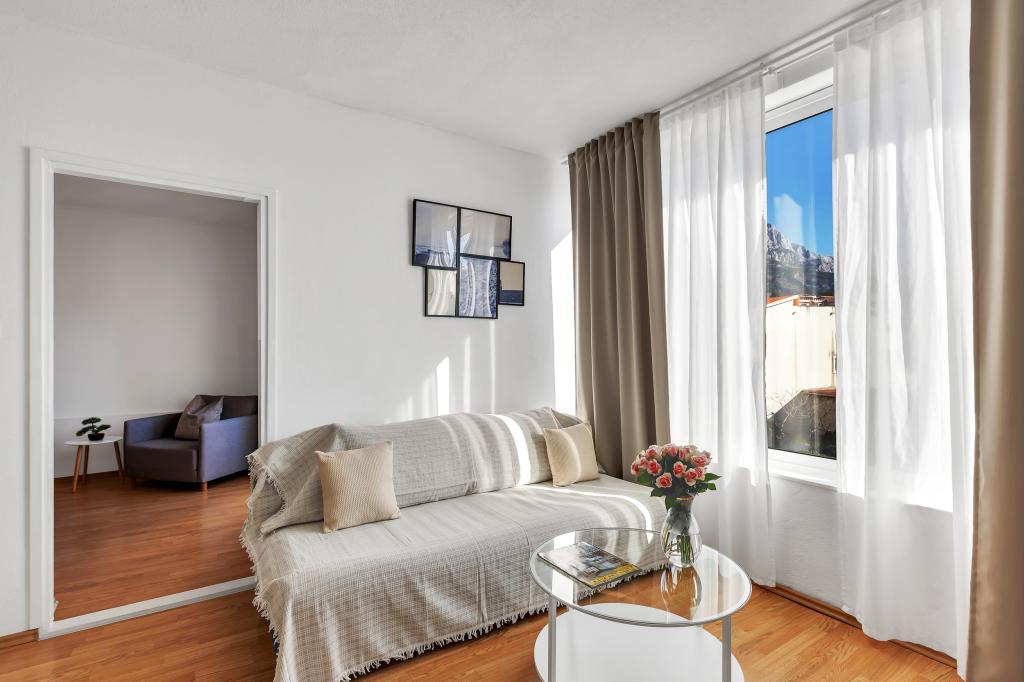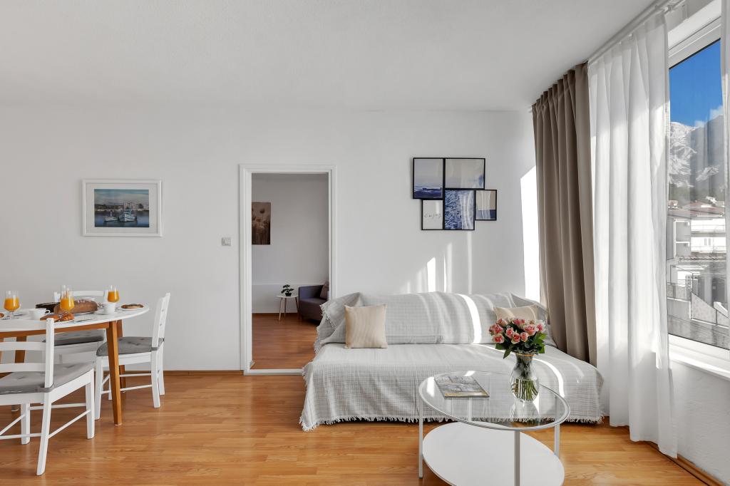 Apartman Bonaca je smješten u samom centru Baške Vode što mu omogućava blizinu i dostupnost raznim sadržajima i uslugama kao što su: plaža (40m), ljekarna (20m), riblji restoran (20m), malakološki muzej (20m), ambulanta (50m), tržnica (20m), supermarket (20m) i ostali restorani i kafići u krugu od 100 do 200m. Apartman se nalazi u mirnom dijelu samog centra pogodan za obitelji s djecom ili mlade parove, koji žele mir i komfor. Sastoji se od jedne kupaonice , jednog prostranog dnevnog boravka, velike opremljene kuhinje sa blagovaonicom i stolom za pet osoba, jedne spavaće sobe iz koje se izlazi na balkon na kojem je smještena velika drvena garnitura sa pogledom na planinu Biokovo. Uz apartman također imamo besplatan privatni parking za goste udaljen 80m, koji je pod video nadzorom kako bismo pružili maksimalnu sigurnost našim gostima. Apartman je uređen i renoviran minimalistički, a svojim bojama i izborom unutarnjeg interijera osvježava cijeli prostor, što čini Vaš boravak ugodnijim.