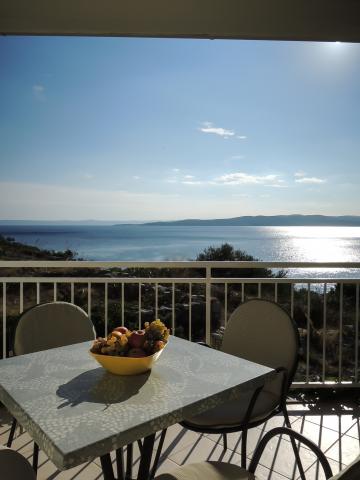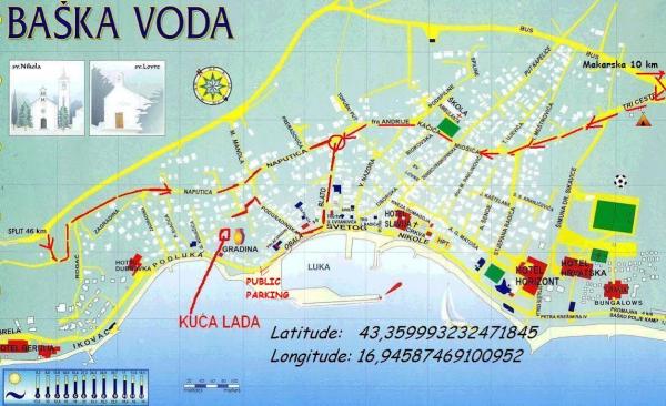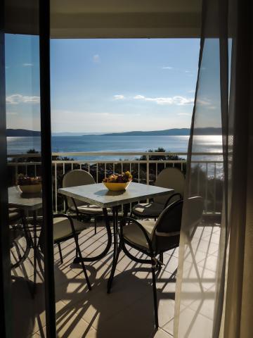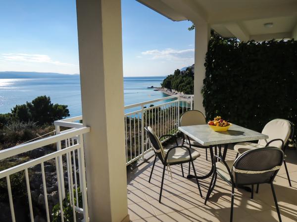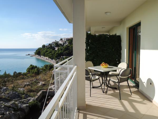 Apartmani s prekrasnim pogledom na more, plau i otoke, se nalaze na prvom katu kuće smještene u mirnom predjelu Baške Vode na malom brežuljku zvanom Gradina 20 m nadmorske visine i 30 m zračne udaljenosti od mora, 2 -3 minute od najljepše šljunčane plaže i 5 minuta od centra Baške Vode. Privatno parkiralište se nalazi ispred kuće.