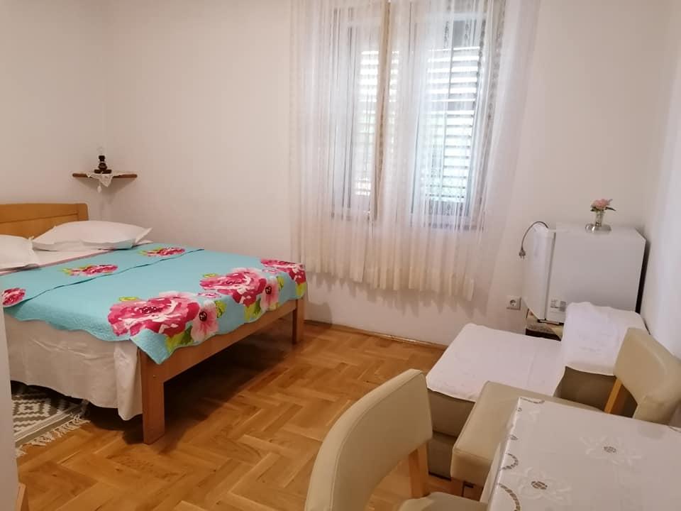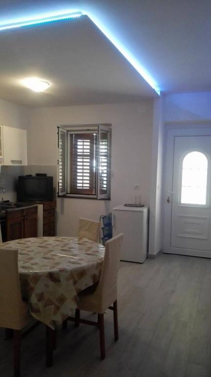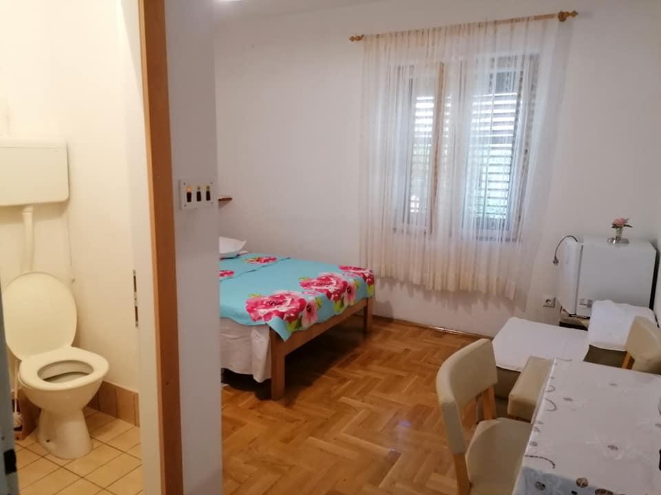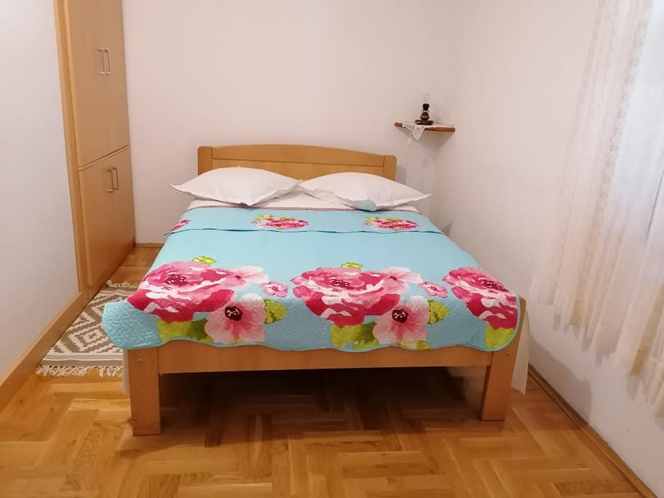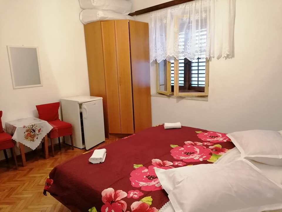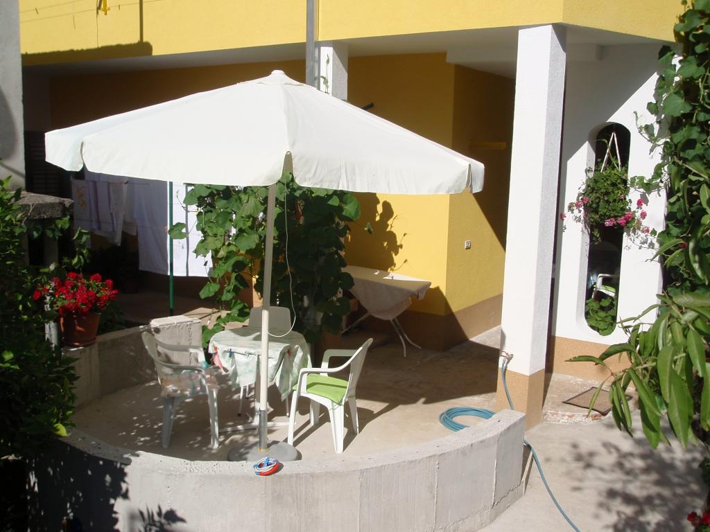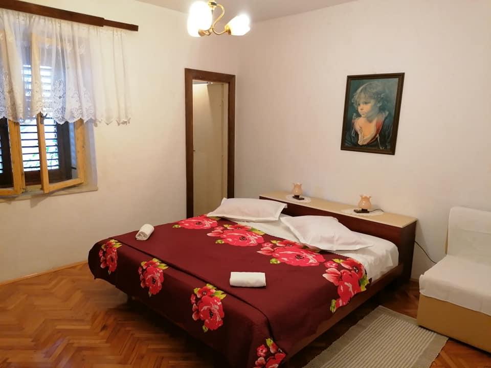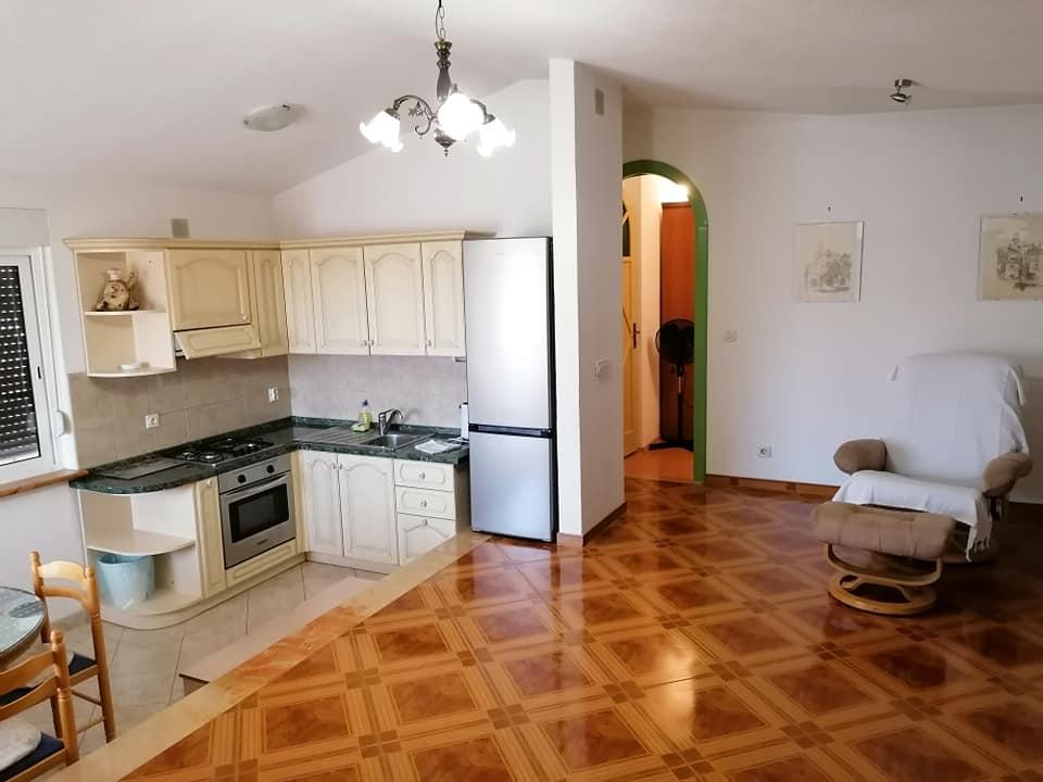 . Apartman, Smještajna jedinica je na prvoj etaži. Sadržaj: Dvije spavače sobe – jedna trokrevetna i jedna dvokrevetna – svaka soba ima svoj wc-tuš, tv, klimu, hladnjak. Apartman se sastoji još sa jednom kuhinjom i prostranom terasom /duž. 12 m/. Apartman je kompletno opremljen sa posteljinom, ručnicima, kuhinja sa komplet kuhinjskim servisom, wi-fi, rezervirani parking. Udaljenost od plaže je 150 m. Pošto se apartman nalazi u centru mjesta svi potrebni uslužni objekti kao; restorani, caffe bar, hoteli, razne terase, banka, pošta, ambulanta, itd…, se nalaze od 50 do max. 200 m. Gostu možemo dodatno ponuditi bicikle za rekreaciju, brod od 7 m sa skiperom za jednodnevne izlete na zanimljive destinacije i fishing kao i razne turističke informacije za vrijeme boravka. Domaćin na raspolaganju.