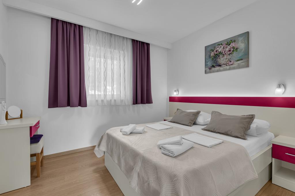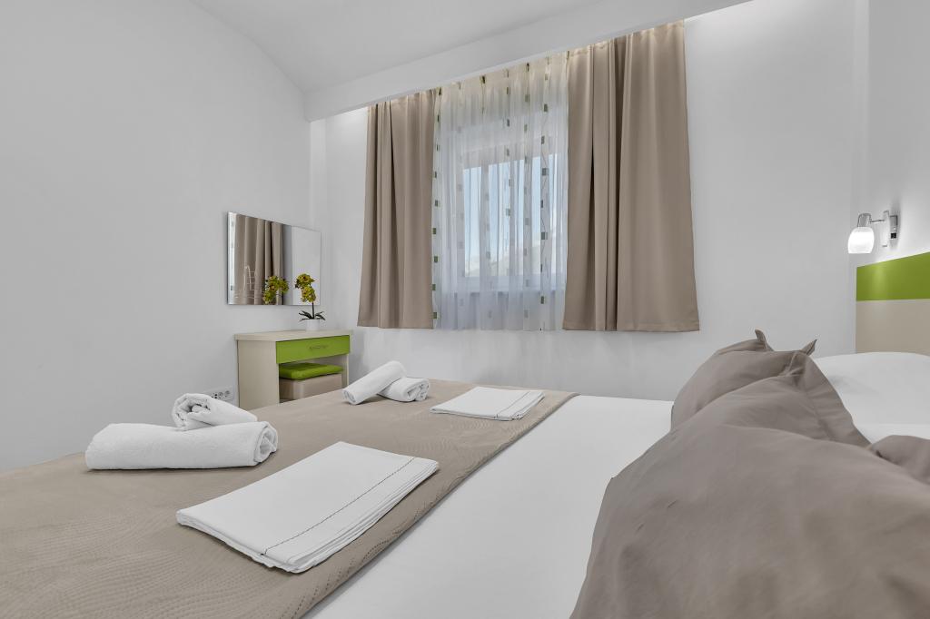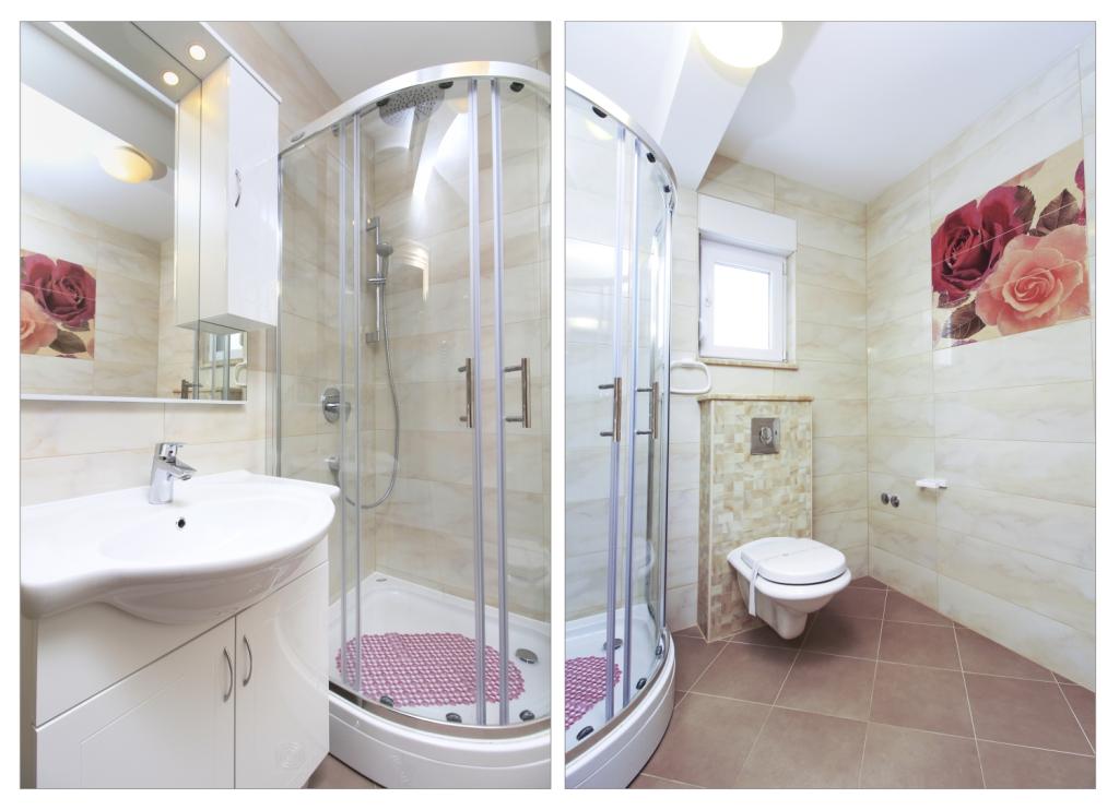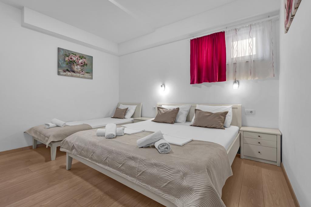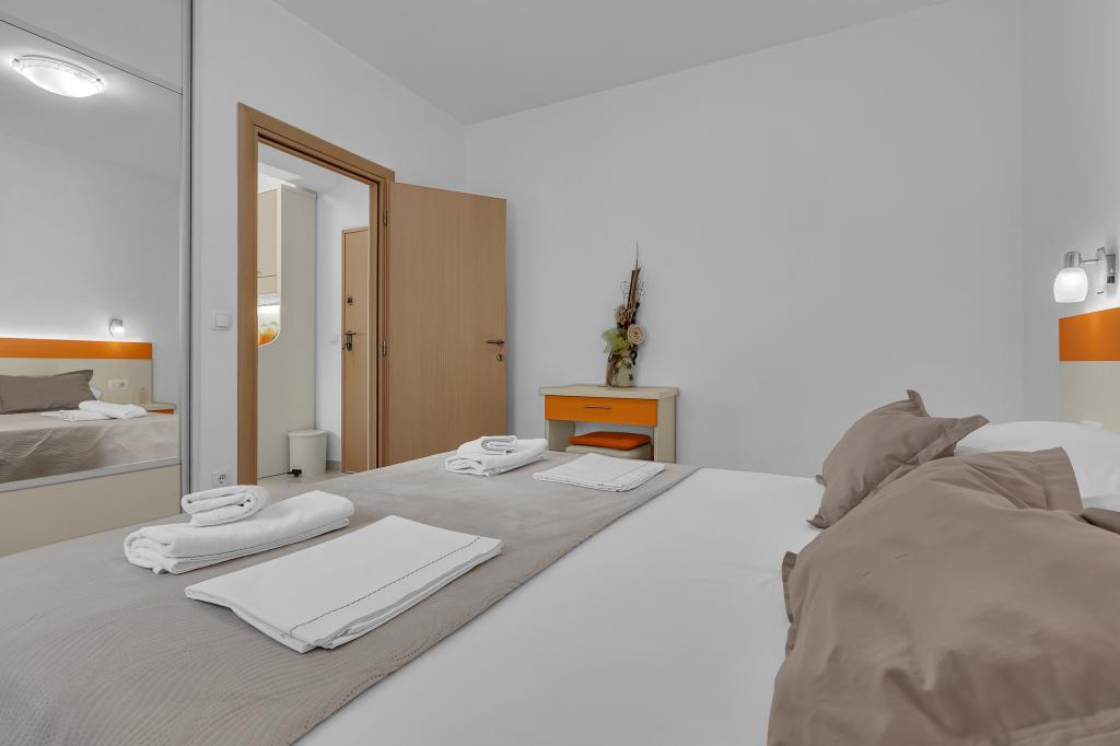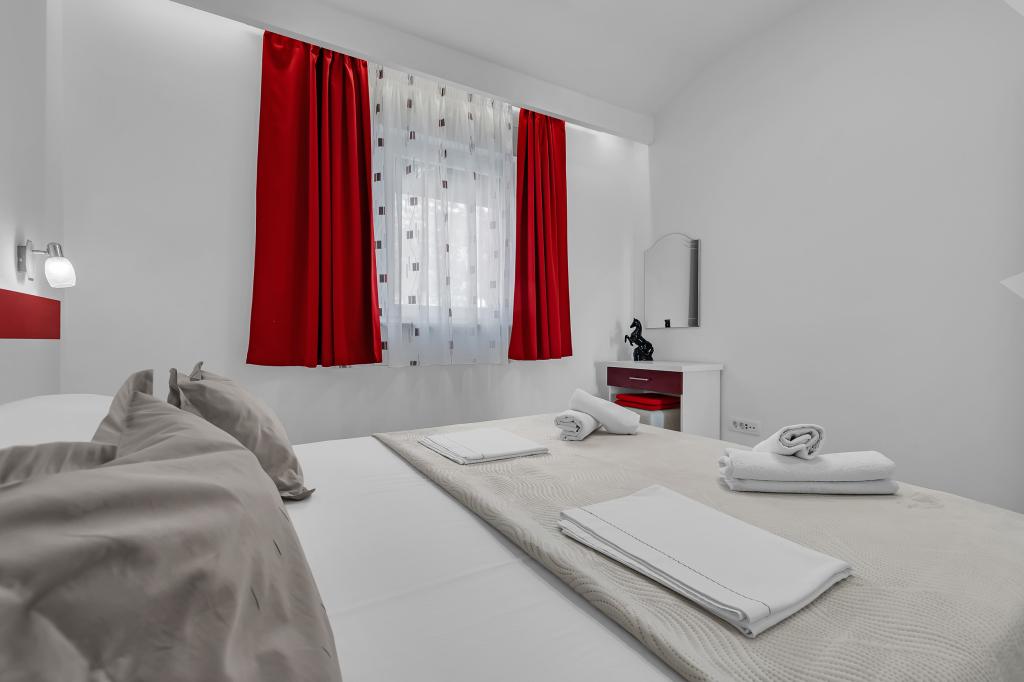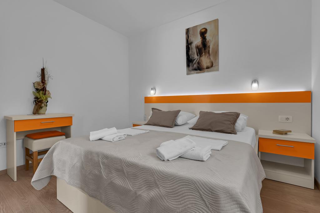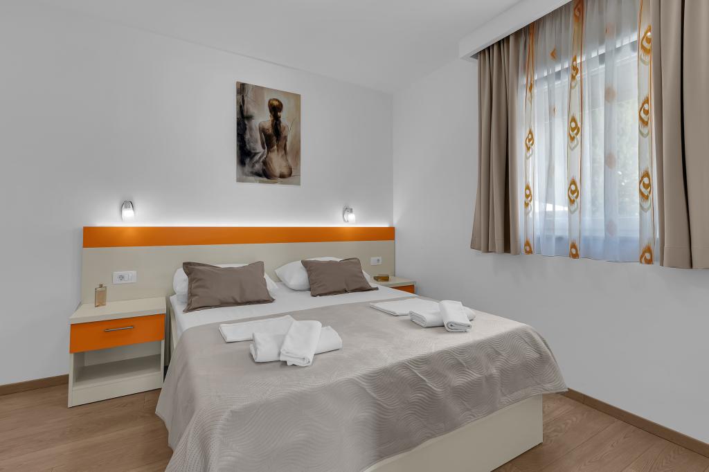 NOVI APARTMANI ! Svi naši apartmani su moderno opremljeni. Ukupno imamo za ponuditi šest ( 6 ) apartmana, od kojih pet ( 5 ) jednosobnih, i jedan dvoetažni - dvosobni. U dvorištu se nalazi mali bazen za goste, a) Jednosobni apartmani ( 2 odrasli i 2 djece ) imaju : soba sa bračnim krevetom, veliko kupatilo sa velikom tuš kadom, potpuno opremljenom modernom kuhinjom sa trpezarijom i sa dnevnim boravkom u kojem se nalazi klimatizacija i udoban kauč na razvlačenje za dvoje odrasle djece, kao i wi-fi Internet. Kod svakog ovog apartmana se iz dnevnog boravka izlazi na veliki balkon od 9 m2. b) Dvosobni, dvoetažni apartman 4 ( 4 odrasih i 2 djece) ima na prvoj etaži modernu sobu sa bračnim krevetom i jedno kupatilo sa tušem i sa wc-om, kompletnu kuhinju sa trpezarijom i dnevni boravak koji ima udoban kauč na razvlačenje za dvoje odrasle djece. U drugu etažu se silazi zavojitim stubama, sa velikom sobom, kupatilom i posebnim wc-om. . Obje etaže su klimatizirane
