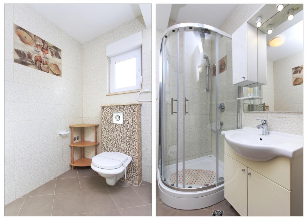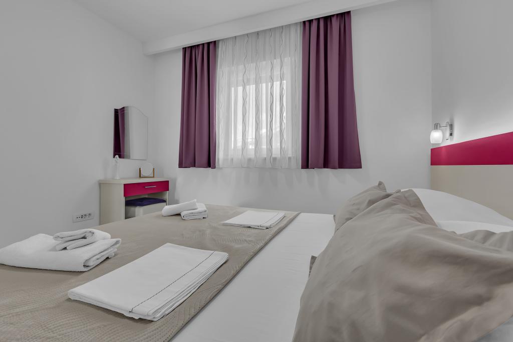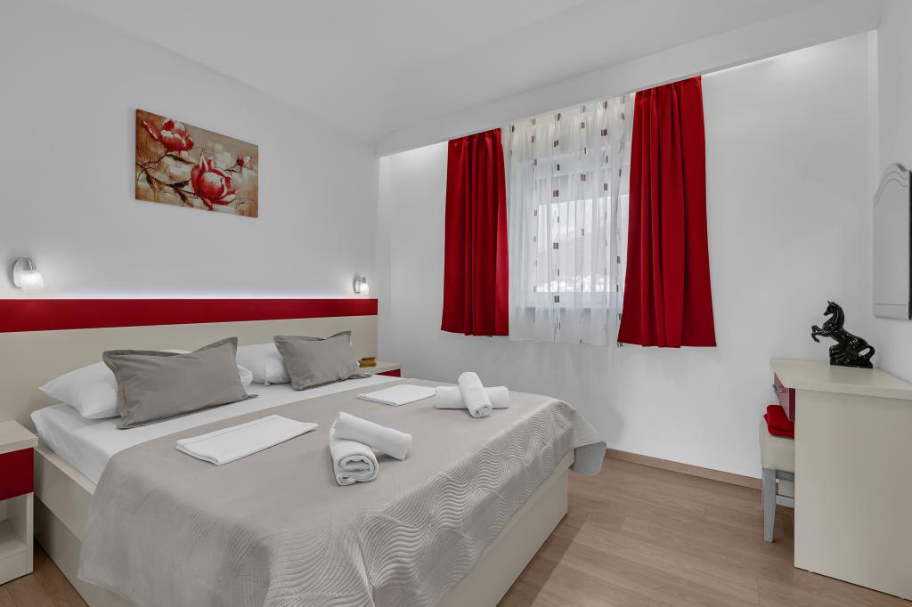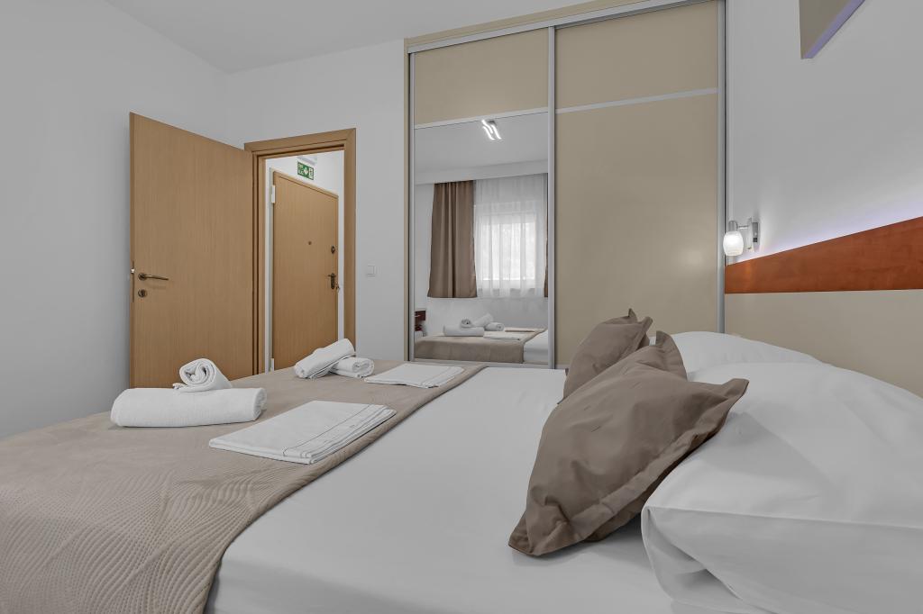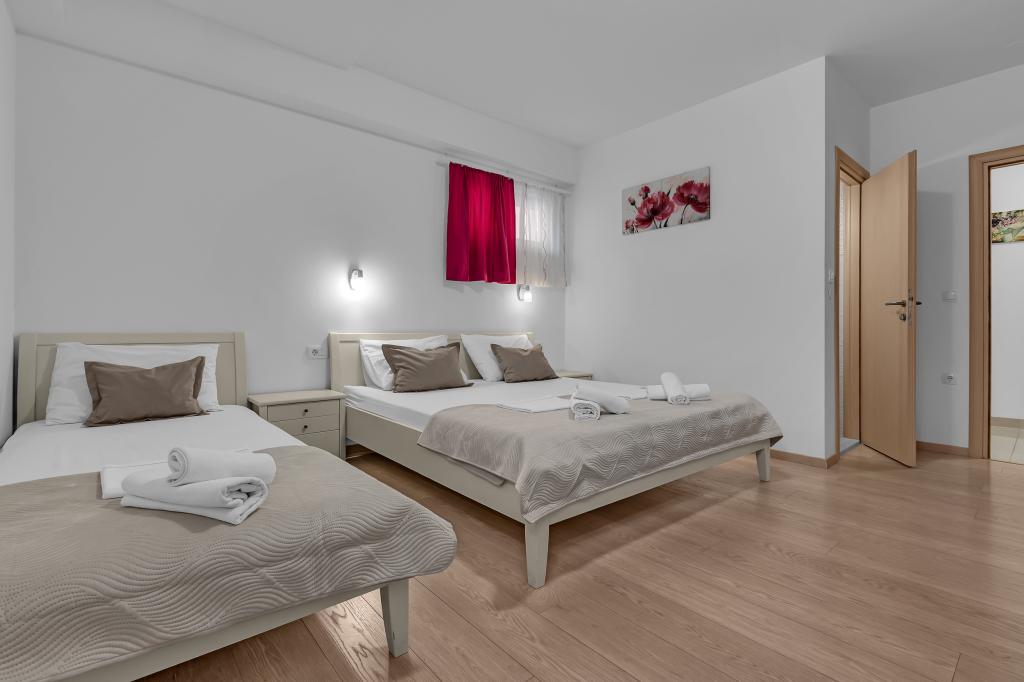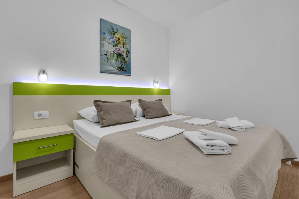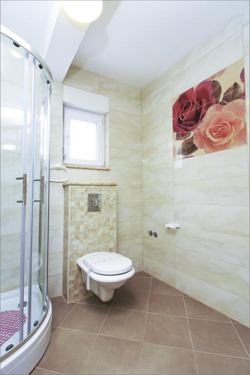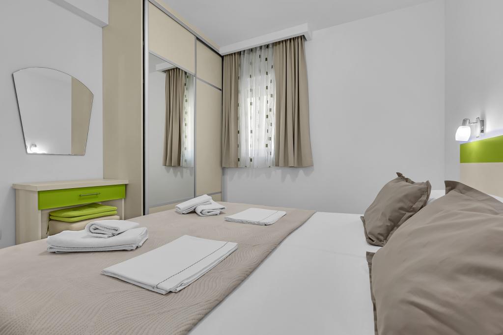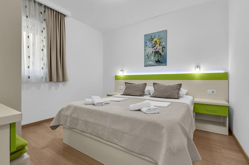NOVI APARTMANI ! Svi naši apartmani su moderno opremljeni. Ukupno imamo za ponuditi šest ( 6 ) apartmana, od kojih pet ( 5 ) jednosobnih, i jedan dvoetažni - dvosobni. U dvorištu se nalazi mali bazen za goste, a) Jednosobni apartmani ( 2 odrasli i 2 djece ) imaju : soba sa bračnim krevetom, veliko kupatilo sa velikom tuš kadom, potpuno opremljenom modernom kuhinjom sa trpezarijom i sa dnevnim boravkom u kojem se nalazi klimatizacija i udoban kauč na razvlačenje za dvoje odrasle djece, kao i wi-fi Internet. Kod svakog ovog apartmana se iz dnevnog boravka izlazi na veliki balkon od 9 m2. b) Dvosobni, dvoetažni apartman 4 ( 4 odrasih i 2 djece) ima na prvoj etaži modernu sobu sa bračnim krevetom i jedno kupatilo sa tušem i sa wc-om, kompletnu kuhinju sa trpezarijom i dnevni boravak koji ima udoban kauč na razvlačenje za dvoje odrasle djece. U drugu etažu se silazi zavojitim stubama, sa velikom sobom, kupatilom i posebnim wc-om. . Obje etaže su klimatizirane