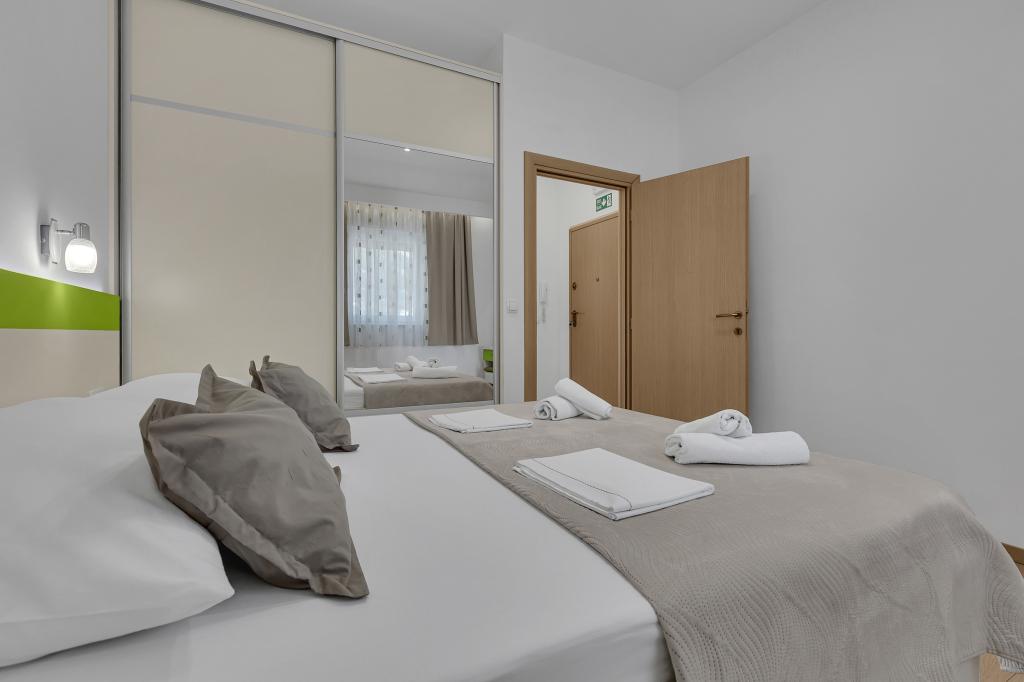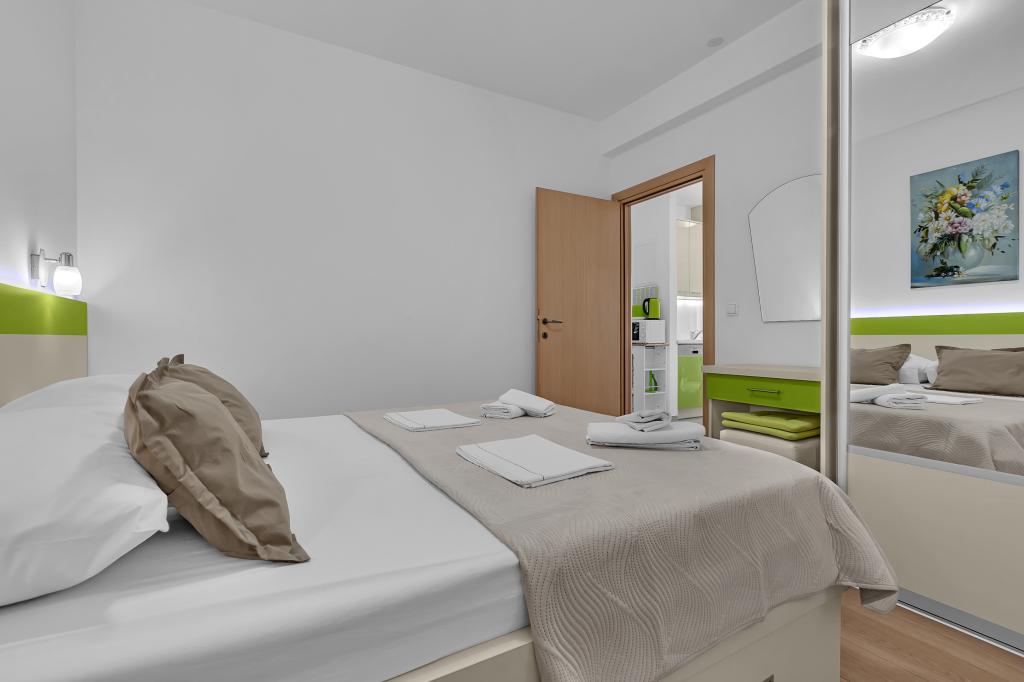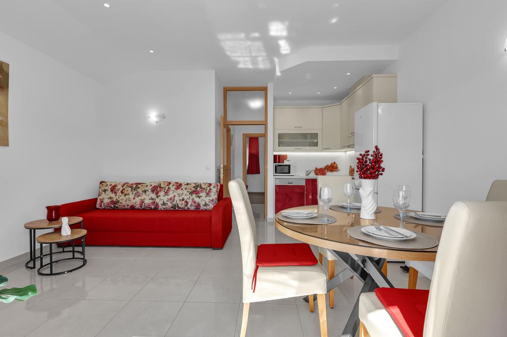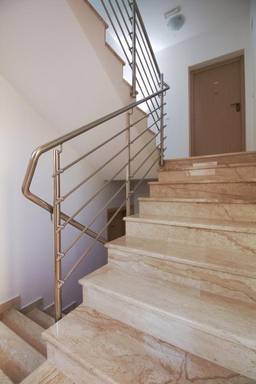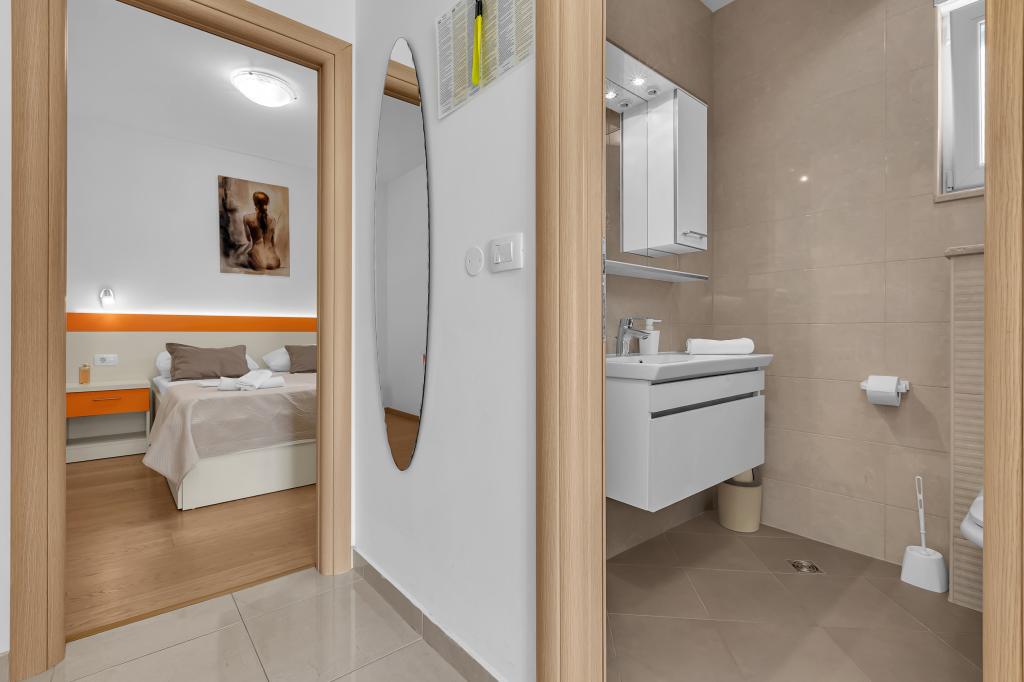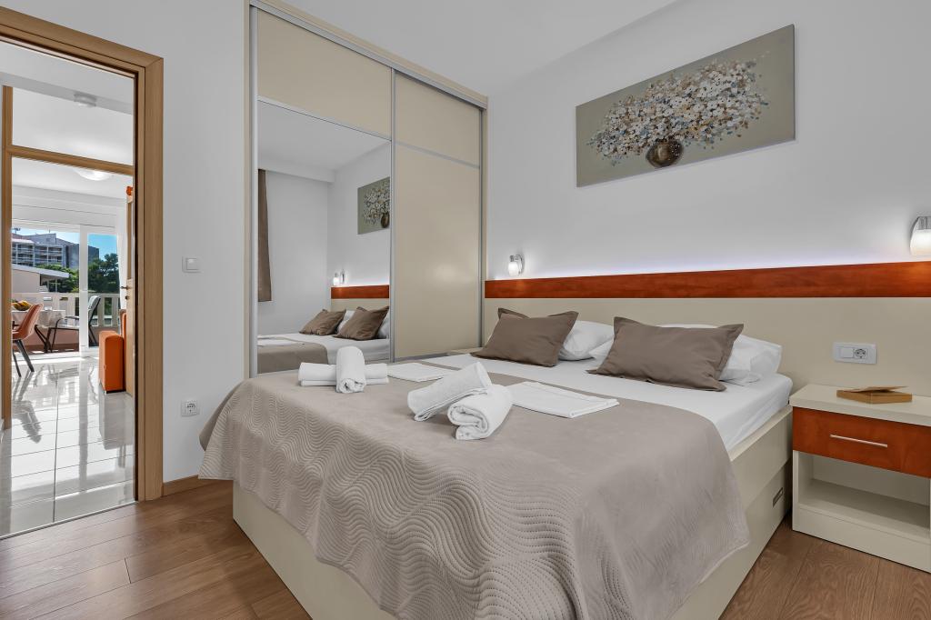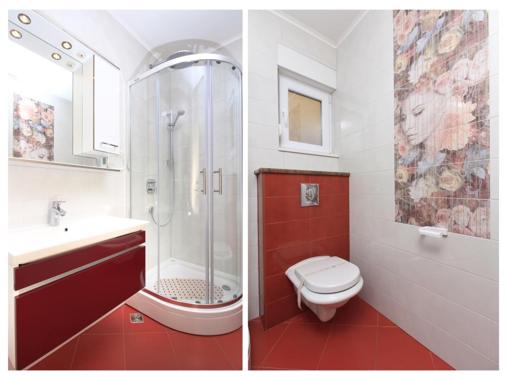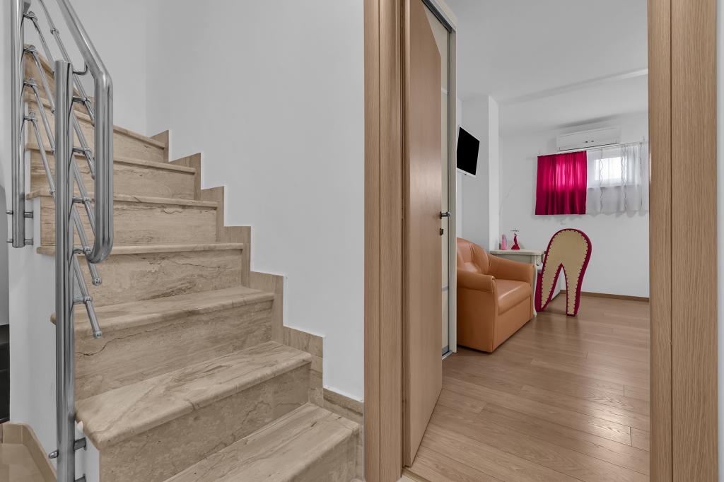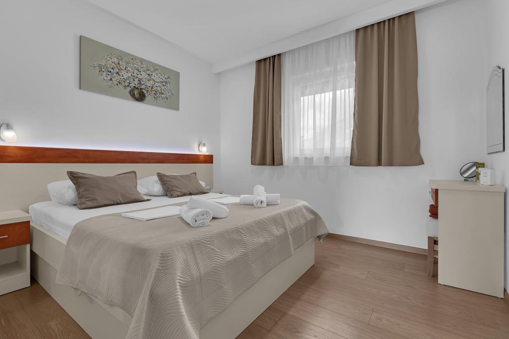 NOVI APARTMANI ! Svi naši apartmani su moderno opremljeni. Ukupno imamo za ponuditi šest ( 6 ) apartmana, od kojih pet ( 5 ) jednosobnih, i jedan dvoetažni - dvosobni. U dvorištu se nalazi mali bazen za goste, a) Jednosobni apartmani ( 2 odrasli i 2 djece ) imaju : soba sa bračnim krevetom, veliko kupatilo sa velikom tuš kadom, potpuno opremljenom modernom kuhinjom sa trpezarijom i sa dnevnim boravkom u kojem se nalazi klimatizacija i udoban kauč na razvlačenje za dvoje odrasle djece, kao i wi-fi Internet. Kod svakog ovog apartmana se iz dnevnog boravka izlazi na veliki balkon od 9 m2. b) Dvosobni, dvoetažni apartman 4 ( 4 odrasih i 2 djece) ima na prvoj etaži modernu sobu sa bračnim krevetom i jedno kupatilo sa tušem i sa wc-om, kompletnu kuhinju sa trpezarijom i dnevni boravak koji ima udoban kauč na razvlačenje za dvoje odrasle djece. U drugu etažu se silazi zavojitim stubama, sa velikom sobom, kupatilom i posebnim wc-om. . Obje etaže su klimatizirane