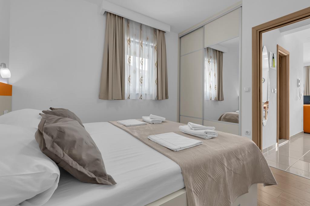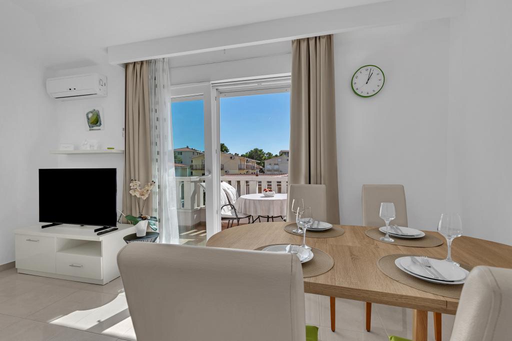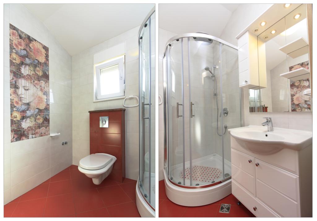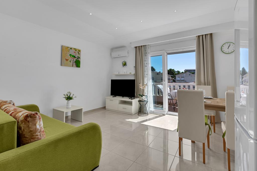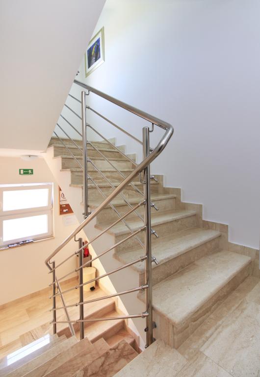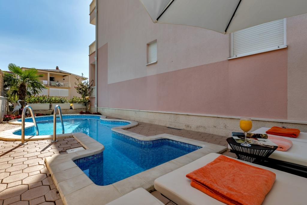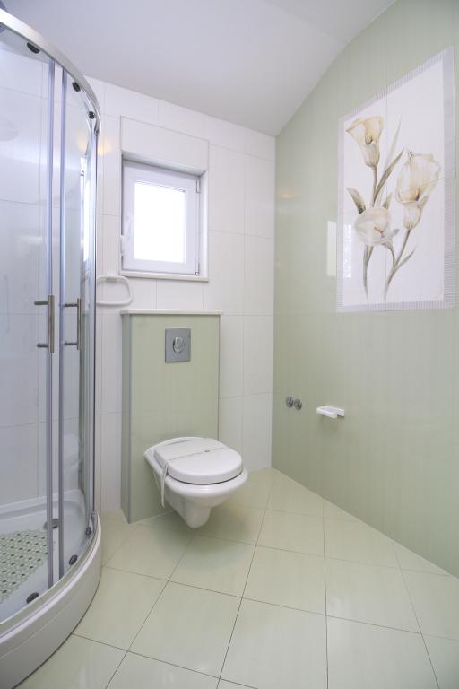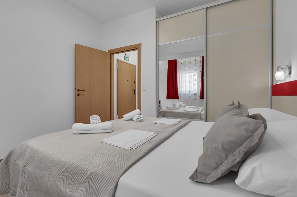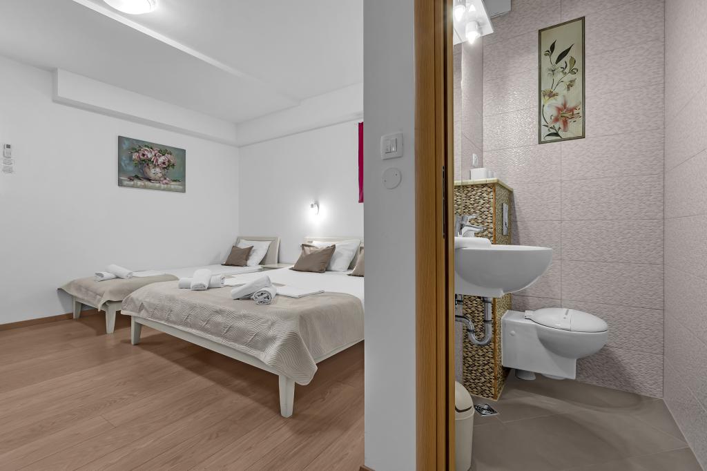 NOVI APARTMANI ! Svi naši apartmani su moderno opremljeni. Ukupno imamo za ponuditi šest ( 6 ) apartmana, od kojih pet ( 5 ) jednosobnih, i jedan dvoetažni - dvosobni. U dvorištu se nalazi mali bazen za goste, a) Jednosobni apartmani ( 2 odrasli i 2 djece ) imaju : soba sa bračnim krevetom, veliko kupatilo sa velikom tuš kadom, potpuno opremljenom modernom kuhinjom sa trpezarijom i sa dnevnim boravkom u kojem se nalazi klimatizacija i udoban kauč na razvlačenje za dvoje odrasle djece, kao i wi-fi Internet. Kod svakog ovog apartmana se iz dnevnog boravka izlazi na veliki balkon od 9 m2. b) Dvosobni, dvoetažni apartman 4 ( 4 odrasih i 2 djece) ima na prvoj etaži modernu sobu sa bračnim krevetom i jedno kupatilo sa tušem i sa wc-om, kompletnu kuhinju sa trpezarijom i dnevni boravak koji ima udoban kauč na razvlačenje za dvoje odrasle djece. U drugu etažu se silazi zavojitim stubama, sa velikom sobom, kupatilom i posebnim wc-om. . Obje etaže su klimatizirane