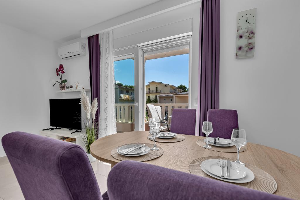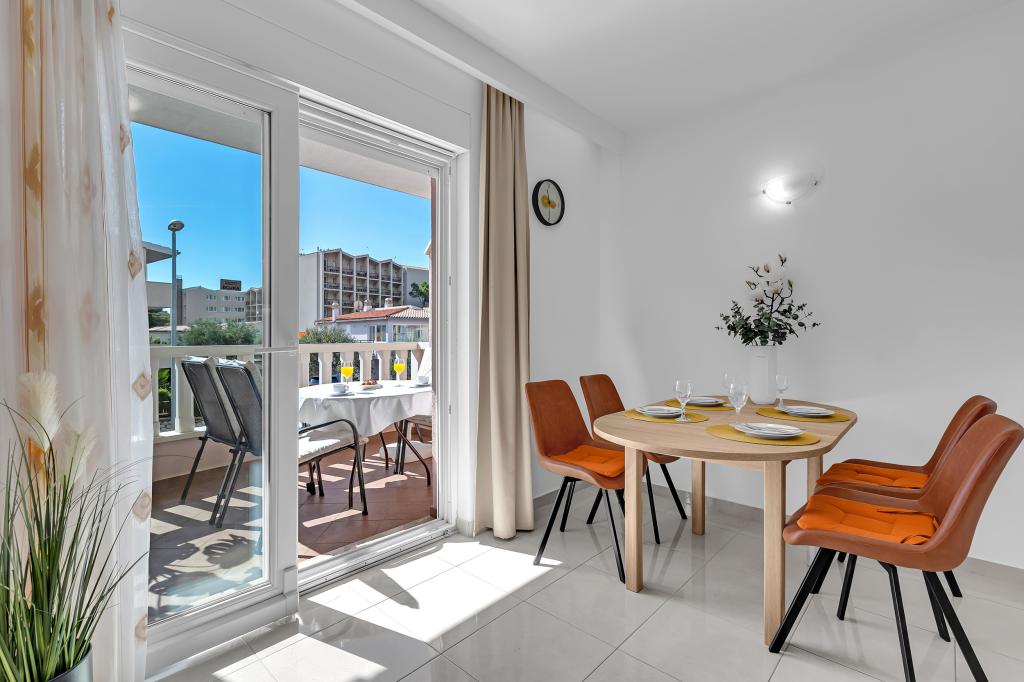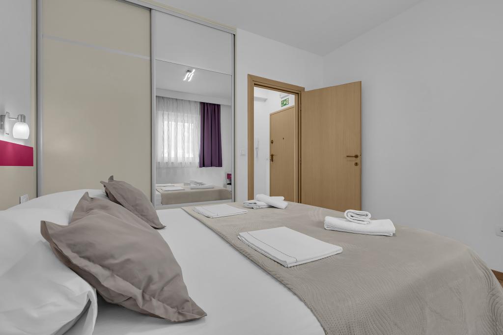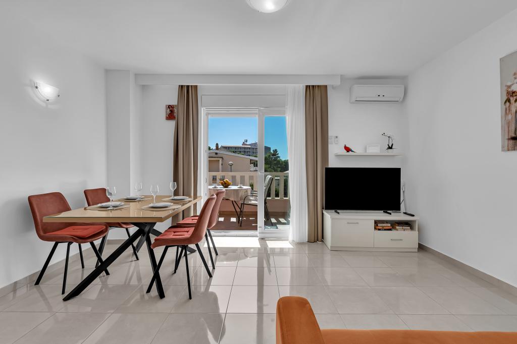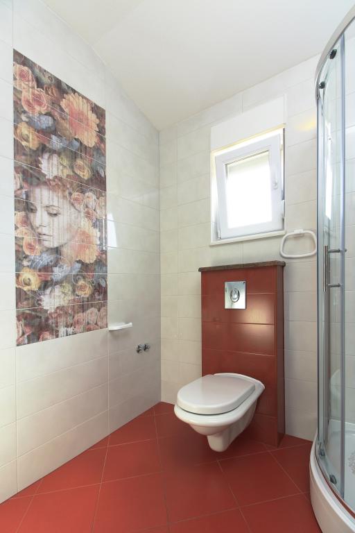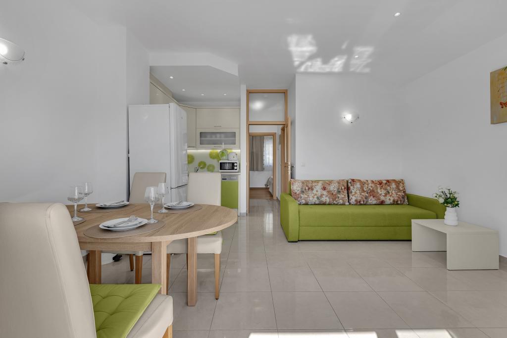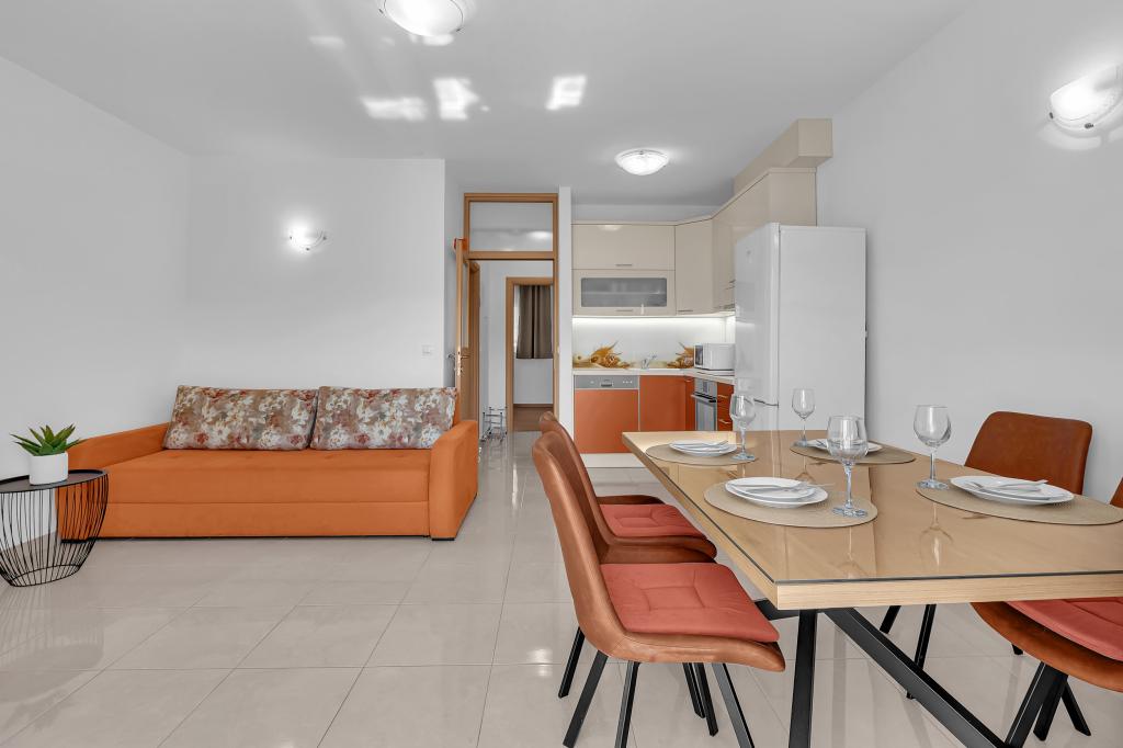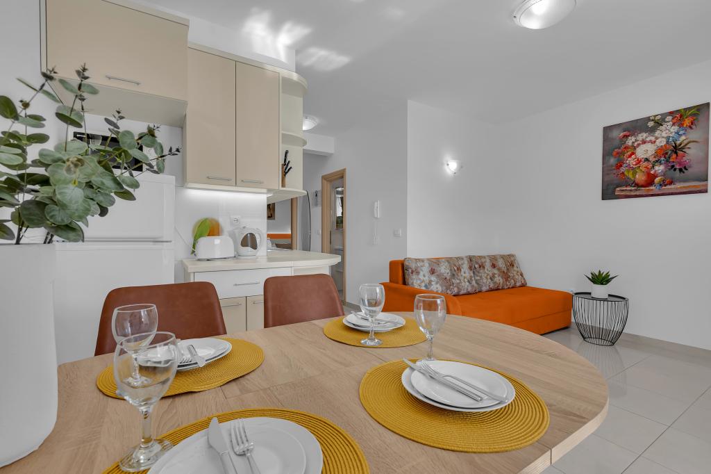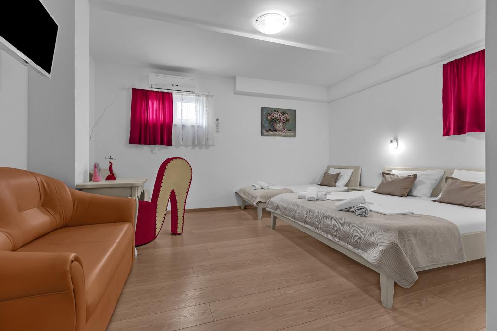 NOVI APARTMANI ! Svi naši apartmani su moderno opremljeni. Ukupno imamo za ponuditi šest ( 6 ) apartmana, od kojih pet ( 5 ) jednosobnih, i jedan dvoetažni - dvosobni. U dvorištu se nalazi mali bazen za goste, a) Jednosobni apartmani ( 2 odrasli i 2 djece ) imaju : soba sa bračnim krevetom, veliko kupatilo sa velikom tuš kadom, potpuno opremljenom modernom kuhinjom sa trpezarijom i sa dnevnim boravkom u kojem se nalazi klimatizacija i udoban kauč na razvlačenje za dvoje odrasle djece, kao i wi-fi Internet. Kod svakog ovog apartmana se iz dnevnog boravka izlazi na veliki balkon od 9 m2. b) Dvosobni, dvoetažni apartman 4 ( 4 odrasih i 2 djece) ima na prvoj etaži modernu sobu sa bračnim krevetom i jedno kupatilo sa tušem i sa wc-om, kompletnu kuhinju sa trpezarijom i dnevni boravak koji ima udoban kauč na razvlačenje za dvoje odrasle djece. U drugu etažu se silazi zavojitim stubama, sa velikom sobom, kupatilom i posebnim wc-om. . Obje etaže su klimatizirane