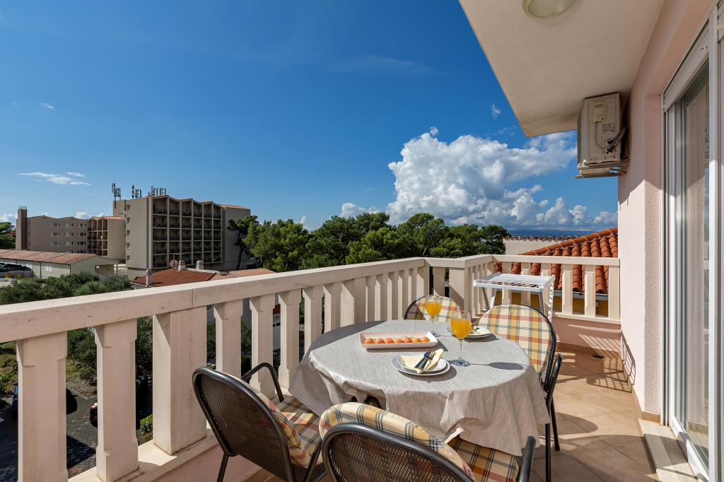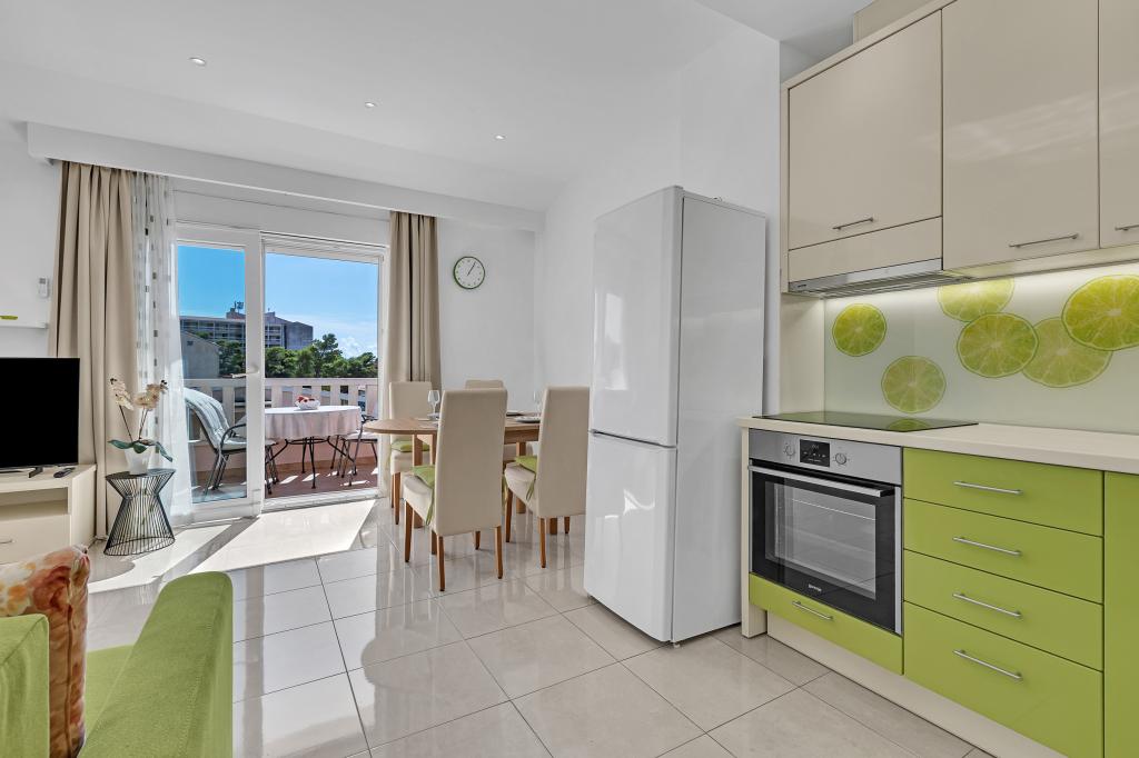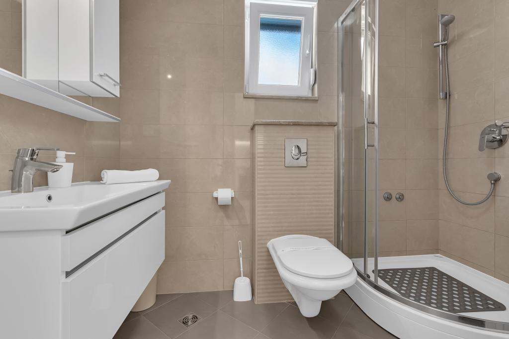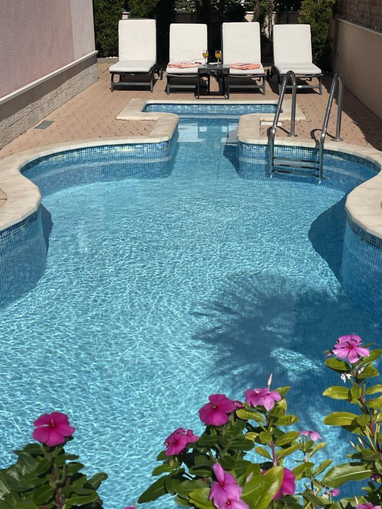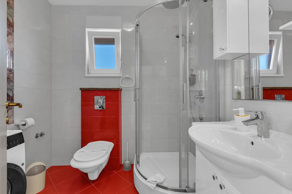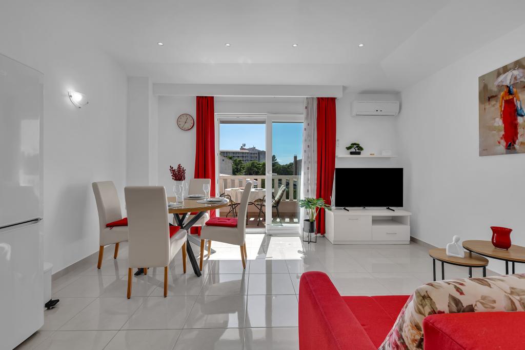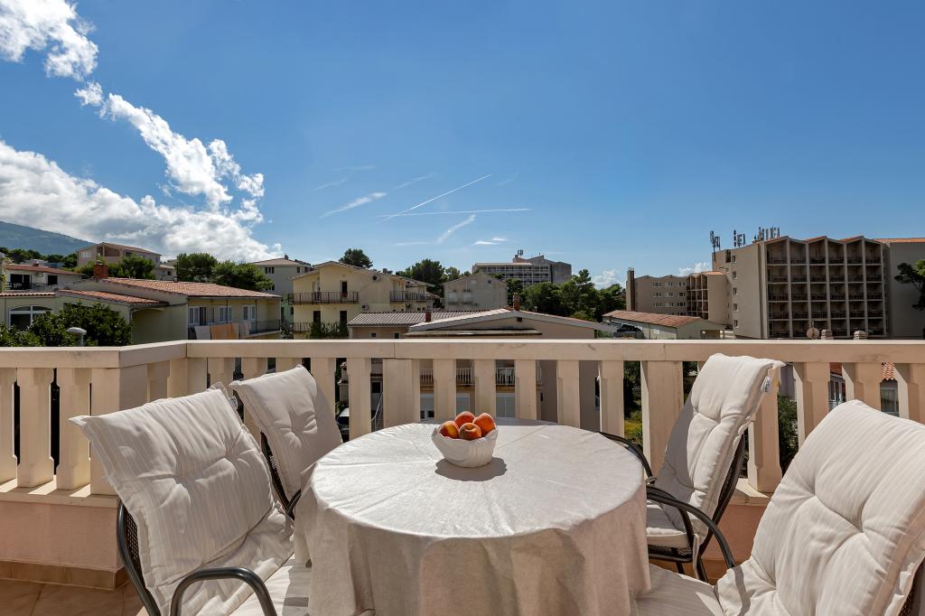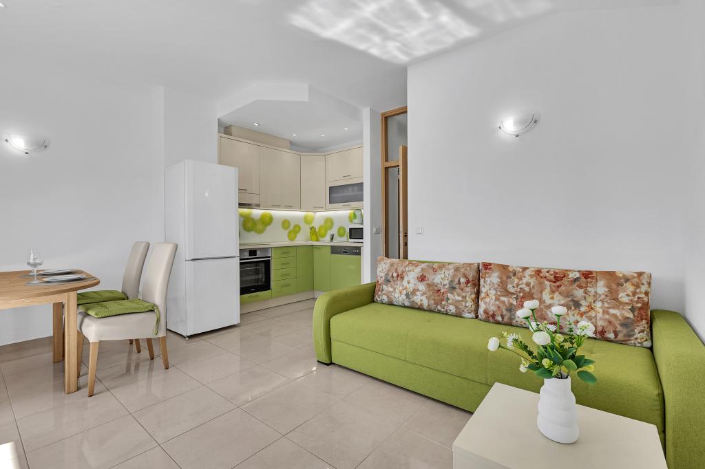 NOVI APARTMANI ! Svi naši apartmani su moderno opremljeni. Ukupno imamo za ponuditi šest ( 6 ) apartmana, od kojih pet ( 5 ) jednosobnih, i jedan dvoetažni - dvosobni. U dvorištu se nalazi mali bazen za goste, a) Jednosobni apartmani ( 2 odrasli i 2 djece ) imaju : soba sa bračnim krevetom, veliko kupatilo sa velikom tuš kadom, potpuno opremljenom modernom kuhinjom sa trpezarijom i sa dnevnim boravkom u kojem se nalazi klimatizacija i udoban kauč na razvlačenje za dvoje odrasle djece, kao i wi-fi Internet. Kod svakog ovog apartmana se iz dnevnog boravka izlazi na veliki balkon od 9 m2. b) Dvosobni, dvoetažni apartman 4 ( 4 odrasih i 2 djece) ima na prvoj etaži modernu sobu sa bračnim krevetom i jedno kupatilo sa tušem i sa wc-om, kompletnu kuhinju sa trpezarijom i dnevni boravak koji ima udoban kauč na razvlačenje za dvoje odrasle djece. U drugu etažu se silazi zavojitim stubama, sa velikom sobom, kupatilom i posebnim wc-om. . Obje etaže su klimatizirane