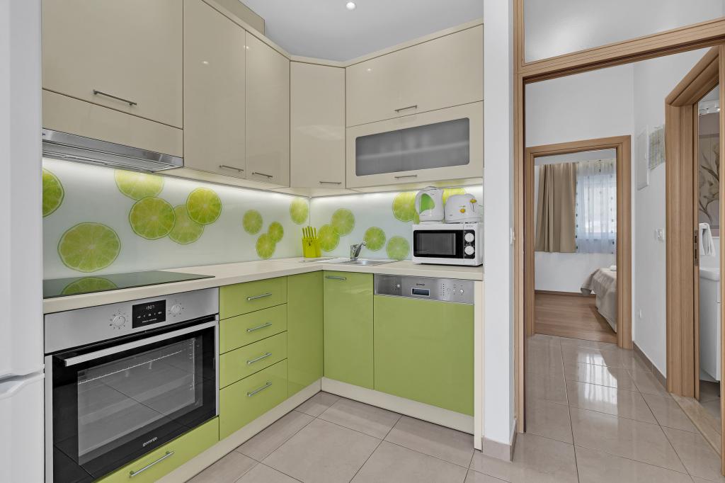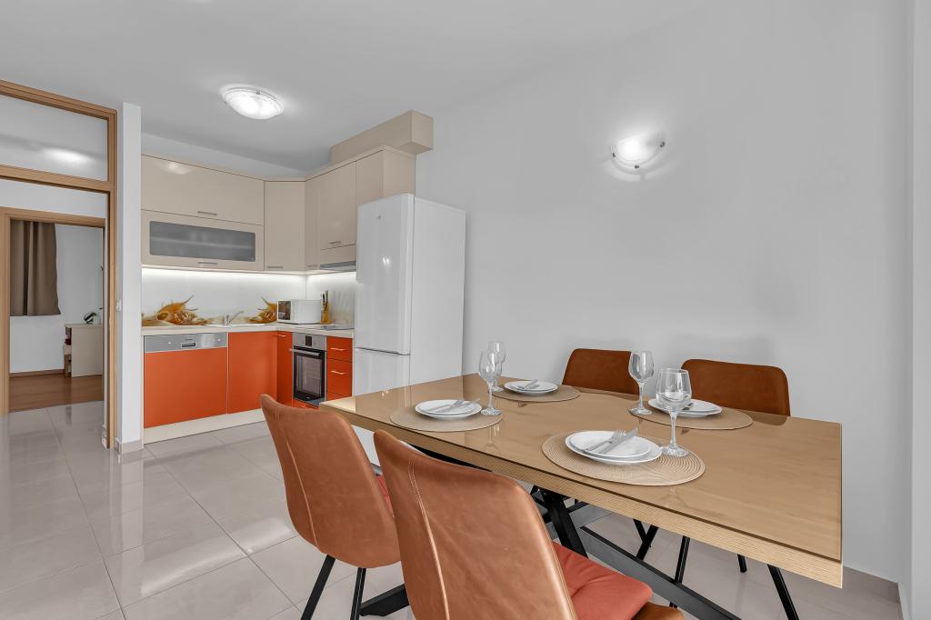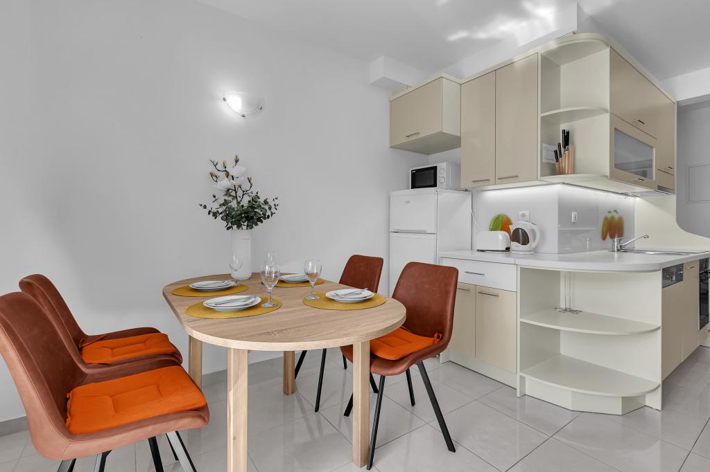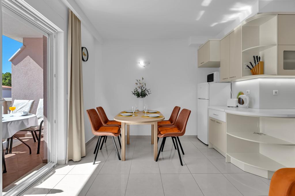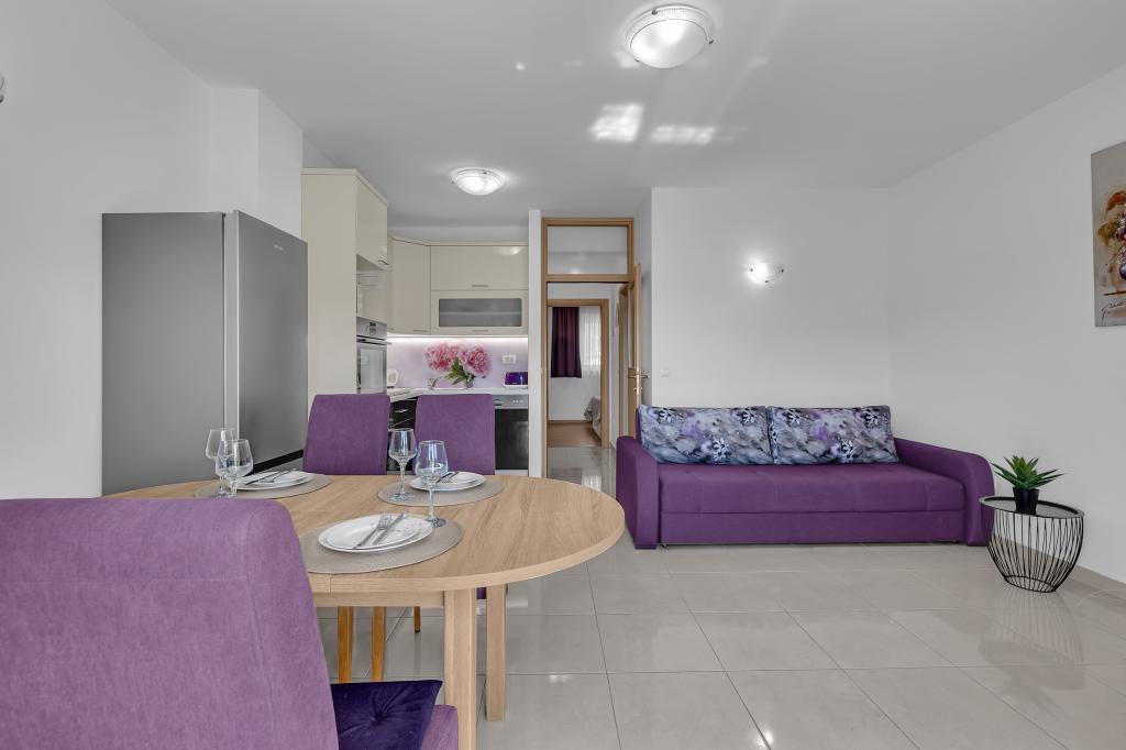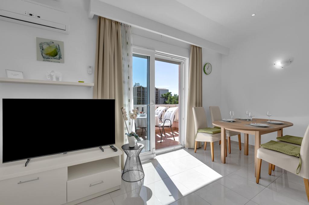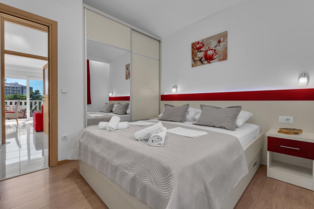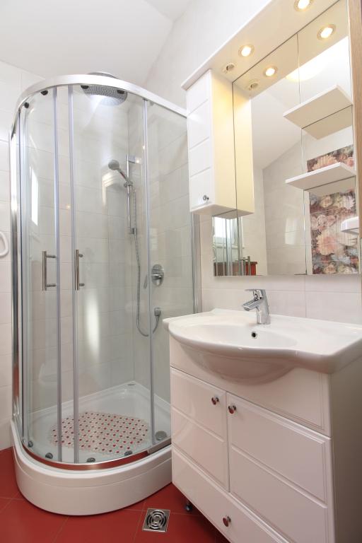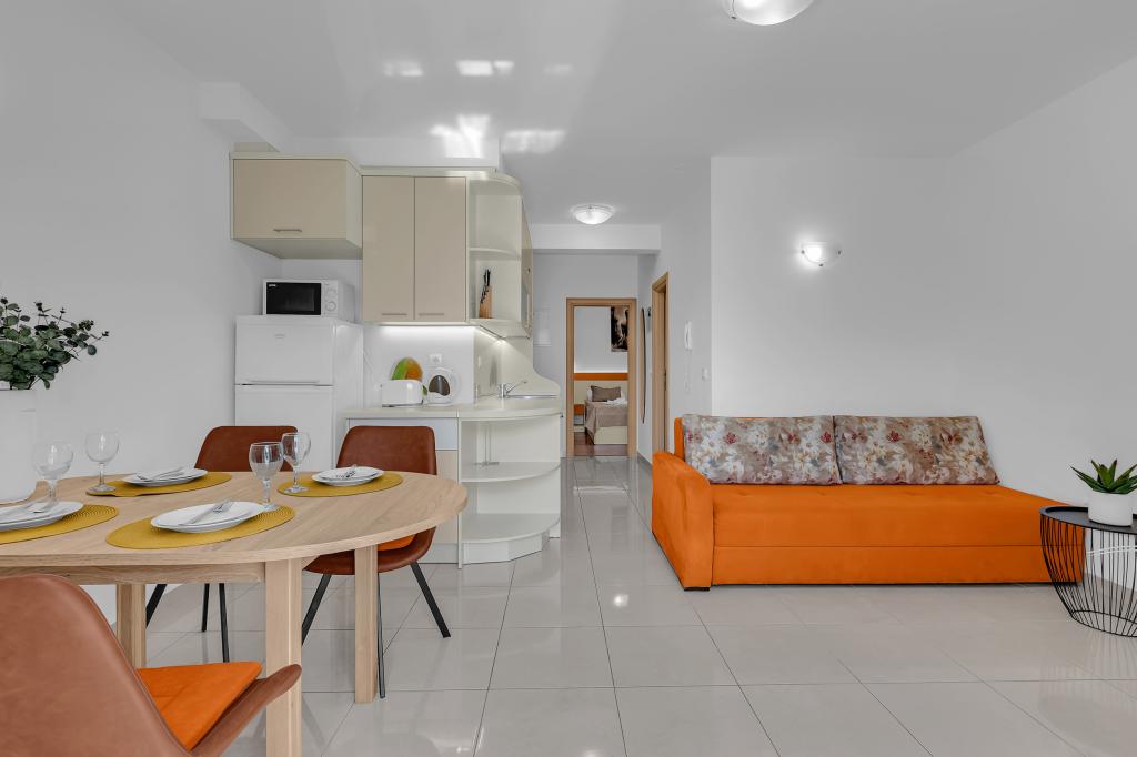 NOVI APARTMANI ! Svi naši apartmani su moderno opremljeni. Ukupno imamo za ponuditi šest ( 6 ) apartmana, od kojih pet ( 5 ) jednosobnih, i jedan dvoetažni - dvosobni. U dvorištu se nalazi mali bazen za goste, a) Jednosobni apartmani ( 2 odrasli i 2 djece ) imaju : soba sa bračnim krevetom, veliko kupatilo sa velikom tuš kadom, potpuno opremljenom modernom kuhinjom sa trpezarijom i sa dnevnim boravkom u kojem se nalazi klimatizacija i udoban kauč na razvlačenje za dvoje odrasle djece, kao i wi-fi Internet. Kod svakog ovog apartmana se iz dnevnog boravka izlazi na veliki balkon od 9 m2. b) Dvosobni, dvoetažni apartman 4 ( 4 odrasih i 2 djece) ima na prvoj etaži modernu sobu sa bračnim krevetom i jedno kupatilo sa tušem i sa wc-om, kompletnu kuhinju sa trpezarijom i dnevni boravak koji ima udoban kauč na razvlačenje za dvoje odrasle djece. U drugu etažu se silazi zavojitim stubama, sa velikom sobom, kupatilom i posebnim wc-om. . Obje etaže su klimatizirane