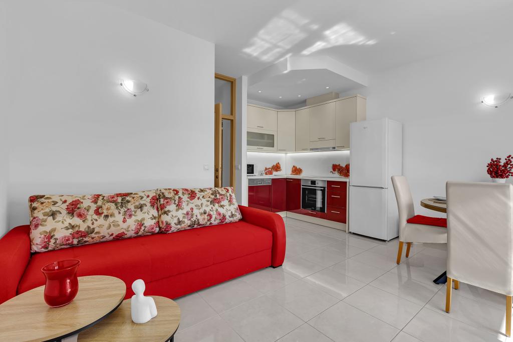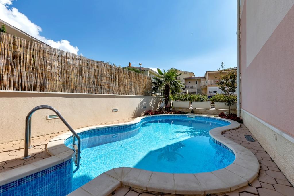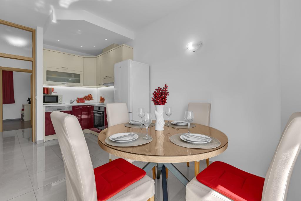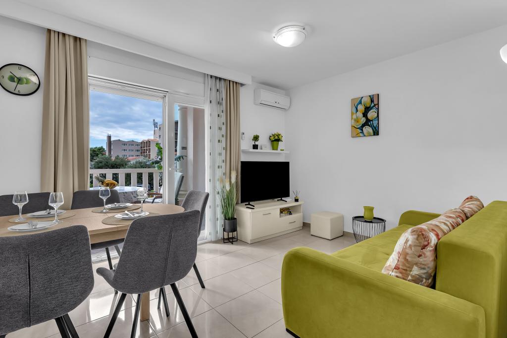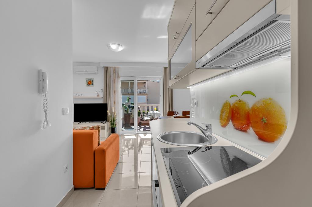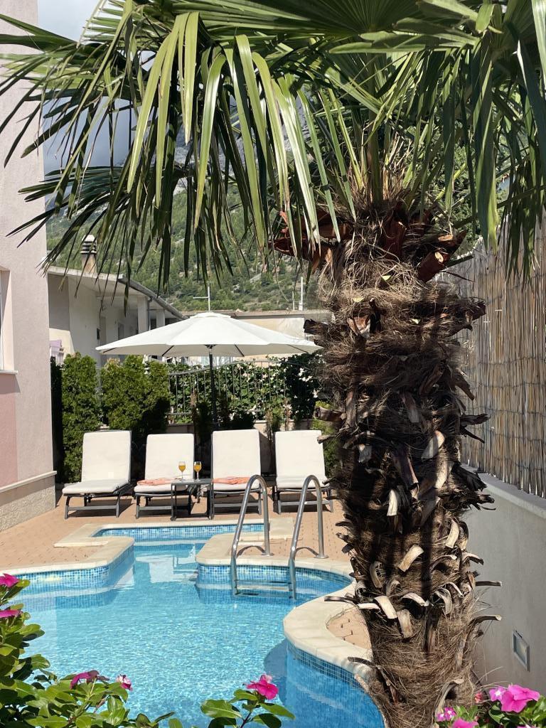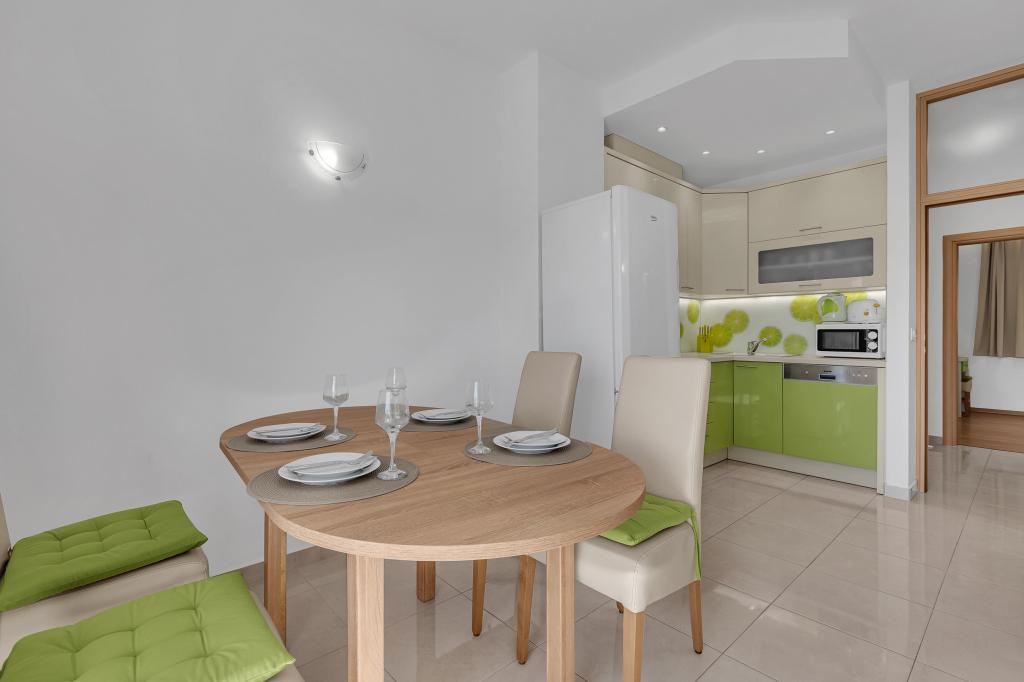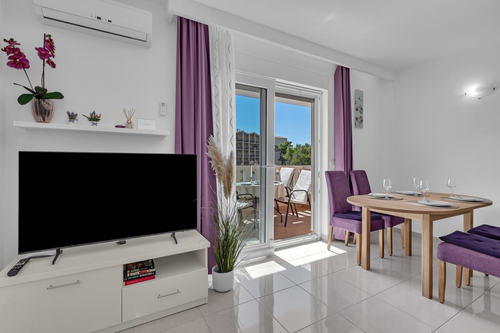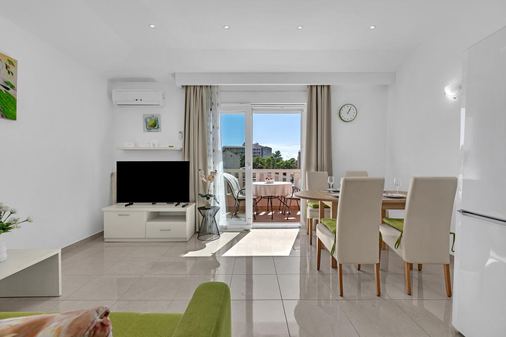 NOVI APARTMANI ! Svi naši apartmani su moderno opremljeni. Ukupno imamo za ponuditi šest ( 6 ) apartmana, od kojih pet ( 5 ) jednosobnih, i jedan dvoetažni - dvosobni. U dvorištu se nalazi mali bazen za goste, a) Jednosobni apartmani ( 2 odrasli i 2 djece ) imaju : soba sa bračnim krevetom, veliko kupatilo sa velikom tuš kadom, potpuno opremljenom modernom kuhinjom sa trpezarijom i sa dnevnim boravkom u kojem se nalazi klimatizacija i udoban kauč na razvlačenje za dvoje odrasle djece, kao i wi-fi Internet. Kod svakog ovog apartmana se iz dnevnog boravka izlazi na veliki balkon od 9 m2. b) Dvosobni, dvoetažni apartman 4 ( 4 odrasih i 2 djece) ima na prvoj etaži modernu sobu sa bračnim krevetom i jedno kupatilo sa tušem i sa wc-om, kompletnu kuhinju sa trpezarijom i dnevni boravak koji ima udoban kauč na razvlačenje za dvoje odrasle djece. U drugu etažu se silazi zavojitim stubama, sa velikom sobom, kupatilom i posebnim wc-om. . Obje etaže su klimatizirane