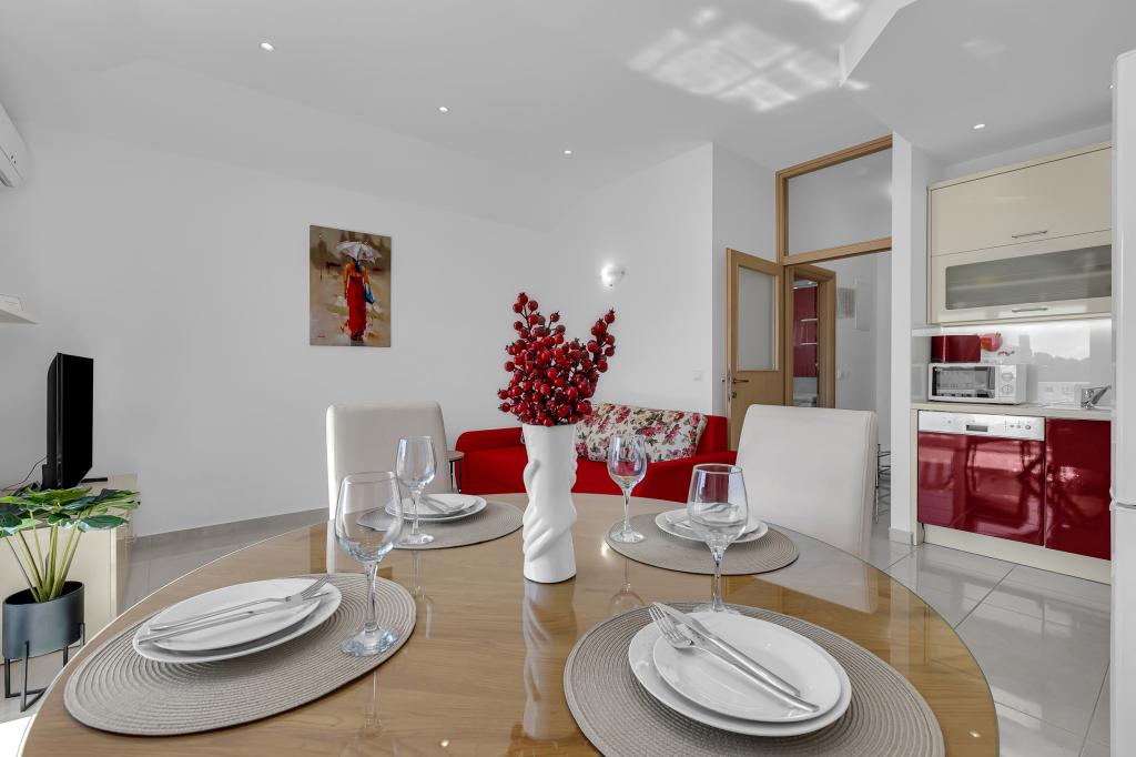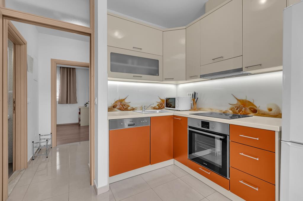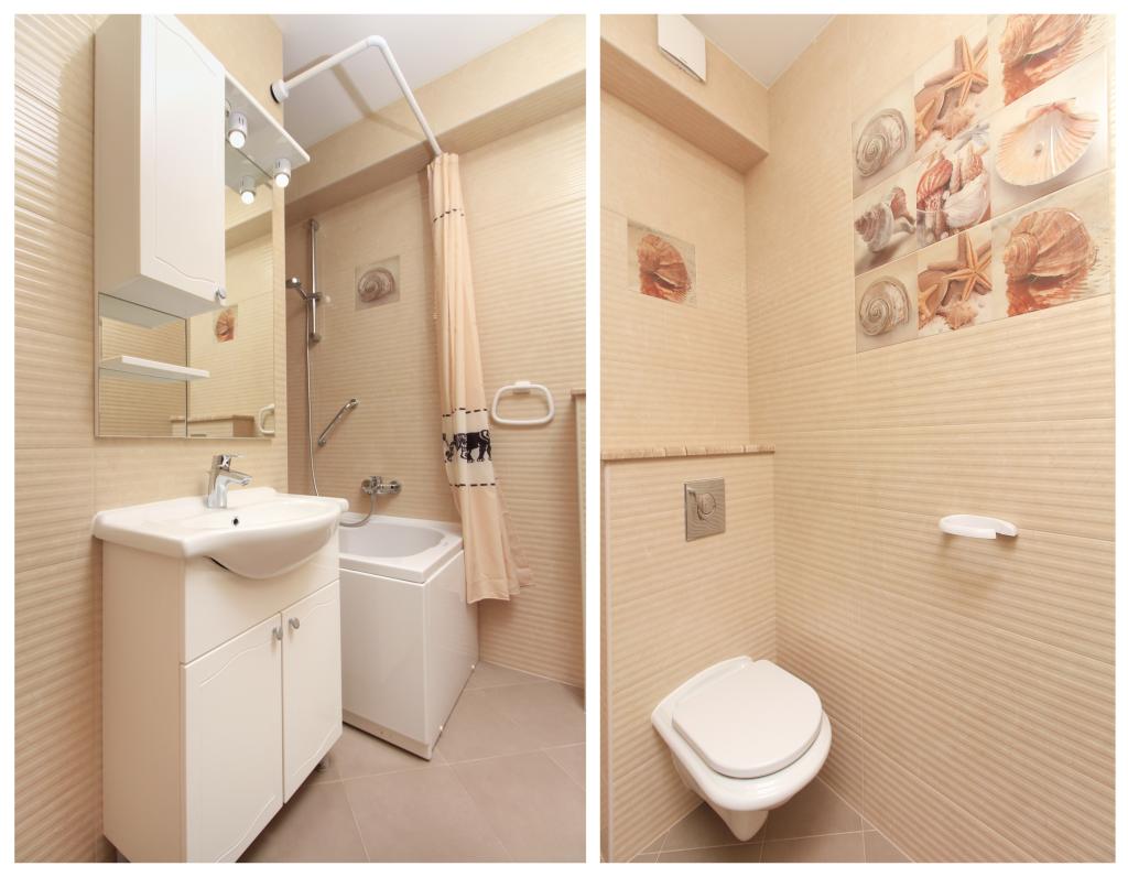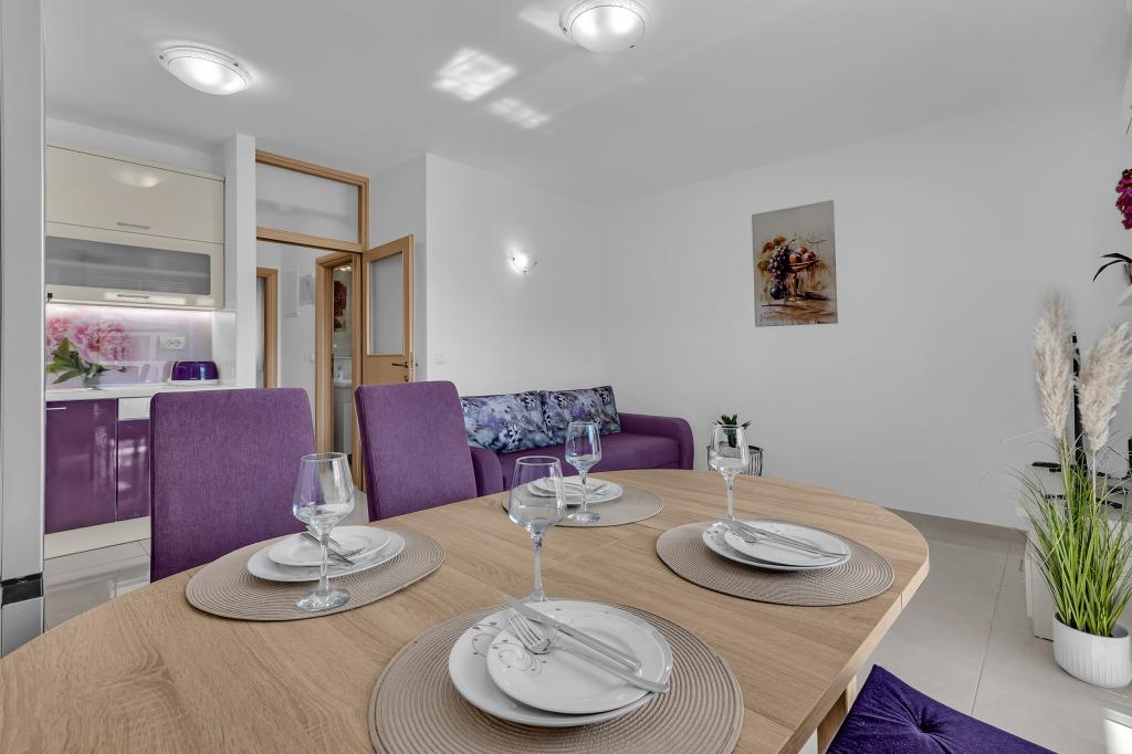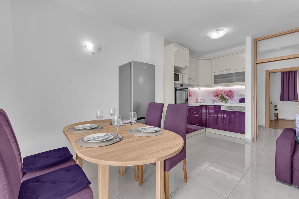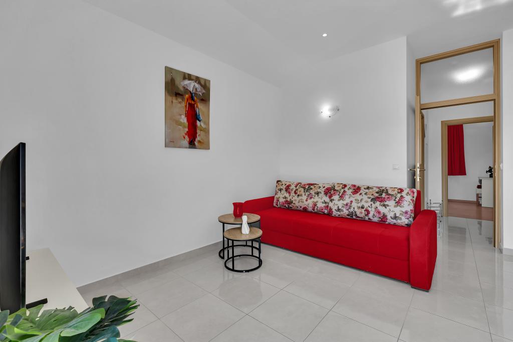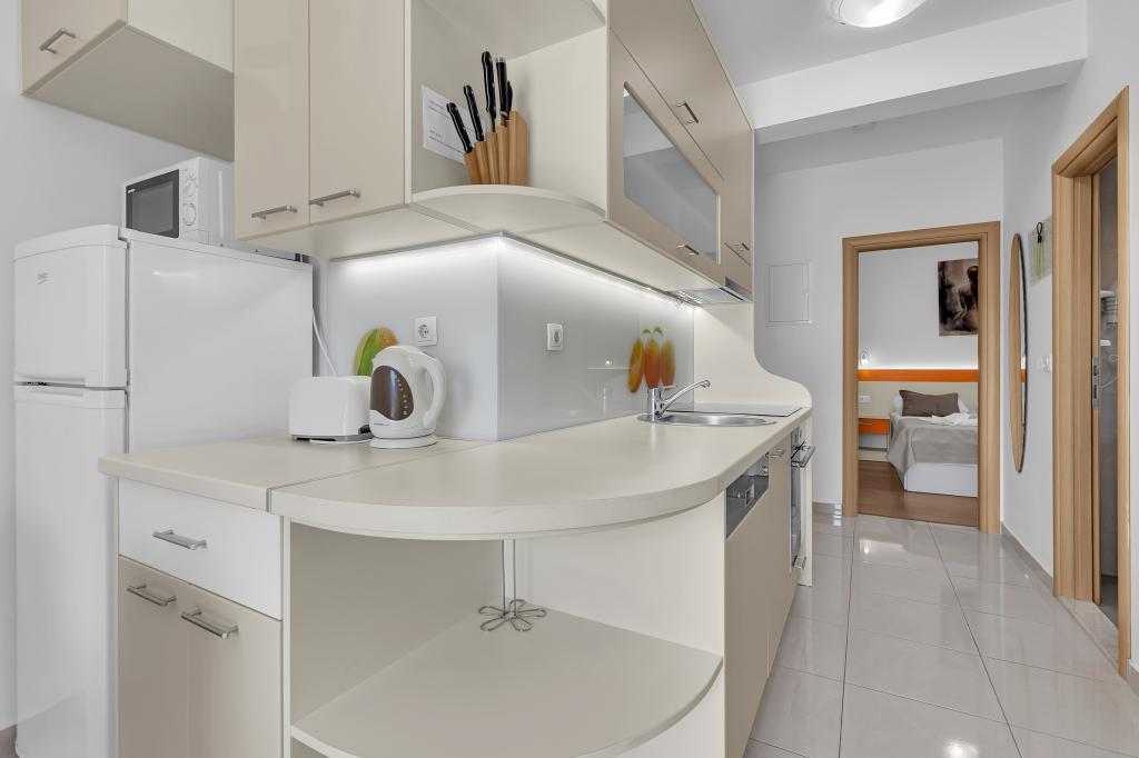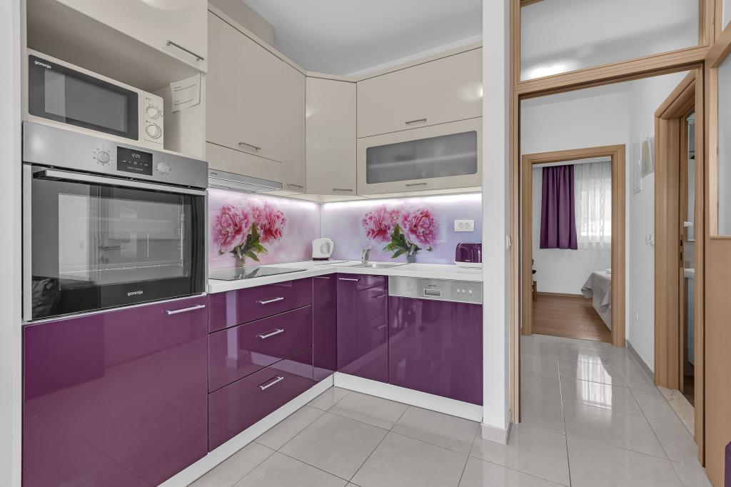 NOVI APARTMANI ! Svi naši apartmani su moderno opremljeni. Ukupno imamo za ponuditi šest ( 6 ) apartmana, od kojih pet ( 5 ) jednosobnih, i jedan dvoetažni - dvosobni. U dvorištu se nalazi mali bazen za goste, a) Jednosobni apartmani ( 2 odrasli i 2 djece ) imaju : soba sa bračnim krevetom, veliko kupatilo sa velikom tuš kadom, potpuno opremljenom modernom kuhinjom sa trpezarijom i sa dnevnim boravkom u kojem se nalazi klimatizacija i udoban kauč na razvlačenje za dvoje odrasle djece, kao i wi-fi Internet. Kod svakog ovog apartmana se iz dnevnog boravka izlazi na veliki balkon od 9 m2. b) Dvosobni, dvoetažni apartman 4 ( 4 odrasih i 2 djece) ima na prvoj etaži modernu sobu sa bračnim krevetom i jedno kupatilo sa tušem i sa wc-om, kompletnu kuhinju sa trpezarijom i dnevni boravak koji ima udoban kauč na razvlačenje za dvoje odrasle djece. U drugu etažu se silazi zavojitim stubama, sa velikom sobom, kupatilom i posebnim wc-om. . Obje etaže su klimatizirane
