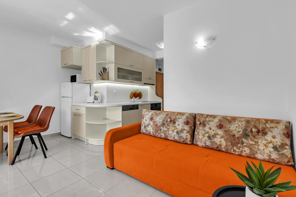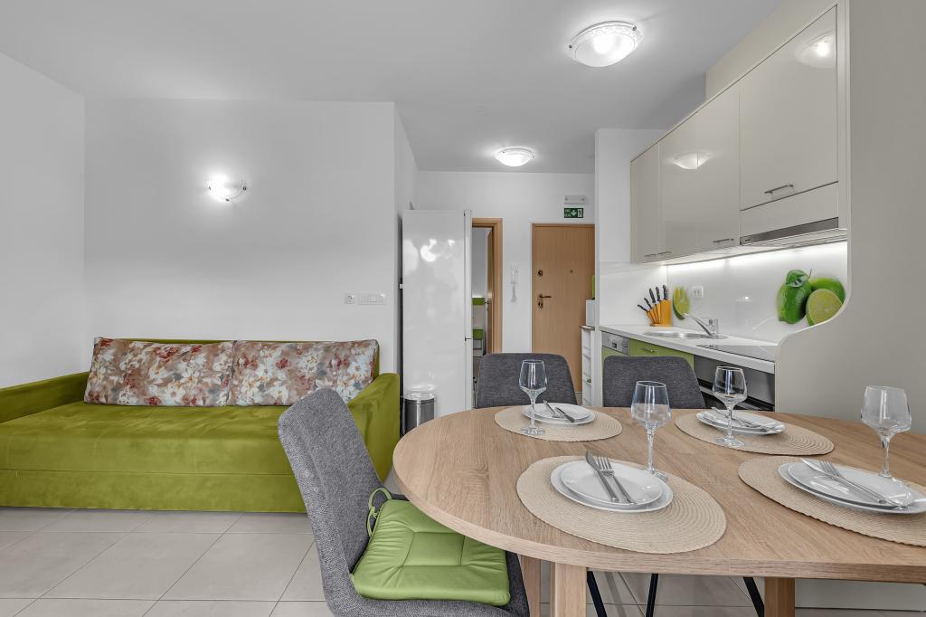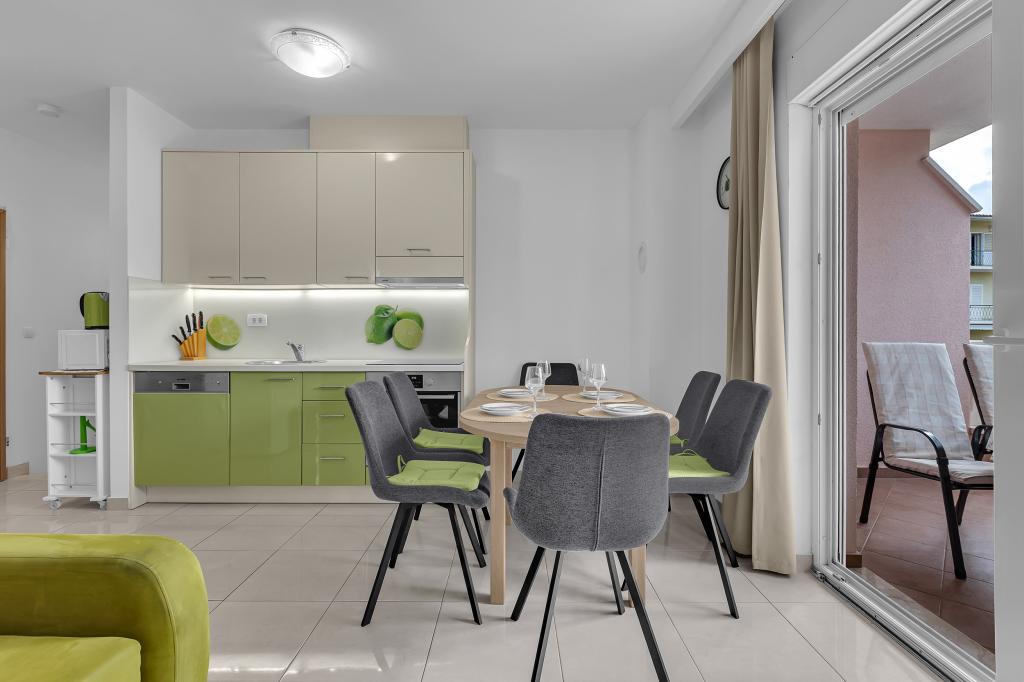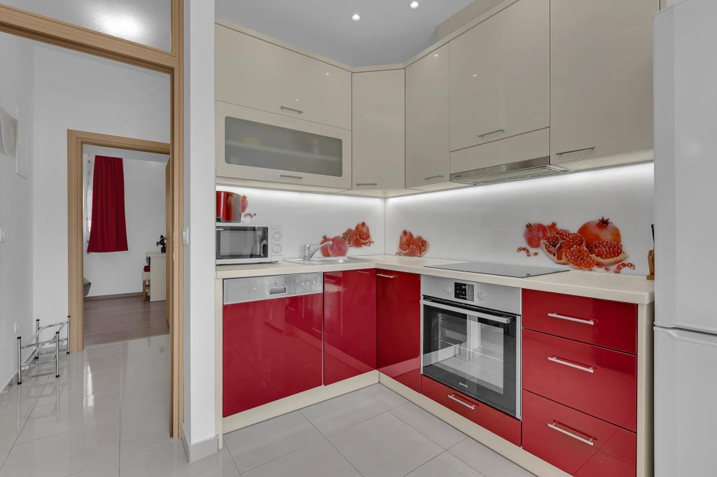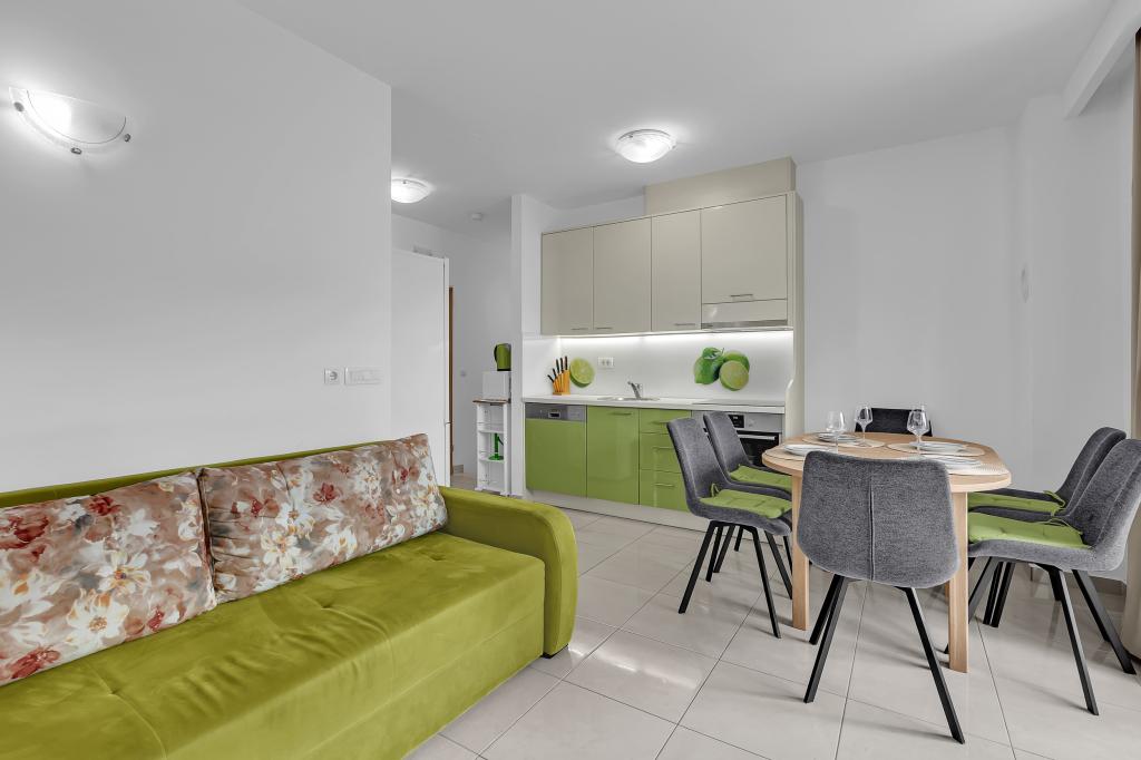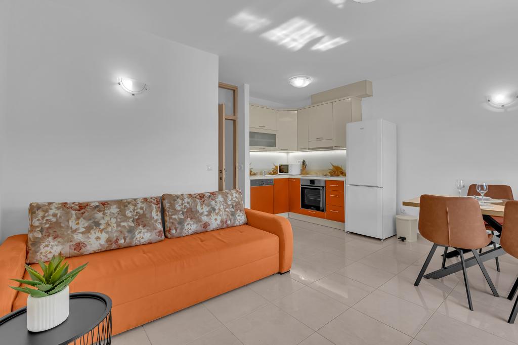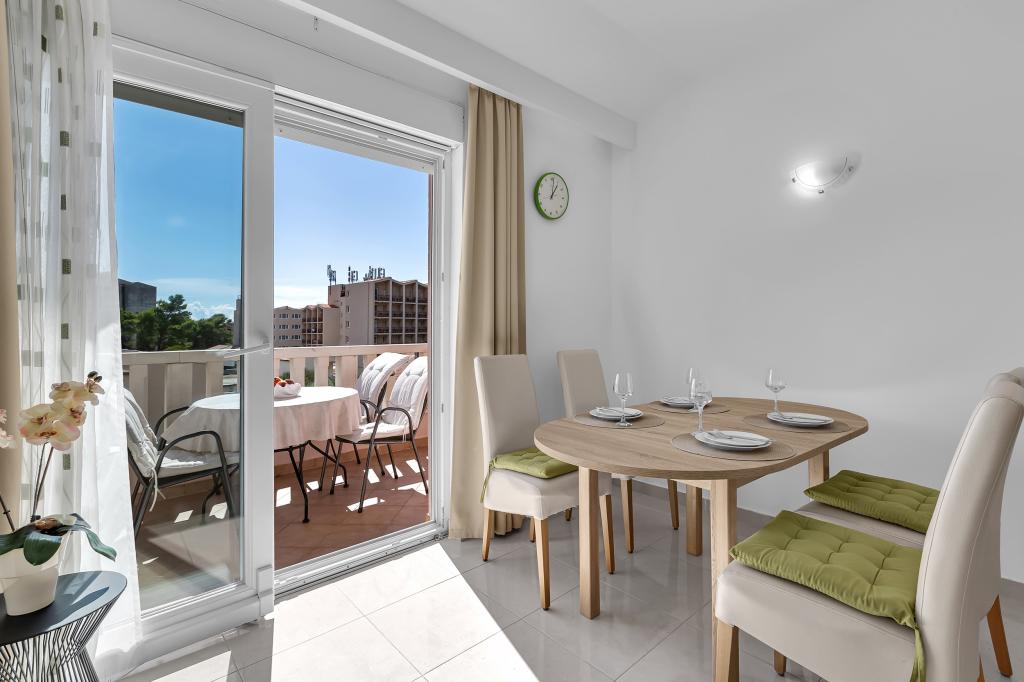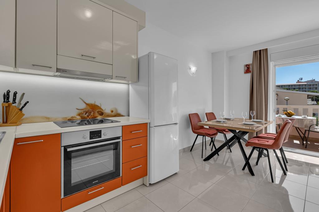 NOVI APARTMANI ! Svi naši apartmani su moderno opremljeni. Ukupno imamo za ponuditi šest ( 6 ) apartmana, od kojih pet ( 5 ) jednosobnih, i jedan dvoetažni - dvosobni. U dvorištu se nalazi mali bazen za goste, a) Jednosobni apartmani ( 2 odrasli i 2 djece ) imaju : soba sa bračnim krevetom, veliko kupatilo sa velikom tuš kadom, potpuno opremljenom modernom kuhinjom sa trpezarijom i sa dnevnim boravkom u kojem se nalazi klimatizacija i udoban kauč na razvlačenje za dvoje odrasle djece, kao i wi-fi Internet. Kod svakog ovog apartmana se iz dnevnog boravka izlazi na veliki balkon od 9 m2. b) Dvosobni, dvoetažni apartman 4 ( 4 odrasih i 2 djece) ima na prvoj etaži modernu sobu sa bračnim krevetom i jedno kupatilo sa tušem i sa wc-om, kompletnu kuhinju sa trpezarijom i dnevni boravak koji ima udoban kauč na razvlačenje za dvoje odrasle djece. U drugu etažu se silazi zavojitim stubama, sa velikom sobom, kupatilom i posebnim wc-om. . Obje etaže su klimatizirane