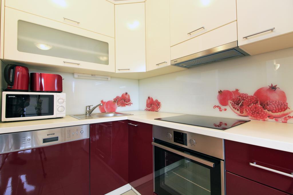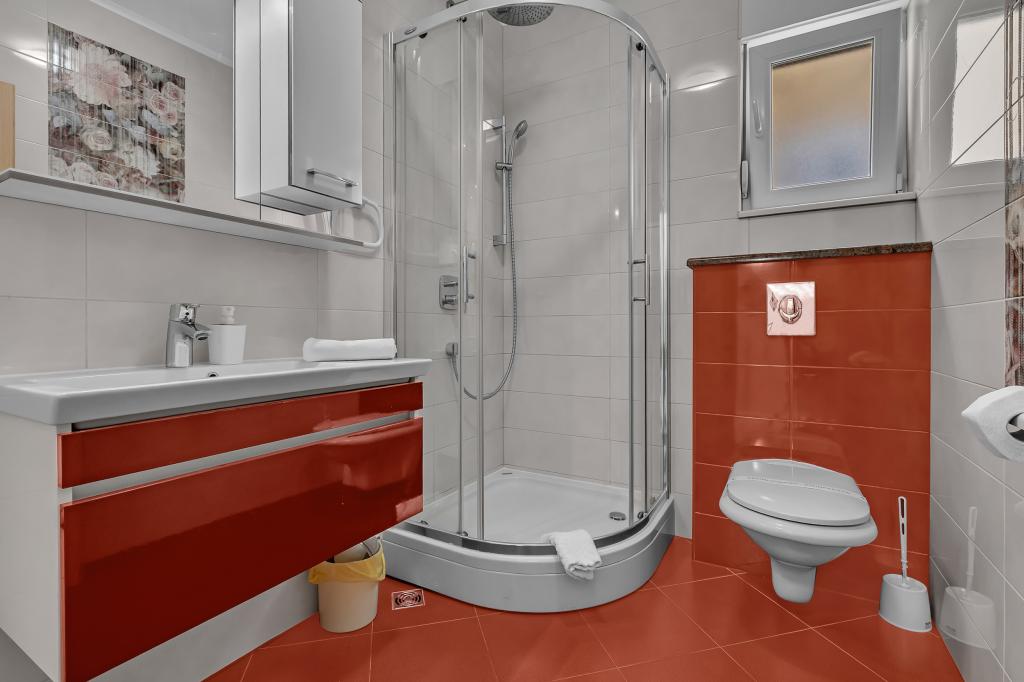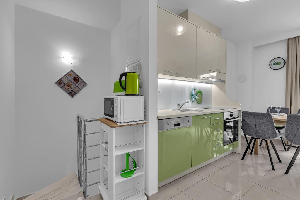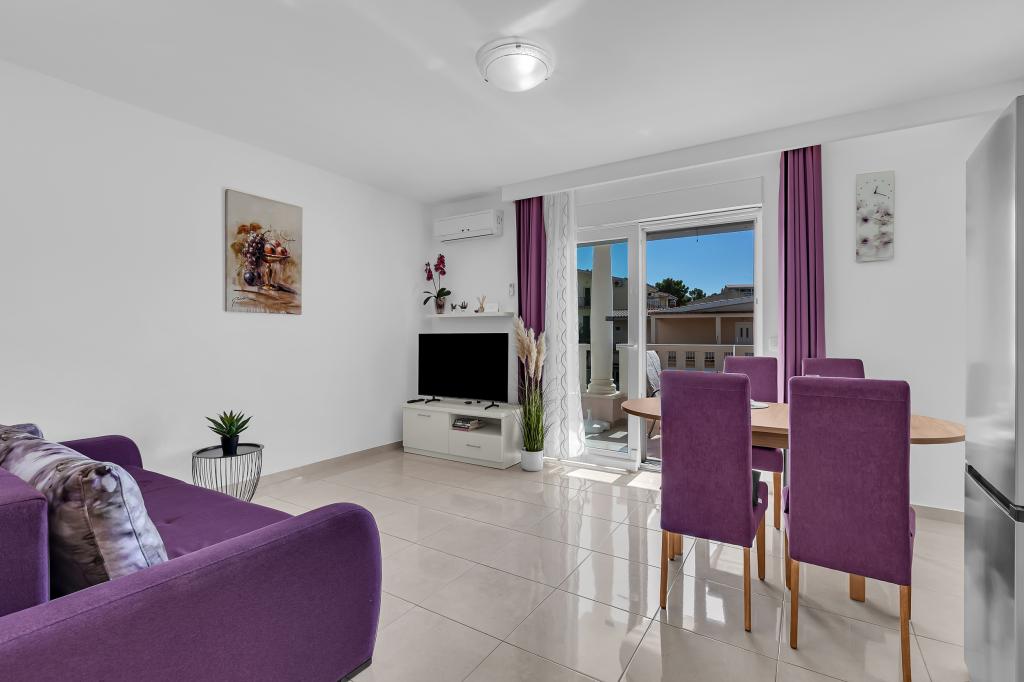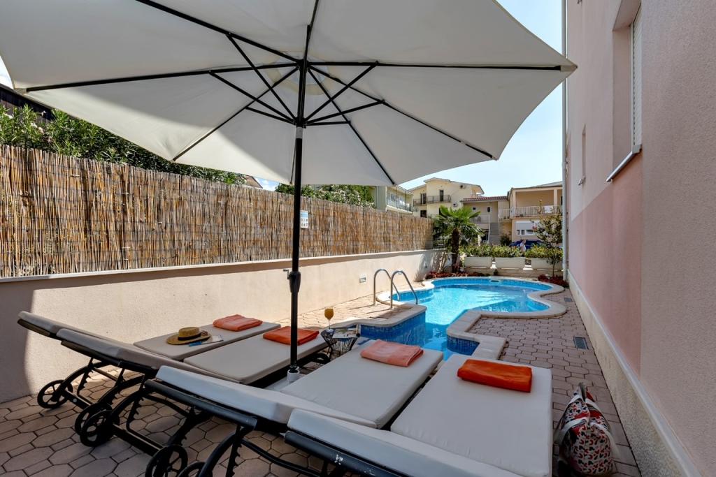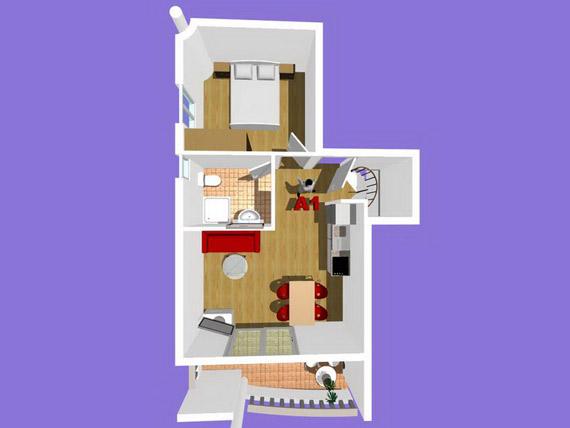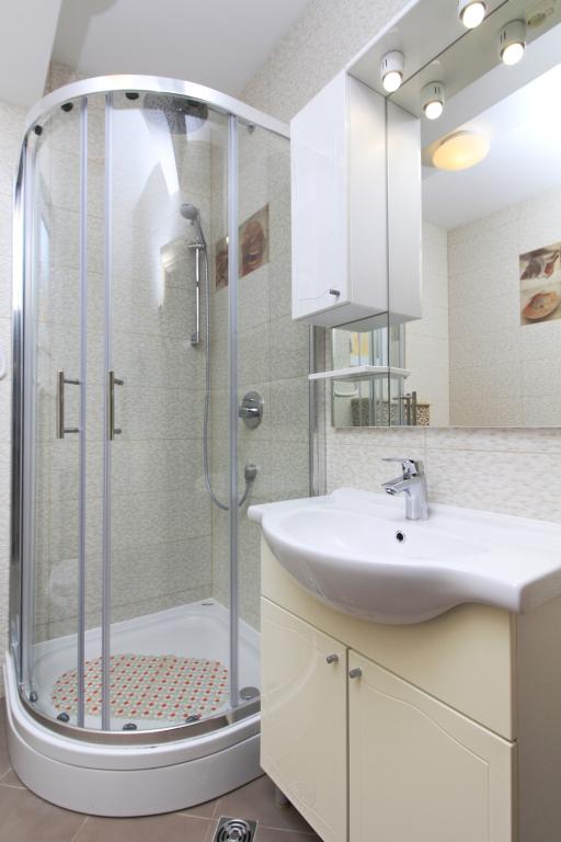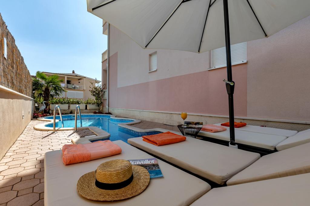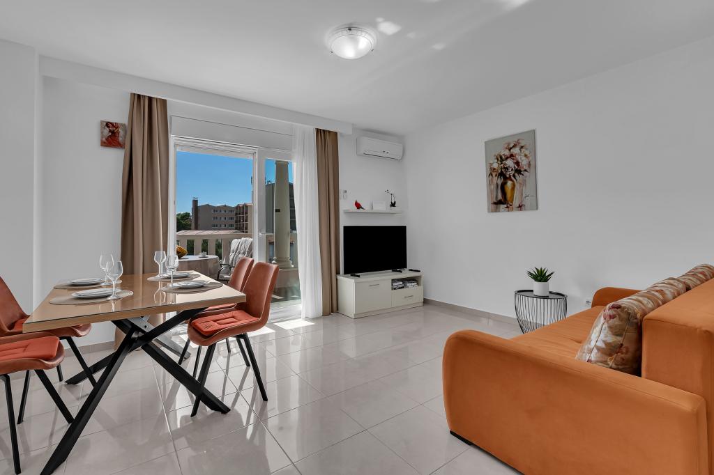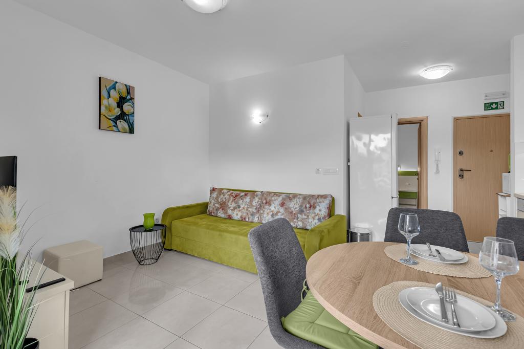 NOVI APARTMANI ! Svi naši apartmani su moderno opremljeni. Ukupno imamo za ponuditi šest ( 6 ) apartmana, od kojih pet ( 5 ) jednosobnih, i jedan dvoetažni - dvosobni. U dvorištu se nalazi mali bazen za goste, a) Jednosobni apartmani ( 2 odrasli i 2 djece ) imaju : soba sa bračnim krevetom, veliko kupatilo sa velikom tuš kadom, potpuno opremljenom modernom kuhinjom sa trpezarijom i sa dnevnim boravkom u kojem se nalazi klimatizacija i udoban kauč na razvlačenje za dvoje odrasle djece, kao i wi-fi Internet. Kod svakog ovog apartmana se iz dnevnog boravka izlazi na veliki balkon od 9 m2. b) Dvosobni, dvoetažni apartman 4 ( 4 odrasih i 2 djece) ima na prvoj etaži modernu sobu sa bračnim krevetom i jedno kupatilo sa tušem i sa wc-om, kompletnu kuhinju sa trpezarijom i dnevni boravak koji ima udoban kauč na razvlačenje za dvoje odrasle djece. U drugu etažu se silazi zavojitim stubama, sa velikom sobom, kupatilom i posebnim wc-om. . Obje etaže su klimatizirane