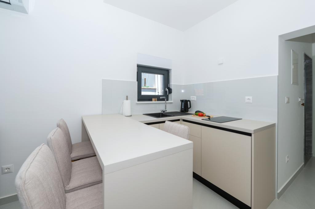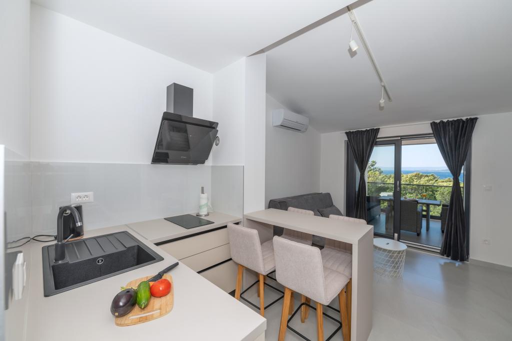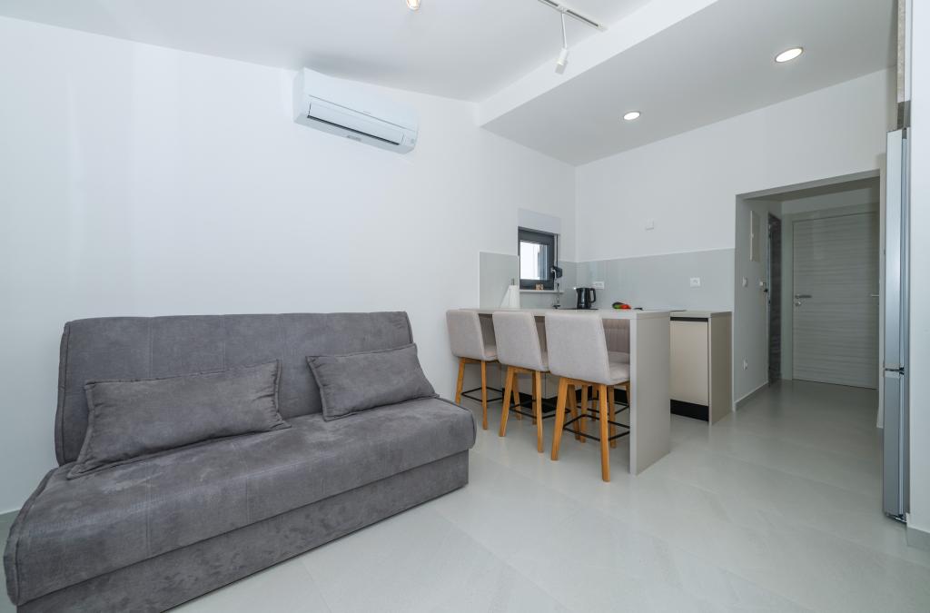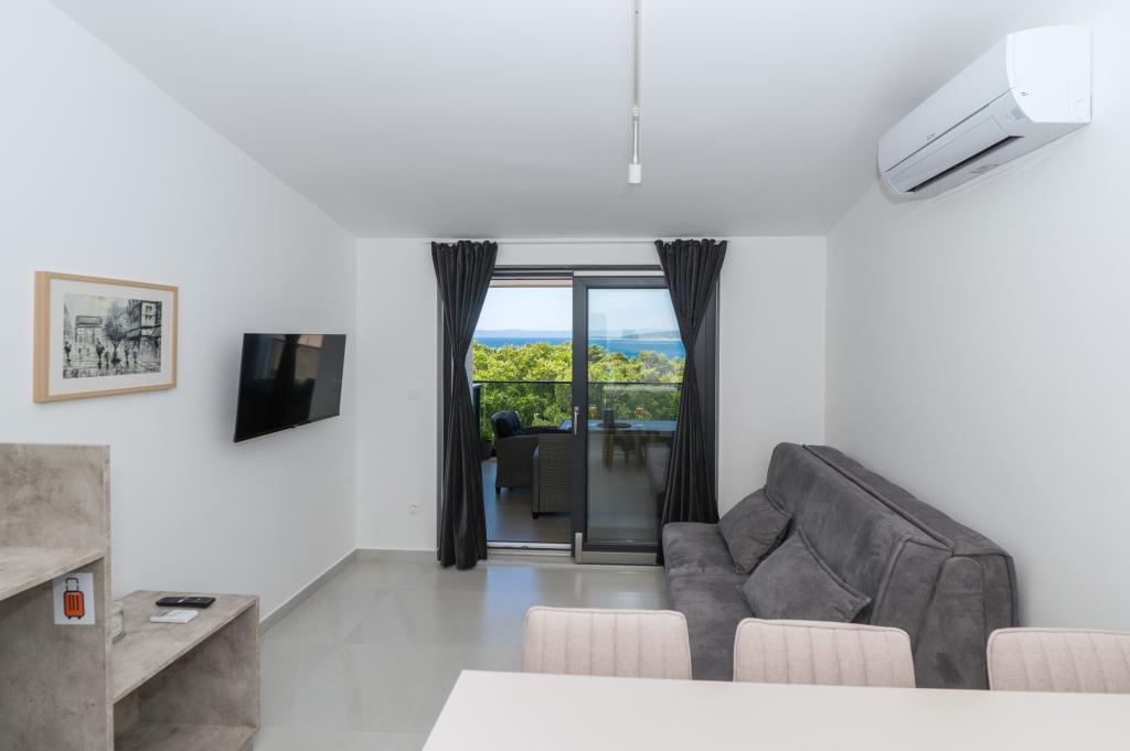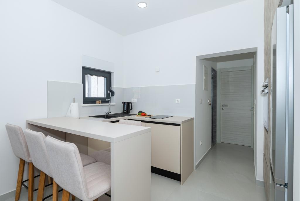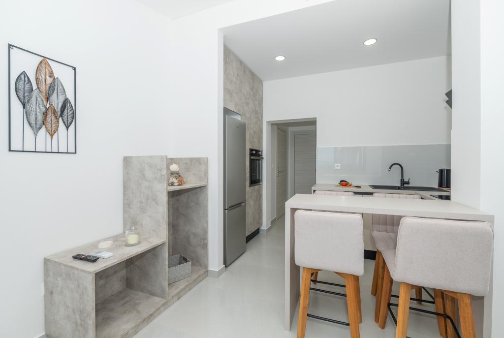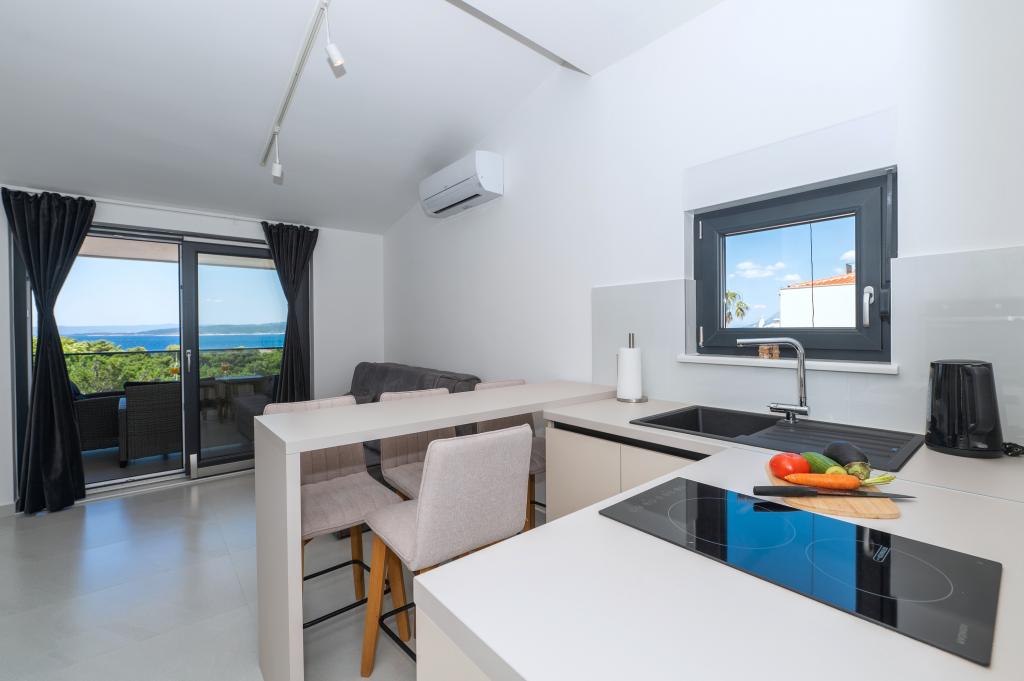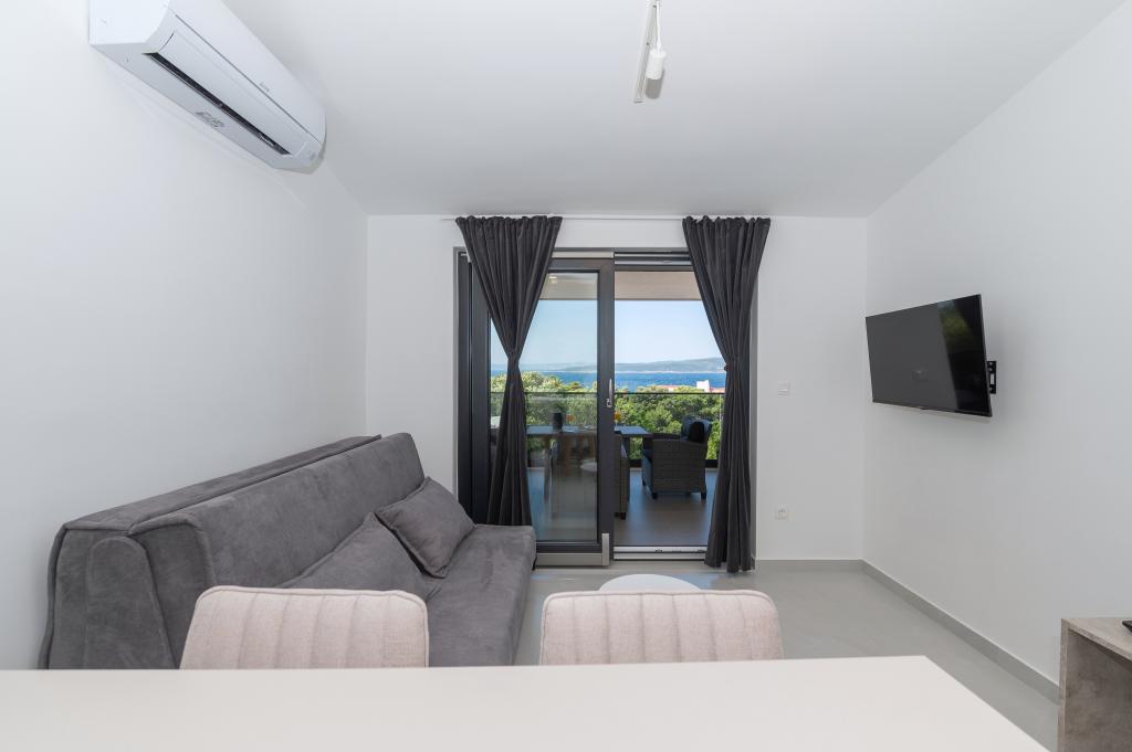 Apartmani su moderno opremljeni svim potrebnim sadržajima za ugodan boravak. Parovi ili obitelji jednako će uživati u udobnost apartmana. Terasa s pogledom na more opremljena je garniturama za sjedenje. Objekt je smješten u blizini pekarnice, supermarketa i raspolaže privatnim besplatnim parkingom. Udaljenost od mora, plaže i svih sadržaja je 500m. Naši gosti su uvijek zadovoljni ponudom i položajem apartmana! Dobrodošli!