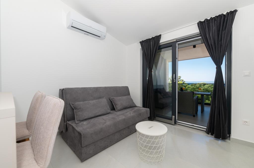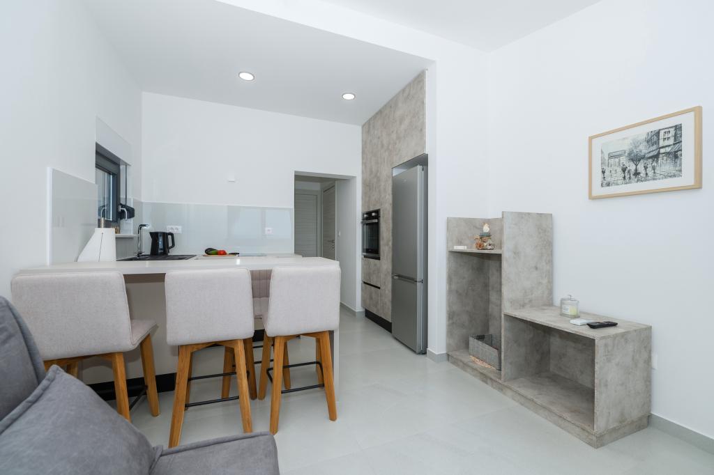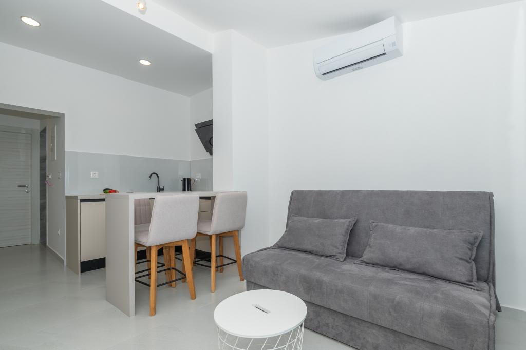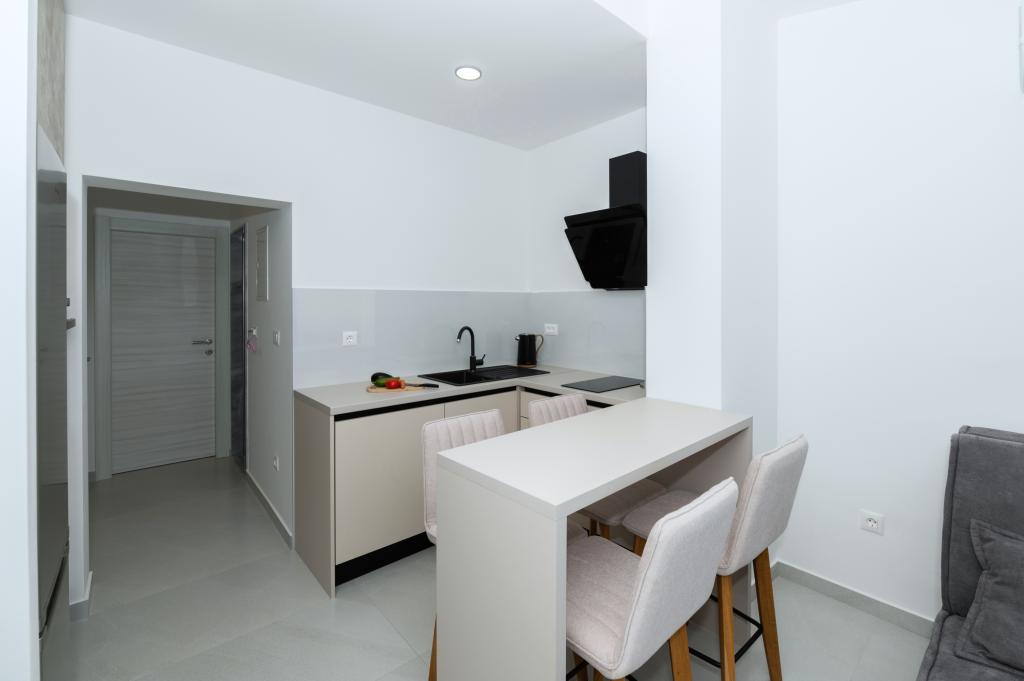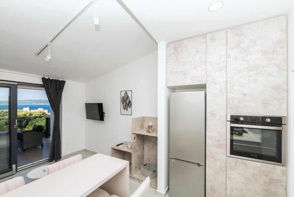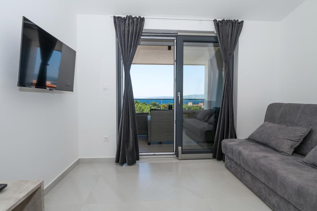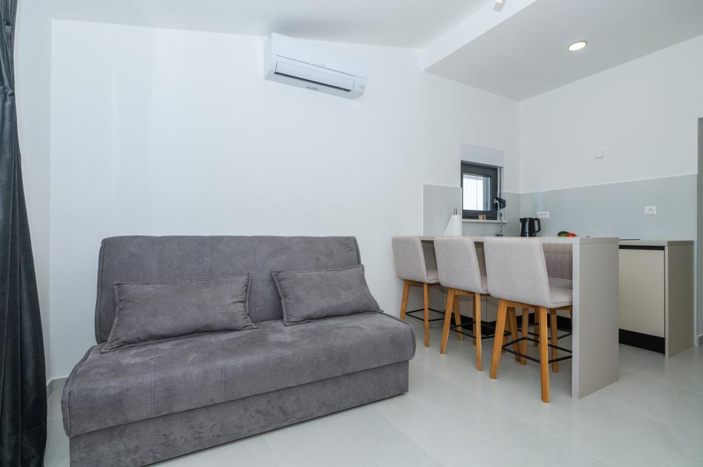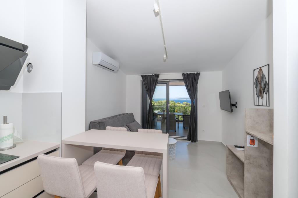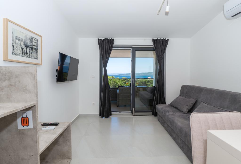 Apartmani su moderno opremljeni svim potrebnim sadržajima za ugodan boravak. Parovi ili obitelji jednako će uživati u udobnost apartmana. Terasa s pogledom na more opremljena je garniturama za sjedenje. Objekt je smješten u blizini pekarnice, supermarketa i raspolaže privatnim besplatnim parkingom. Udaljenost od mora, plaže i svih sadržaja je 500m. Naši gosti su uvijek zadovoljni ponudom i položajem apartmana! Dobrodošli!