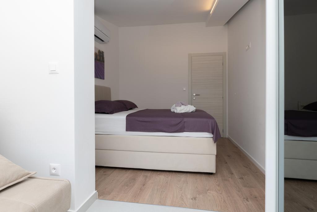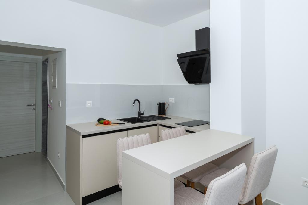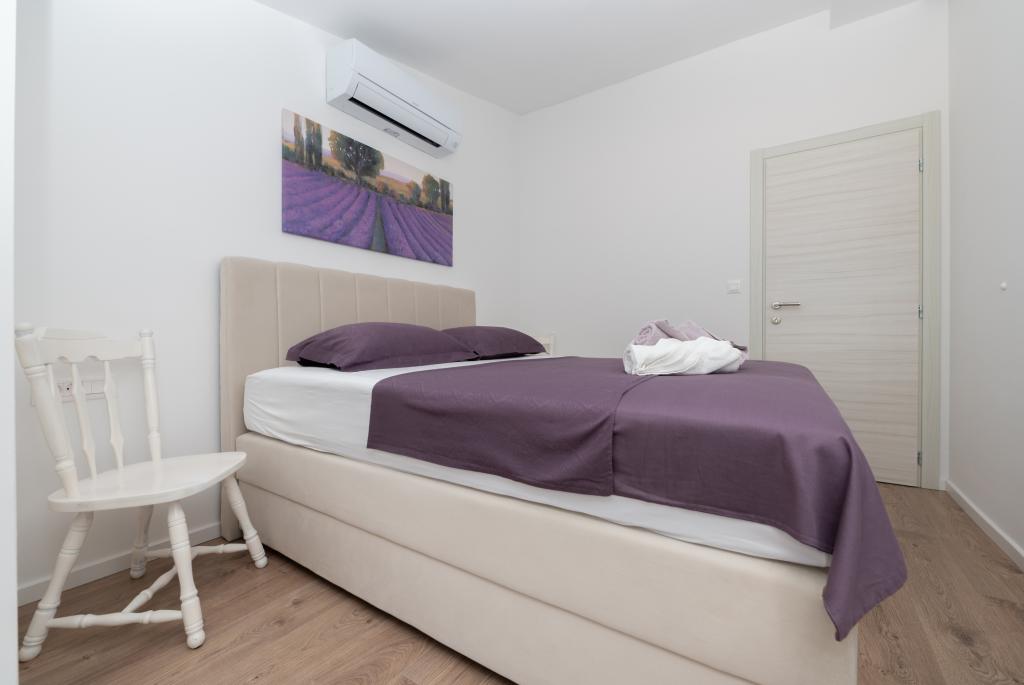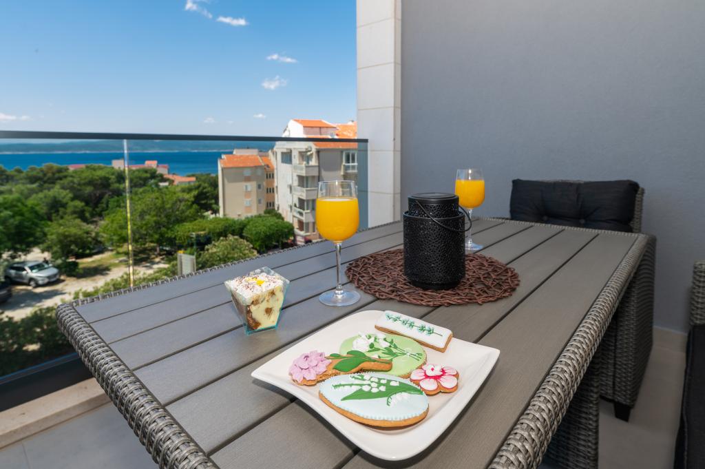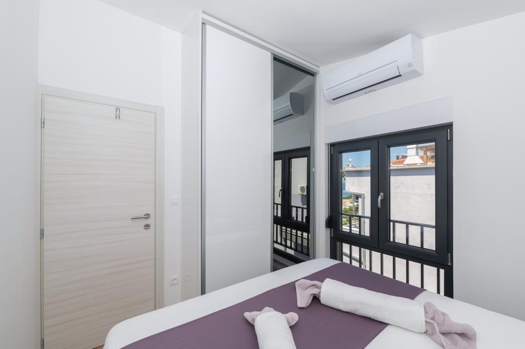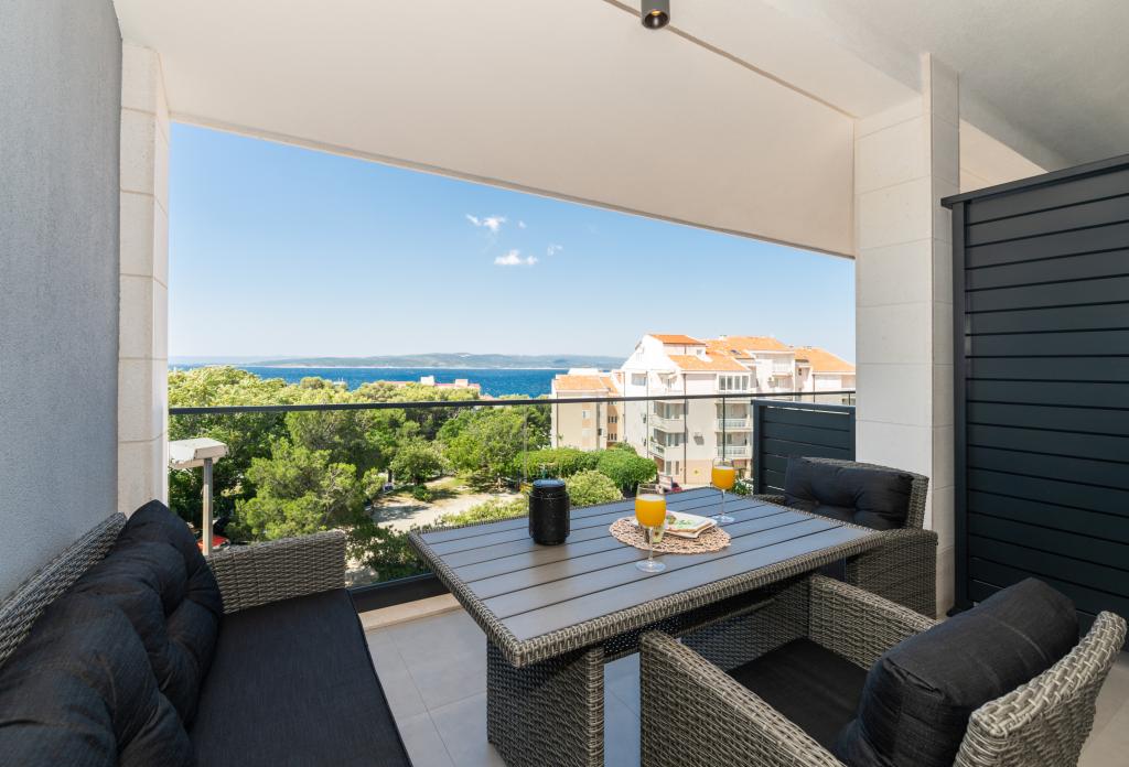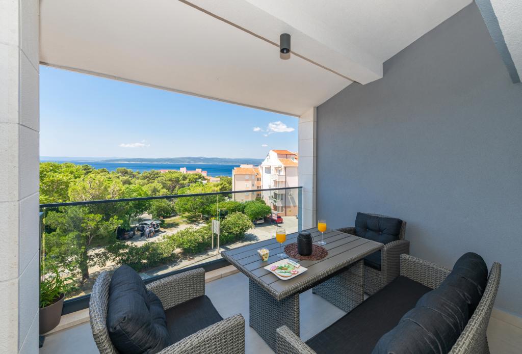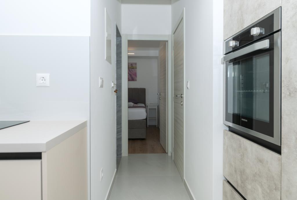 Apartmani su moderno opremljeni svim potrebnim sadržajima za ugodan boravak. Parovi ili obitelji jednako će uživati u udobnost apartmana. Terasa s pogledom na more opremljena je garniturama za sjedenje. Objekt je smješten u blizini pekarnice, supermarketa i raspolaže privatnim besplatnim parkingom. Udaljenost od mora, plaže i svih sadržaja je 500m. Naši gosti su uvijek zadovoljni ponudom i položajem apartmana! Dobrodošli!
