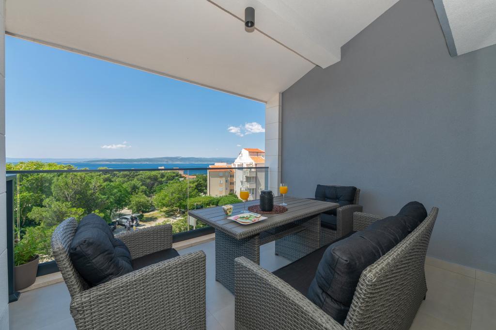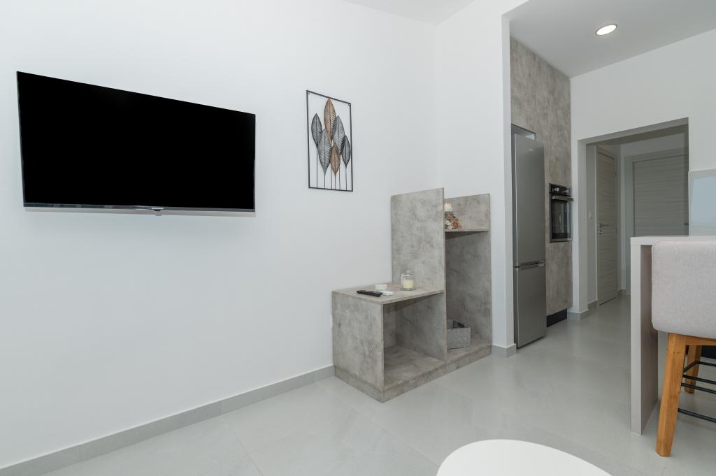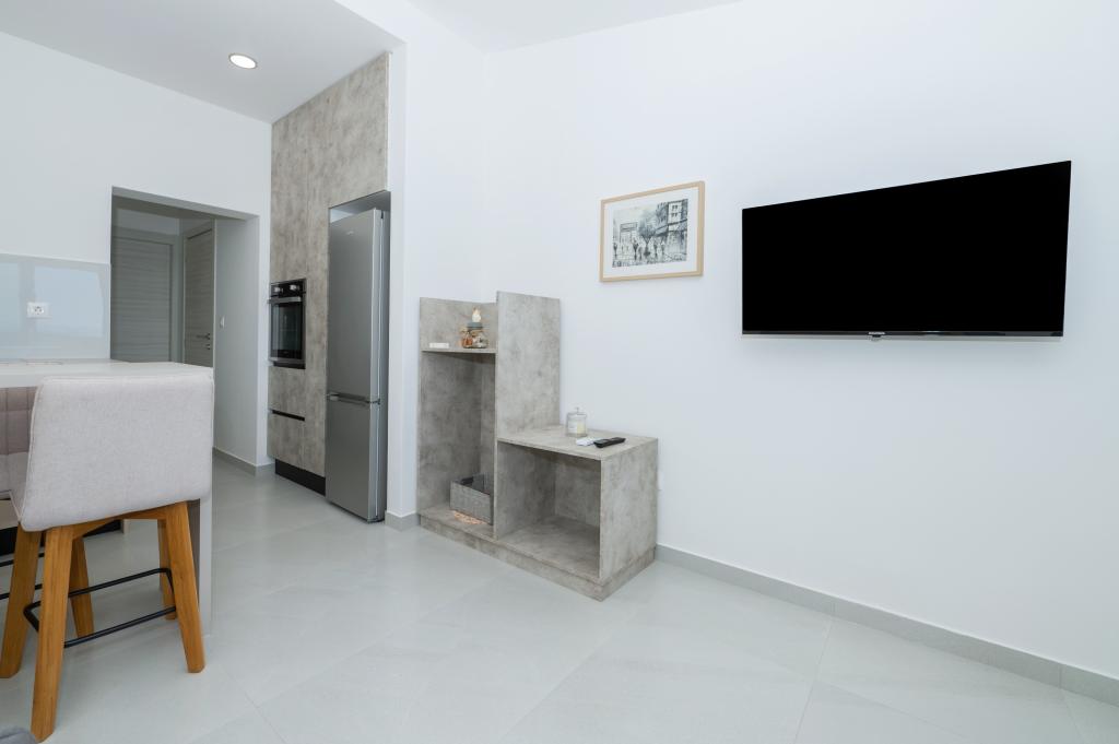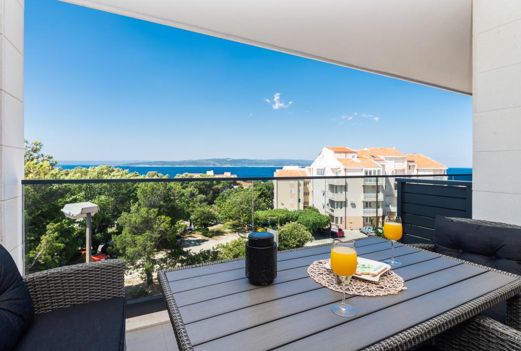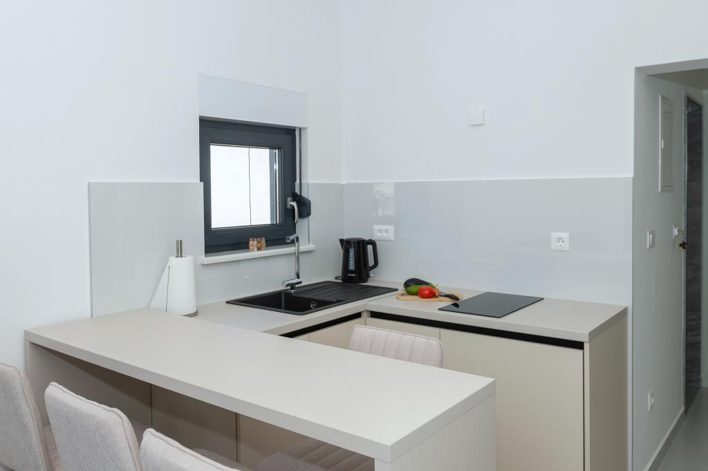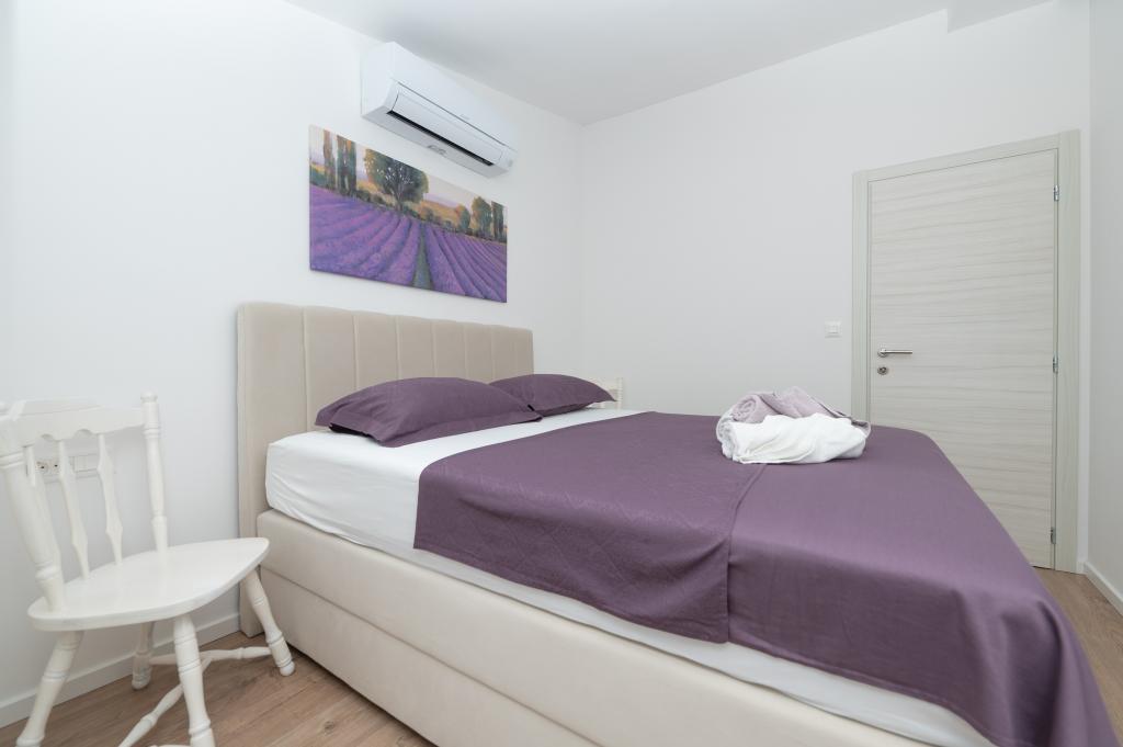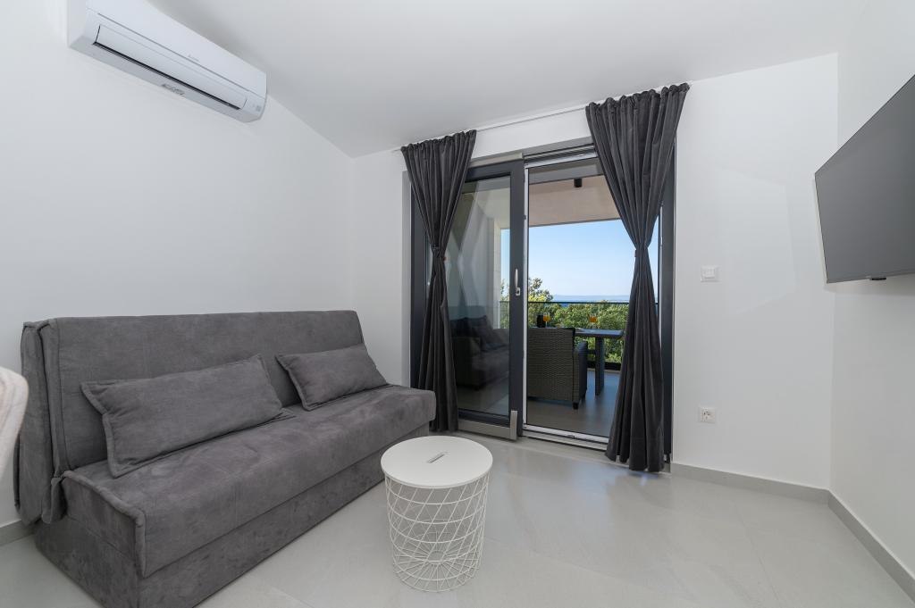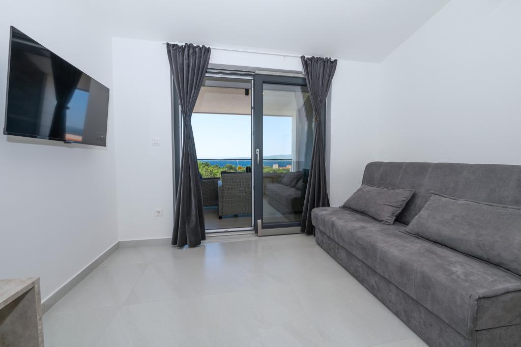 Apartmani su moderno opremljeni svim potrebnim sadržajima za ugodan boravak. Parovi ili obitelji jednako će uživati u udobnost apartmana. Terasa s pogledom na more opremljena je garniturama za sjedenje. Objekt je smješten u blizini pekarnice, supermarketa i raspolaže privatnim besplatnim parkingom. Udaljenost od mora, plaže i svih sadržaja je 500m. Naši gosti su uvijek zadovoljni ponudom i položajem apartmana! Dobrodošli!