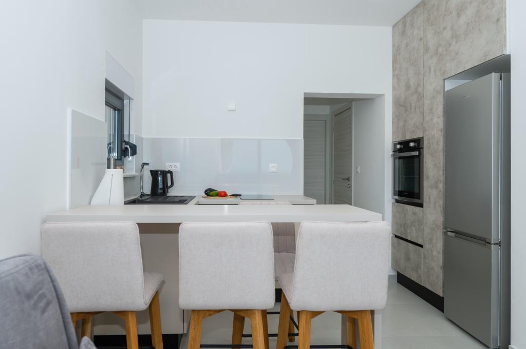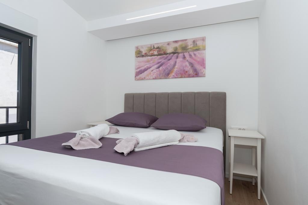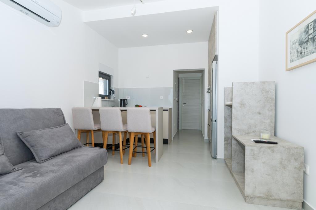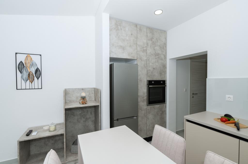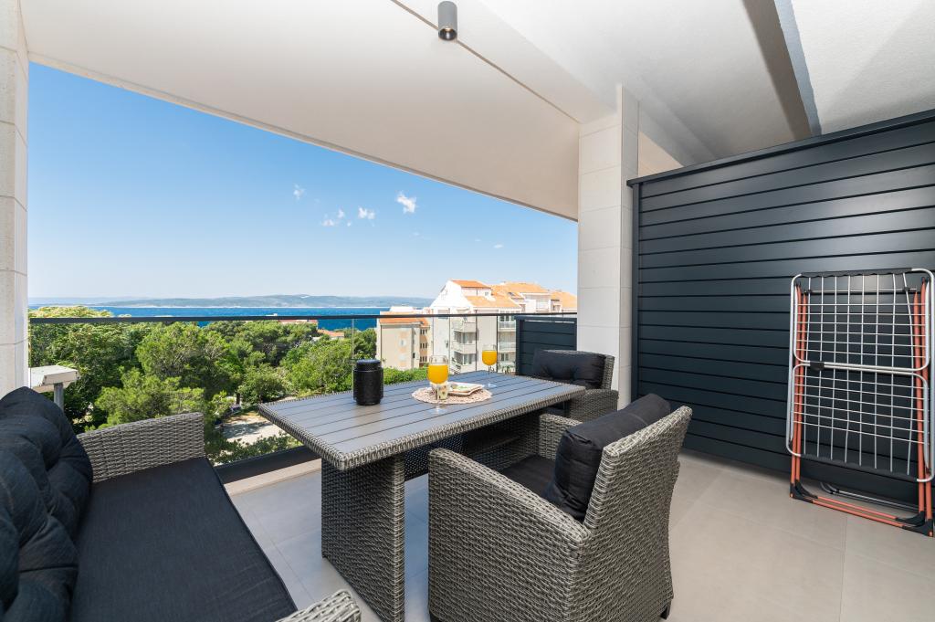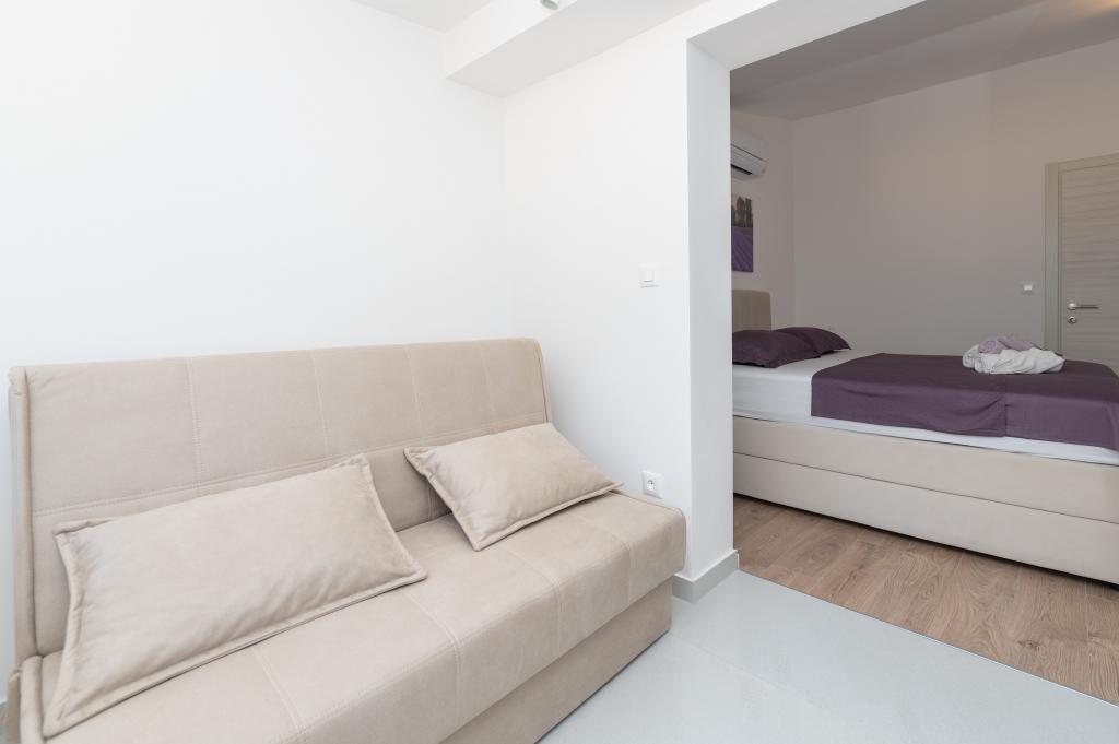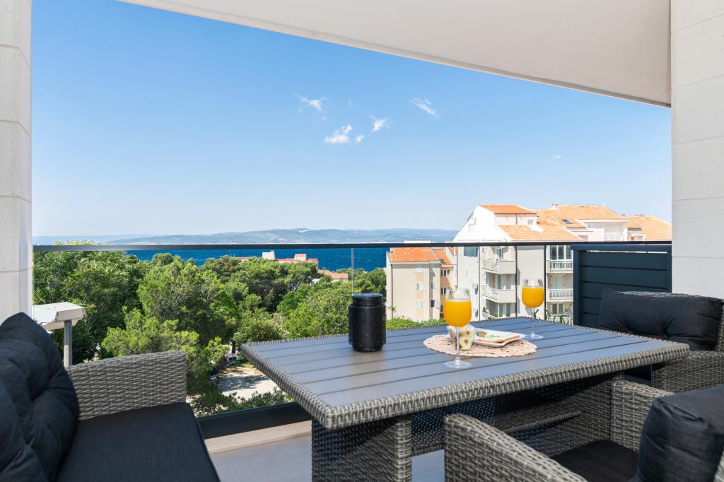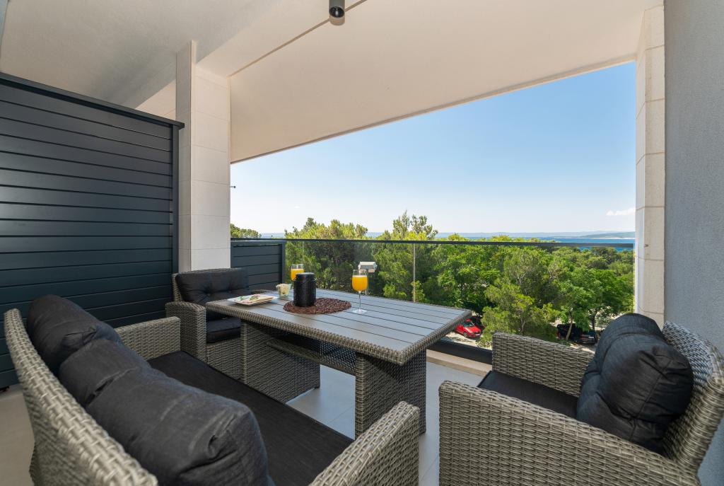 Apartmani su moderno opremljeni svim potrebnim sadržajima za ugodan boravak. Parovi ili obitelji jednako će uživati u udobnost apartmana. Terasa s pogledom na more opremljena je garniturama za sjedenje. Objekt je smješten u blizini pekarnice, supermarketa i raspolaže privatnim besplatnim parkingom. Udaljenost od mora, plaže i svih sadržaja je 500m. Naši gosti su uvijek zadovoljni ponudom i položajem apartmana! Dobrodošli!