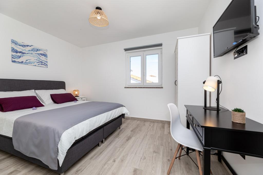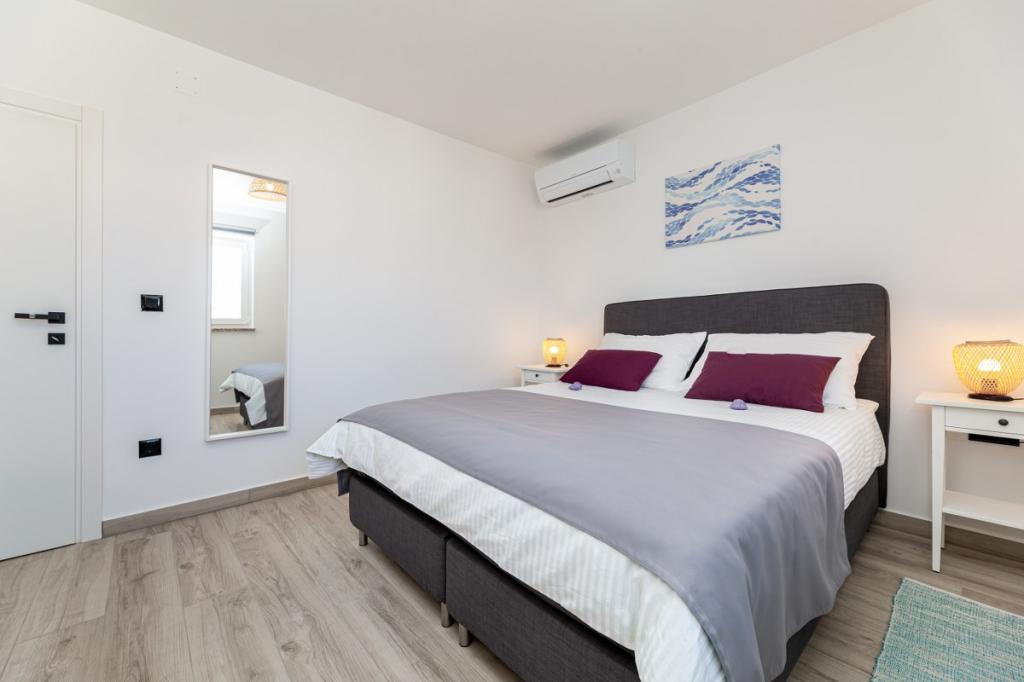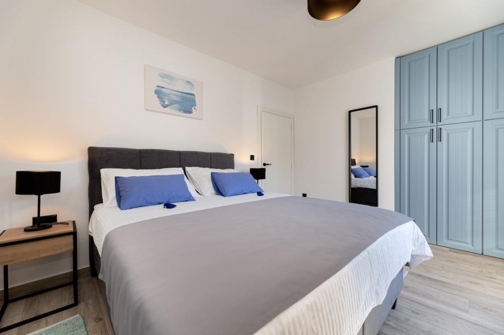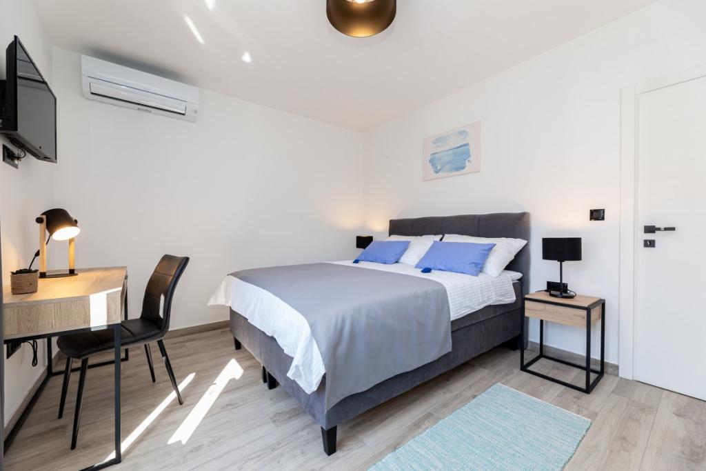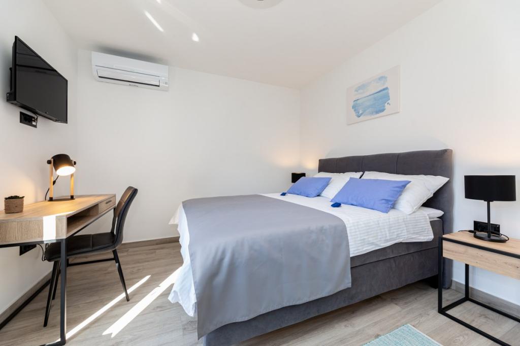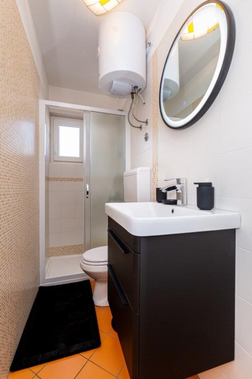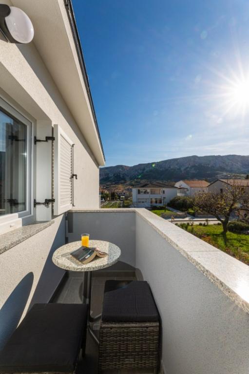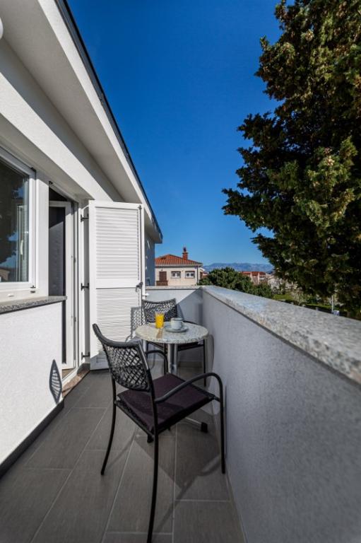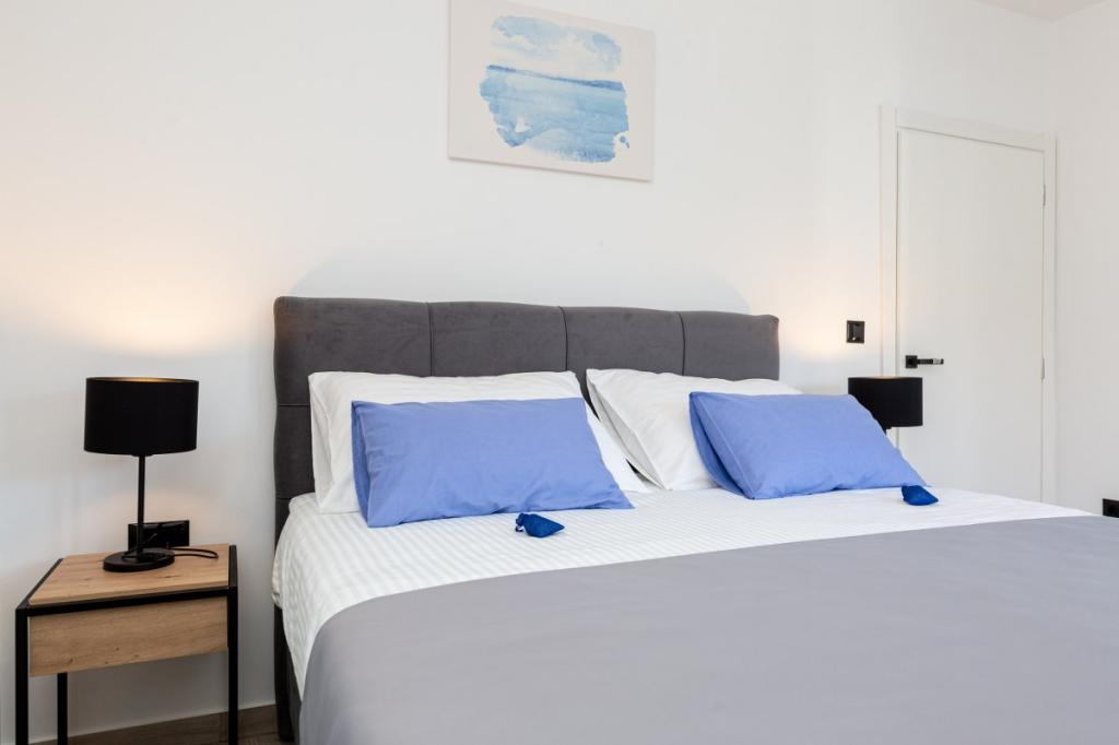 Moderno uređen apartman u mirnom predjelu, udaljen cca 200 m od mora. Nalazi se na 1. katu obiteljske kuće. Objekt se nalazi 5 do 10 minuta hoda do plaže ili centra mjesta, te posjeduje 2 parkirna mjesta. Apartman se sastoji od 3 dvokrevetne spavaće sobe od kojih su 2 sa balkonom. Svaka soba je klimatizirana i ima SAT TV i fen. Kuhinja opremljna hladnjakom, ledenicom, perilicom suđa, pločom za kuhanje, mikrovalnom pećnicom, mašinom za filter kavu, kuhalom za vodu, tosterom te svim potrebnim posuđem. Dnevni boravak je također klimatiziran i ima SAT TV. Apartman ima 2 kupaone sa tuš kabinom. WI FI uključen u cijenu. Apartman posjeduje i vrtnu terasu sa garniturom za sjedenje i grillom. Želimo vam ugodan boavak u našem apartamanu.
