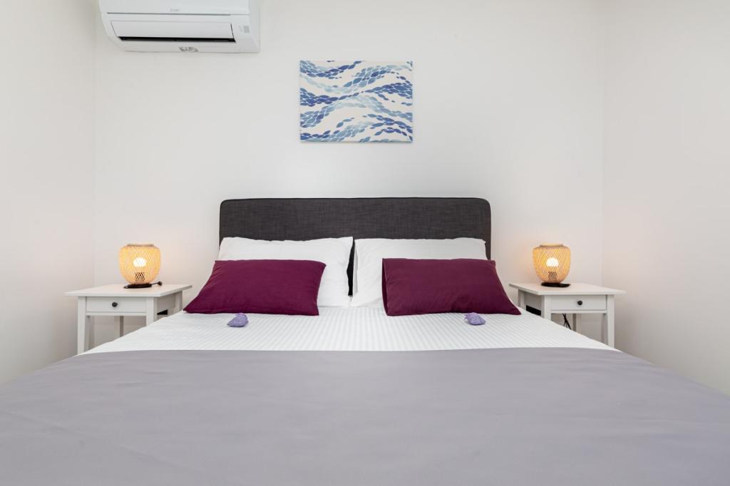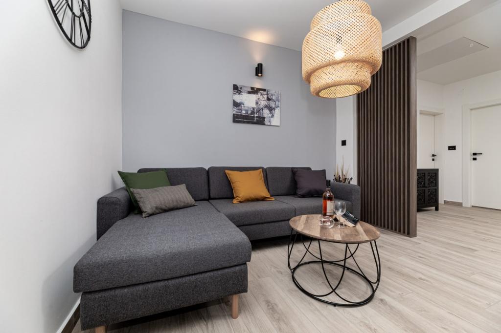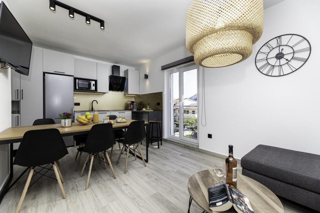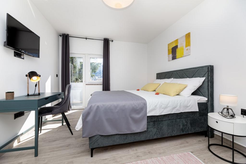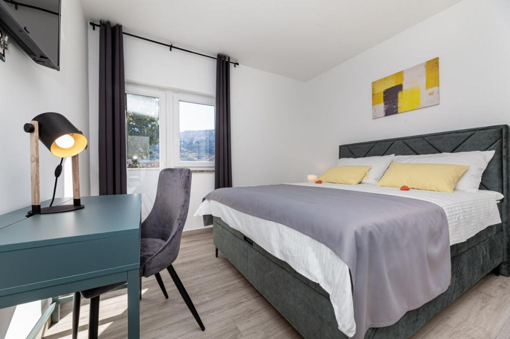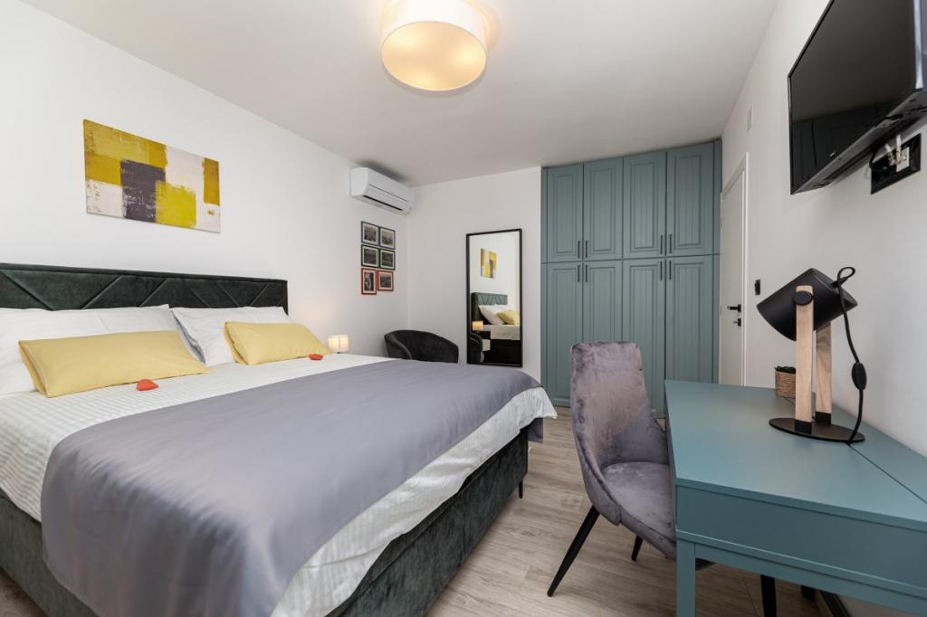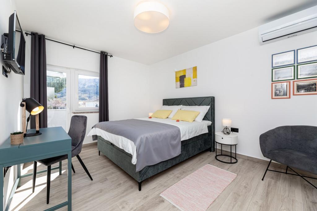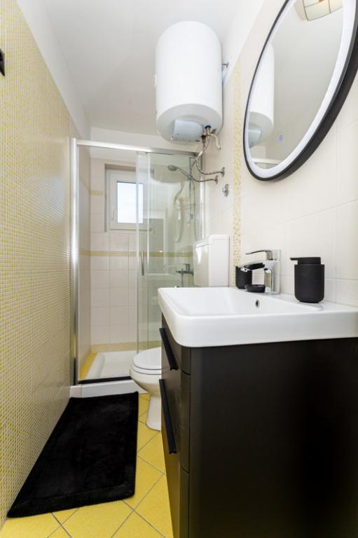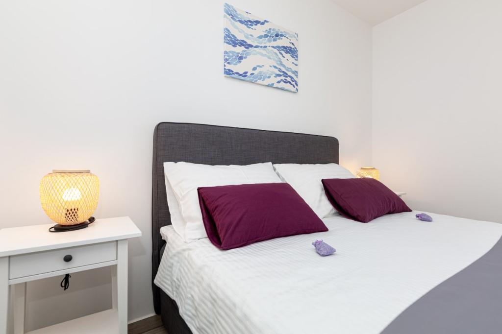 Moderno uređen apartman u mirnom predjelu, udaljen cca 200 m od mora. Nalazi se na 1. katu obiteljske kuće. Objekt se nalazi 5 do 10 minuta hoda do plaže ili centra mjesta, te posjeduje 2 parkirna mjesta. Apartman se sastoji od 3 dvokrevetne spavaće sobe od kojih su 2 sa balkonom. Svaka soba je klimatizirana i ima SAT TV i fen. Kuhinja opremljna hladnjakom, ledenicom, perilicom suđa, pločom za kuhanje, mikrovalnom pećnicom, mašinom za filter kavu, kuhalom za vodu, tosterom te svim potrebnim posuđem. Dnevni boravak je također klimatiziran i ima SAT TV. Apartman ima 2 kupaone sa tuš kabinom. WI FI uključen u cijenu. Apartman posjeduje i vrtnu terasu sa garniturom za sjedenje i grillom. Želimo vam ugodan boavak u našem apartamanu.
