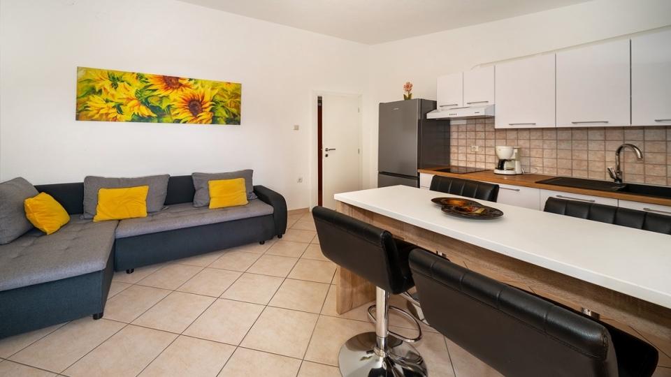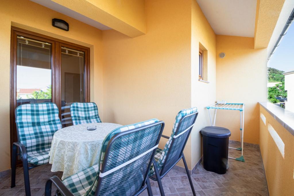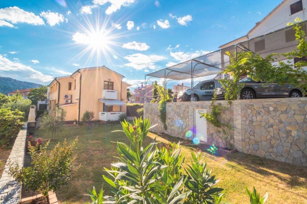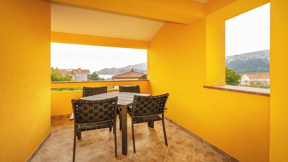 Apartman u mirnom djelu Baške na otoku Krku, objekt se nalazi 400 metara od plaže i 200 metara od centra. Ima terasu sa pogledom na more. U cijeni smještaja je uključen wi-fi. natkriveni parking i klima.