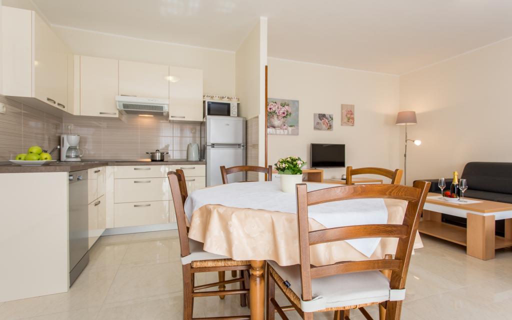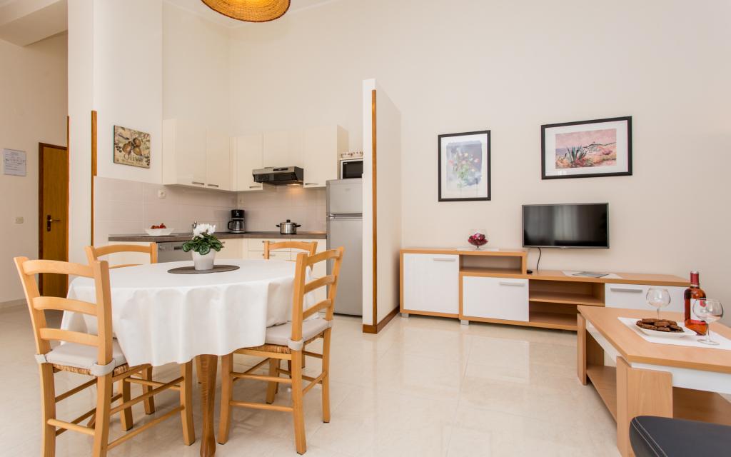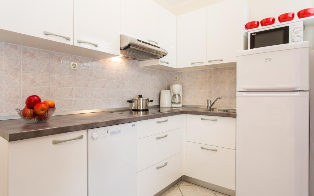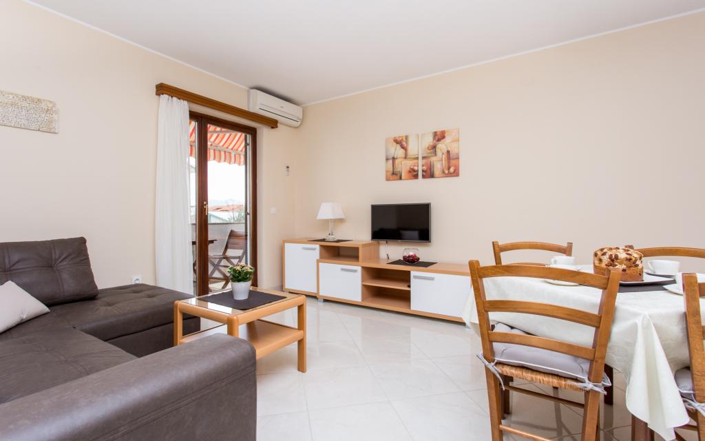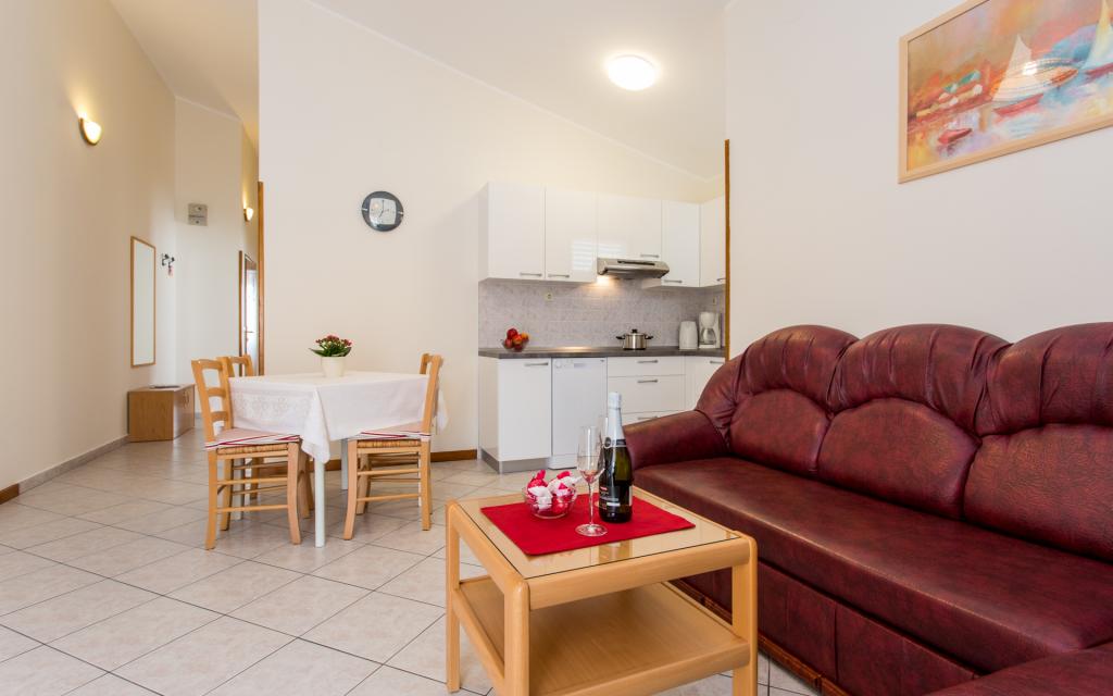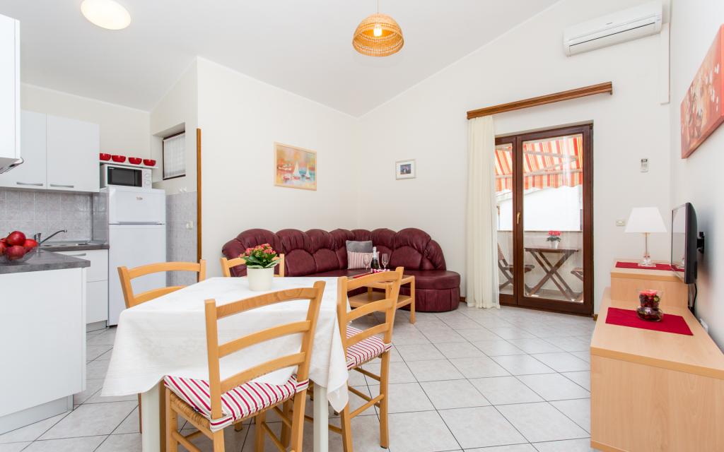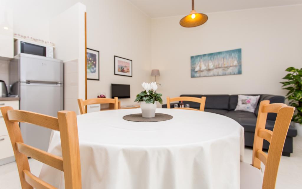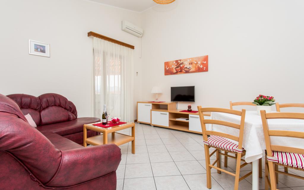 Naša kuća ima prizemlje i dva kata, na prvom i drugom katu nalaze apartmani. Svaki apartman se sastoji od 2 spavaće sobe, dnevnog boravka sa sat-tv, kuhinjom sa blagovaonicom, kupatilom sa kadom sa tušem, balkona sa vanjskim namještajem. U dvorištu imamo lijepi vrt koji volimo uređivati. Imamo lijepu terasu sa grilom koje je idealno za večernje druženje. Terasa sa grillom je dostupna svim gostima. U dvorištu nudimo i parkiralište za automobile. Najmom apartmana bavimo se već dugi niz godina. Trudimo se pružiti gostima čim ugodniji boravak u našoj kući. Uvijek smo voljni pomoći. Trudimo se održavati apartmane izrazito urednima, te se trudimo uvijek nešto poboljšati. Naša kuća se nalazi u centralnom dijelu Baške, idealnom za godišnji odmor. Susjedstvo nam je mirno i nema mnogo prometa. Udaljena je od buke, a opet nalazi se svega 10 min laganog hoda do plaže, prvog dućana, pekarnice, banke. .