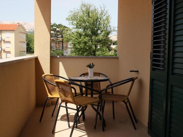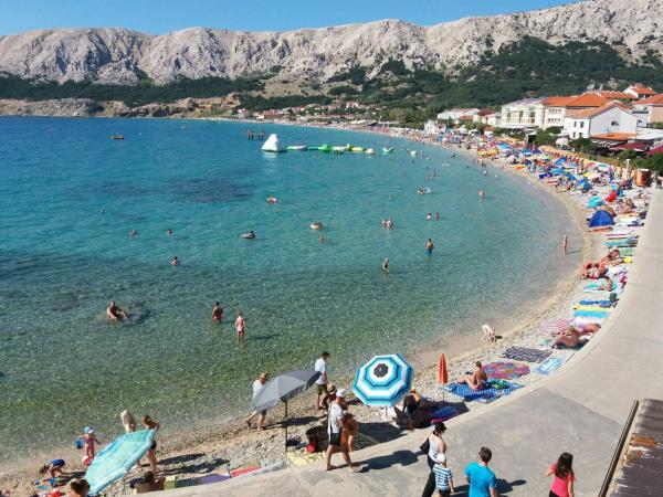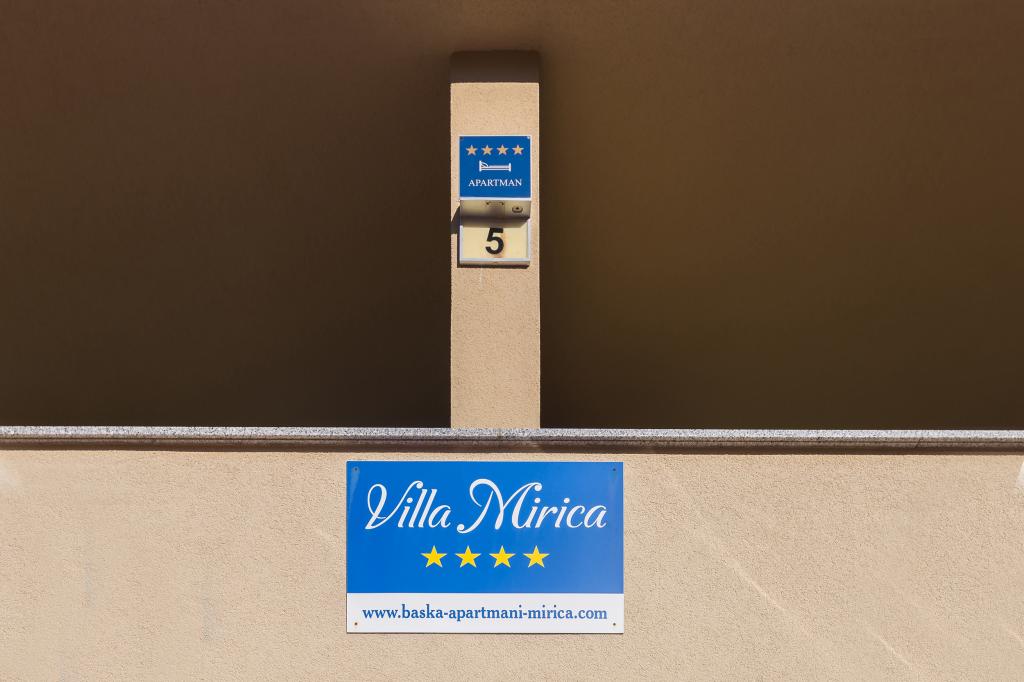Villa Mirica 4 zvjezdice-ima 4 moderno, kompletno i suvremeno opremljena apartmana (2 i 2). Površina: 40 m², i 10 m2 natkrivene privatne terase u mirnom predjelu Baške s pogledom na vrt i mirnu ulicu. Objekt se nalazi do 5 minuta laganog hoda do Vele plaže i svih sadržaja. Prekrasni apartmani Mirica imaju jednu dvokrevetnu sobu, kupaonicu s tušem, fen za kosu, perilica rublja i deterdžent, kuhinja sa suđem, frižder i frizer, dnevni boravak s kaučem na razvlačenje i 5 cm nadmadrac za udobnost, daska za peglanje i pegla, toster, kuhalo vode, mikrovalna, friteza na vrući zrak. Jedan apartman može primit do 4 gosta. Apartmani su moderno opremljeni, s besplatnim Wi-Fi, blesplatnim parkingom natkriveno solarnim panelima, klima uređaj, privatna terasa, TV, SAT, sef, posteljina, ručnici. Sva 4 naša apartmana su podjednaka i identično opremljena. Na parkingu se nalazi električna punionica vozila na upit. U vrtu izgrađen roštilj kojeg gosti mogu koristiti. Dječji krevetić i hranilica na upit.