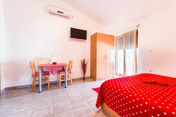 Nudimo vam dva novo uređena studio apartmana različitih veličina. Svaki od njih opremljen je kompletnim kuhinjskim priborom, ručnicima, a po dogovoru, na raspolaganju stoji i roštilj. Moguće je i korištenje vrta. Apartmani imaju i televizore sa satelitskim programima, te klima uređaje. Apartmani Duje imaju terase s pogledom na vrt, a sa terase manjeg apartmana pruža se pogled na more. Za vaša vozila osiguran je parking. More je udaljeno 5 min. hoda