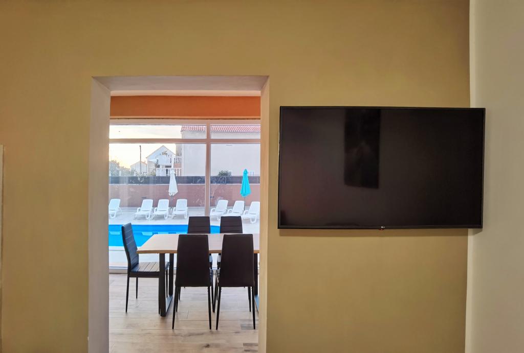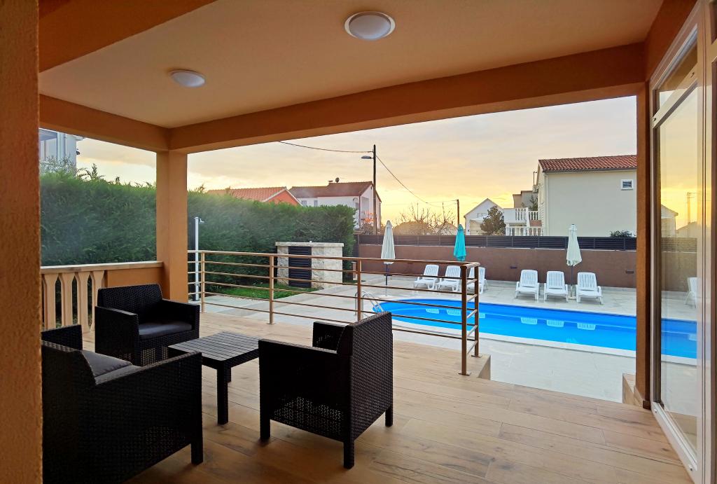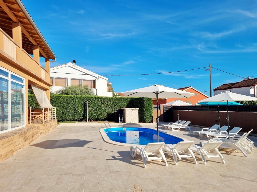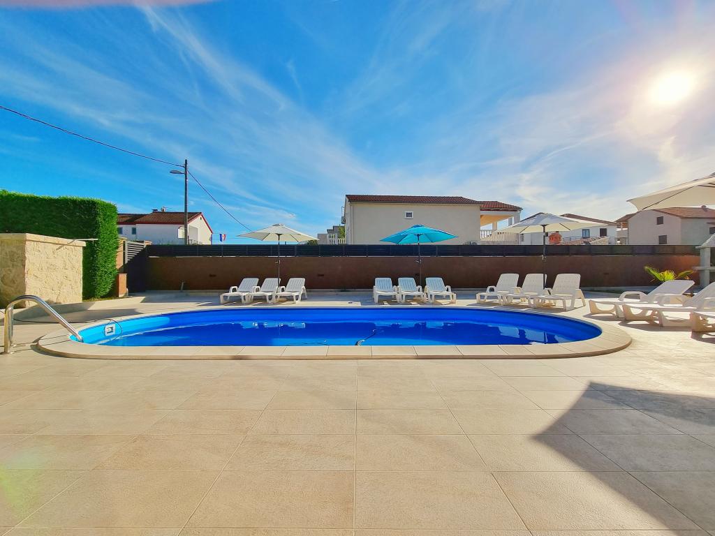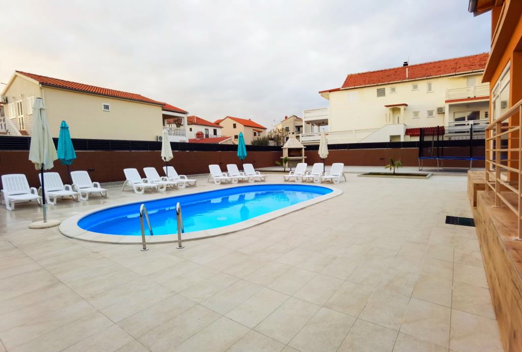 Smještena u Bibinjama, blizu Zadra, ova kuća je idealna za odmor! Samo 5 minuta hoda dijeli vas od plaža, starog sela s restoranima i kafićima, dok su pekara, trgovine te lokalni proizvođači voća i vina udaljeni 2 minute. Kuća je ograđena (2 m visine) za privatnost i ima dva apartmana, svaki od 90 m², s 2 spavaće sobe, kuhinjom, dnevnim boravkom, 2 kupaonice i velikim terasama. U dvorištu se nalaze veliki parking, bazen (8x4 m) i roštilj za zajedničko korištenje. Posjetite obližnji Zadar, Morske orgulje i nacionalne parkove za nezaboravne izlete! Bazen je u funkciji u vremenu od 15.05.2025 do 15.10.2025 godine.