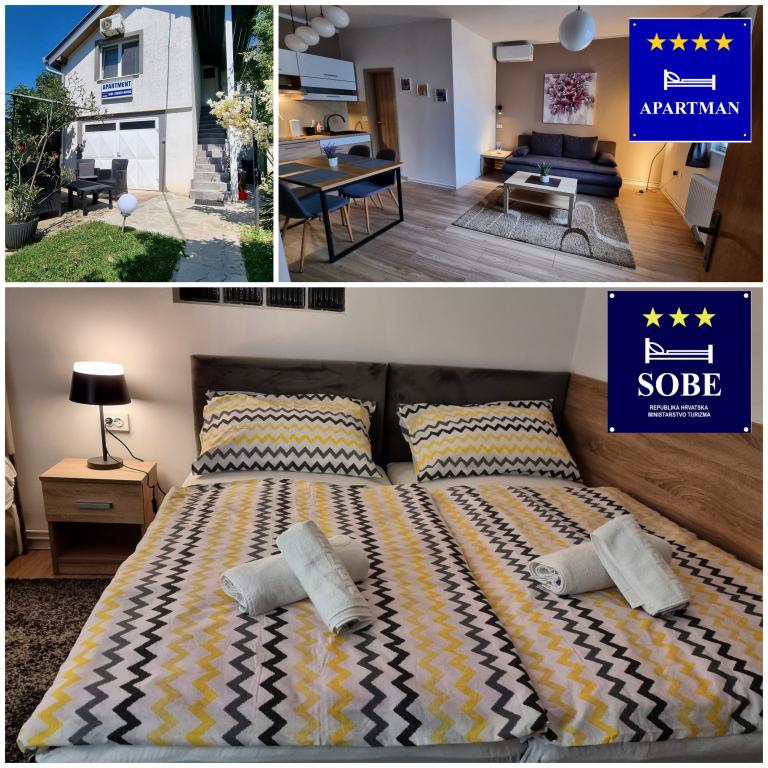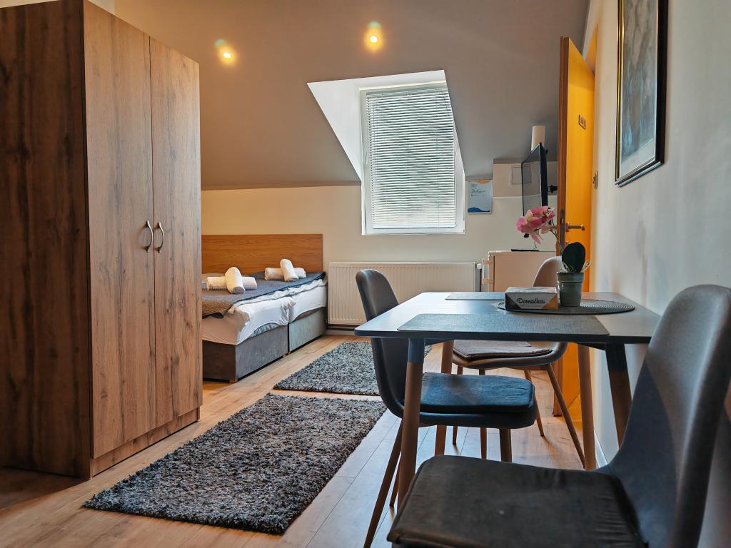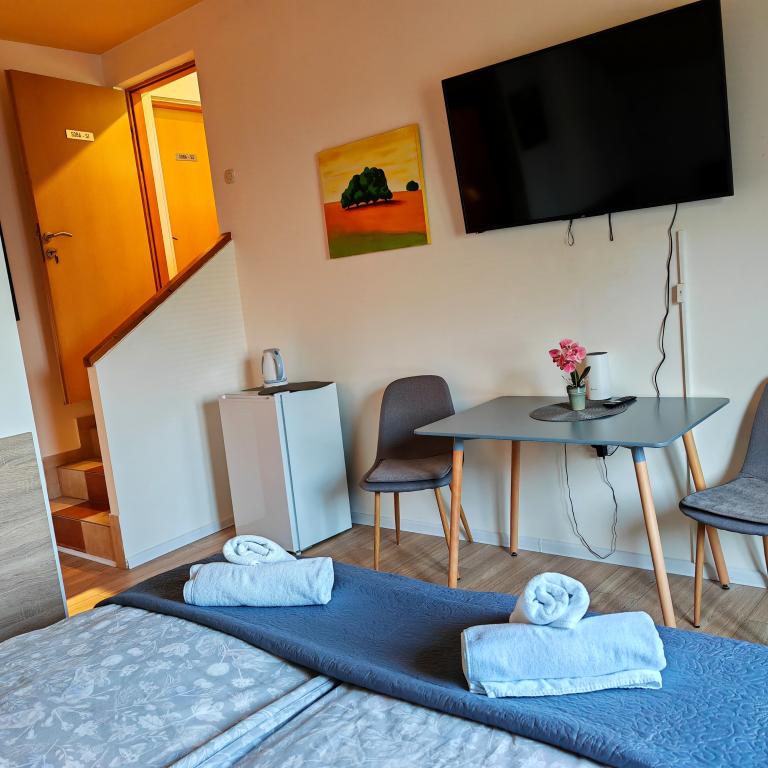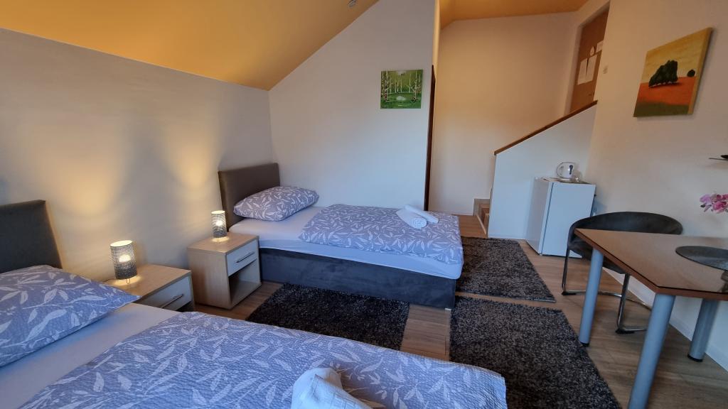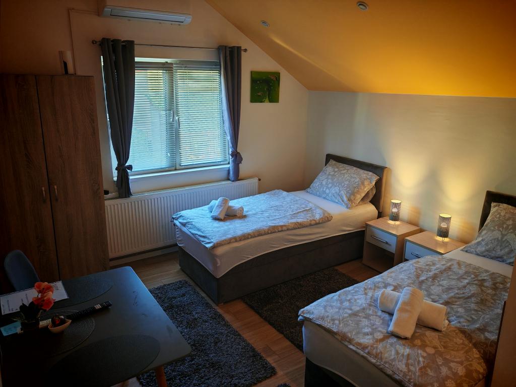 Privatan smještaj Corina suvremeno i komforano opremljene sobe i apartman u mirnom mjestu Bilje predgrađu Osijeka, 3 km od parka prirode Kopački rit,te 5 km od grada Osijeka(Tvrđe).Boraveći u našem smještaju možete uživati u blagodatima prirode, te se probudit uz miris svježeg cvijeća i cvrkut ptica. Soba (dvokrevetna 23 m2) Sadržaji sobe: -pogled na vrt -SMART TV 126 cm (internet televizija,Netflix) - klima-uređaj - glačalo - blagavaonski stol sa dvije stolice - centralno grijanje -mreža protiv komaraca -ormar - kupatilo s tuš kadom i wc-om - sušilo za kosu - besplatne toaletne potrepštine - posteljina - besplatan wi-fi internet. Soba trokrevetna (25 m2) Sadržaji sobe: -pogled na vrt -SMART TV 110 cm (internet televizija,Netflix) - klima-uređaj - glačalo - blagavaonski stol sa dvije stolice - centralno grijanje -mreža protiv komaraca - kupatilo sa tuš kadom i wc Apartman 46 M2 pogled na vrt -SMART TV 120 cm (internet televizija-dnevni boravak) Smart TV 126 cm spavaća soba perilica