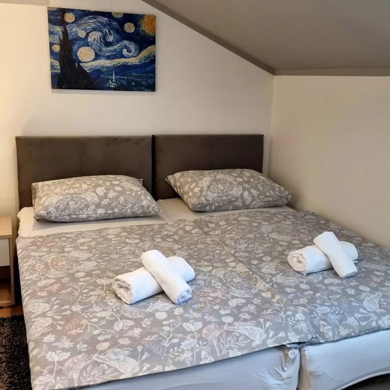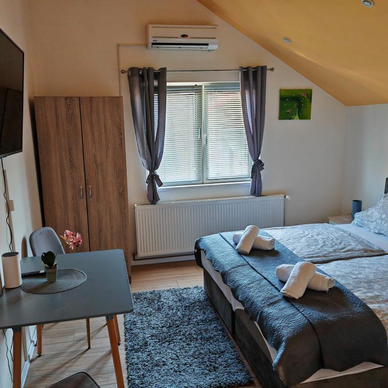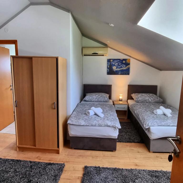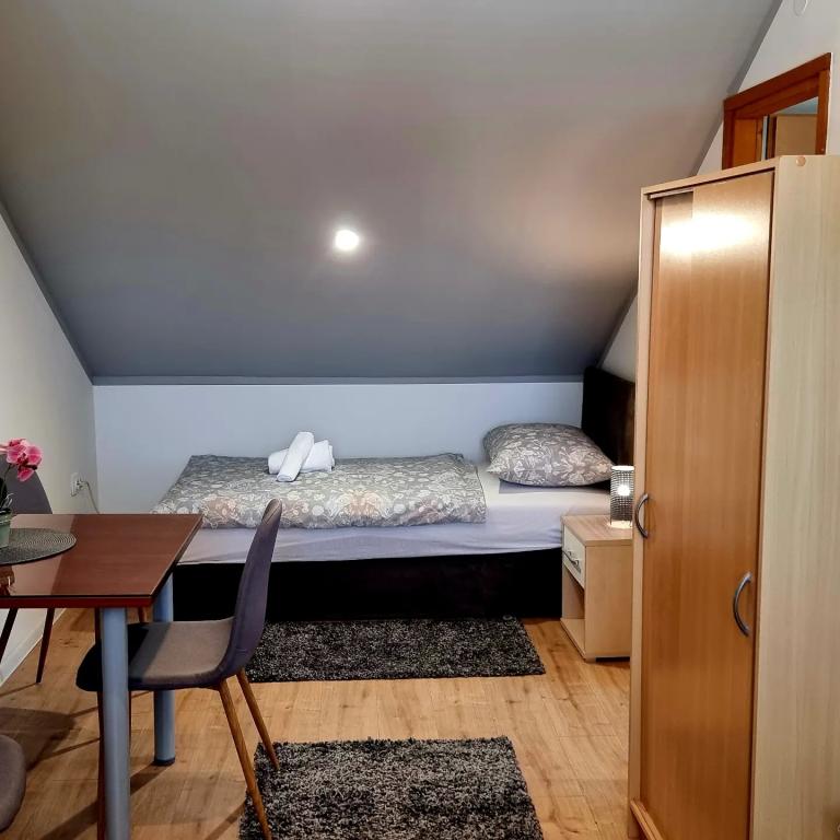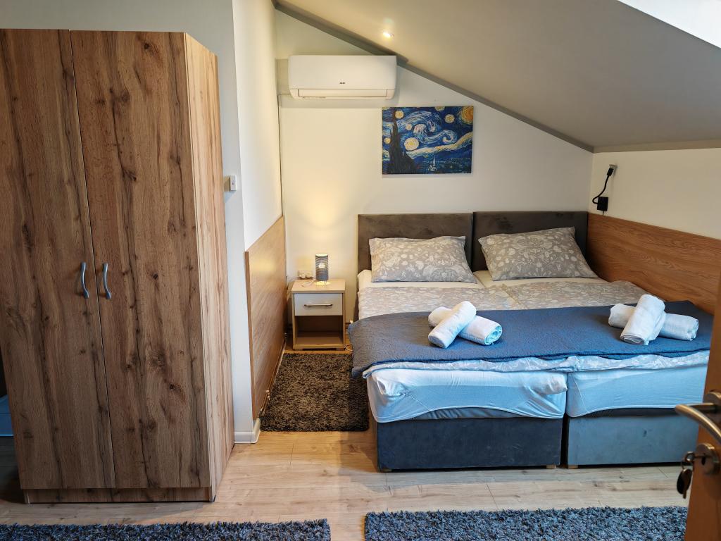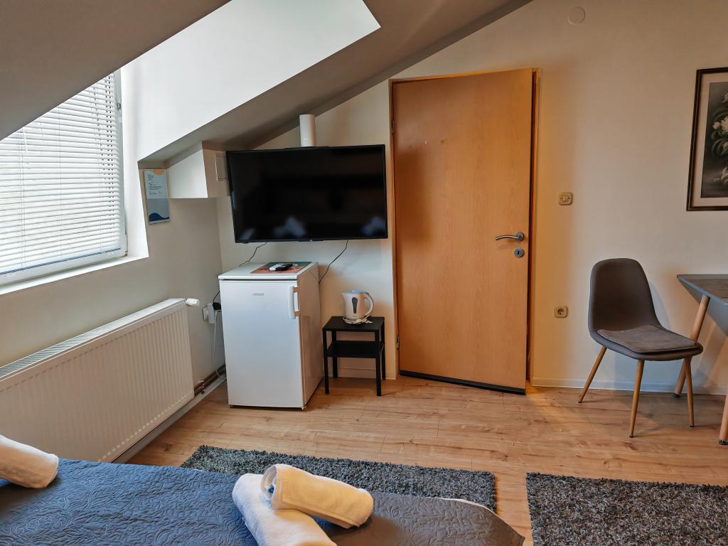 Privatan smještaj Corina suvremeno i komforano opremljene sobe i apartman u mirnom mjestu Bilje predgrađu Osijeka, 3 km od parka prirode Kopački rit,te 5 km od grada Osijeka(Tvrđe).Boraveći u našem smještaju možete uživati u blagodatima prirode, te se probudit uz miris svježeg cvijeća i cvrkut ptica. Soba (dvokrevetna 23 m2) Sadržaji sobe: -pogled na vrt -SMART TV 126 cm (internet televizija,Netflix) - klima-uređaj - glačalo - blagavaonski stol sa dvije stolice - centralno grijanje -mreža protiv komaraca -ormar - kupatilo s tuš kadom i wc-om - sušilo za kosu - besplatne toaletne potrepštine - posteljina - besplatan wi-fi internet. Soba trokrevetna (25 m2) Sadržaji sobe: -pogled na vrt -SMART TV 110 cm (internet televizija,Netflix) - klima-uređaj - glačalo - blagavaonski stol sa dvije stolice - centralno grijanje -mreža protiv komaraca - kupatilo sa tuš kadom i wc Apartman 46 M2 pogled na vrt -SMART TV 120 cm (internet televizija-dnevni boravak) Smart TV 126 cm spavaća soba perilica