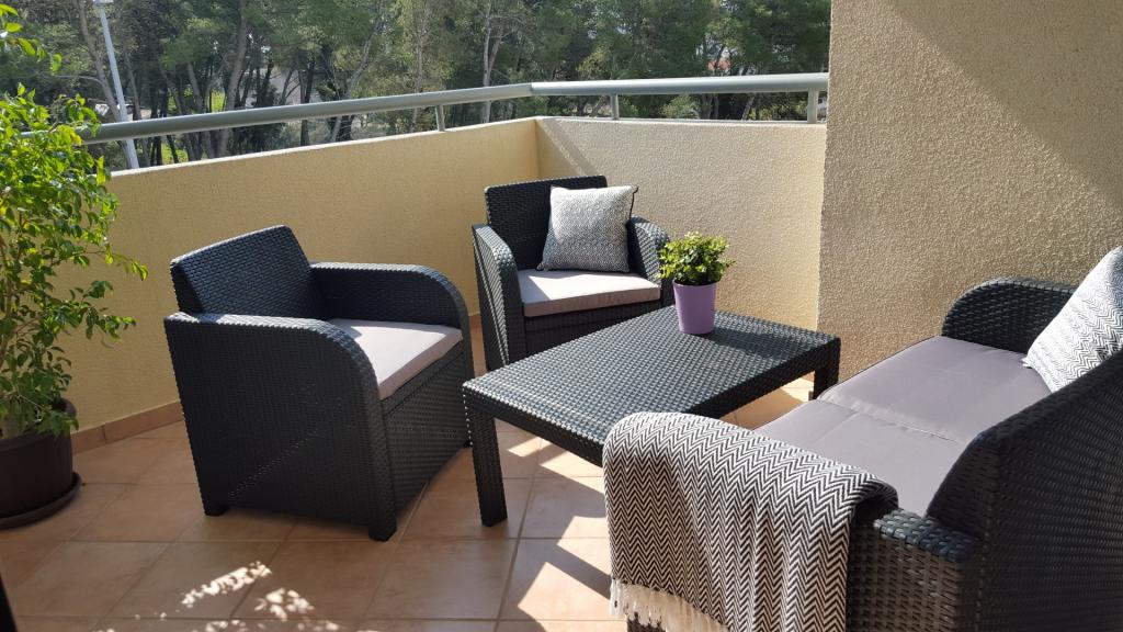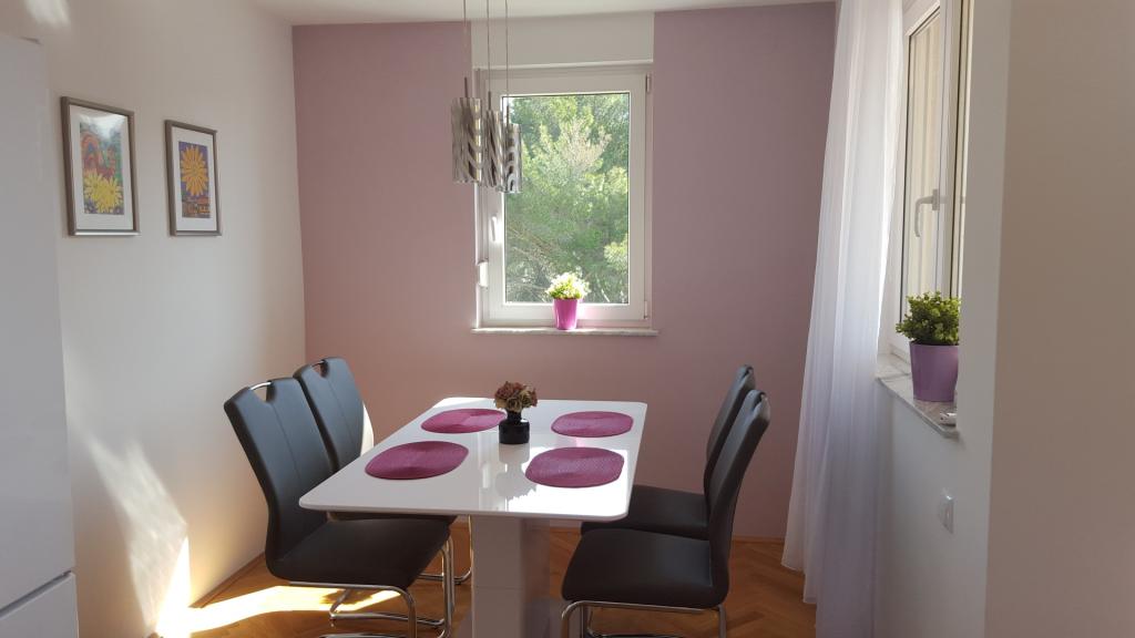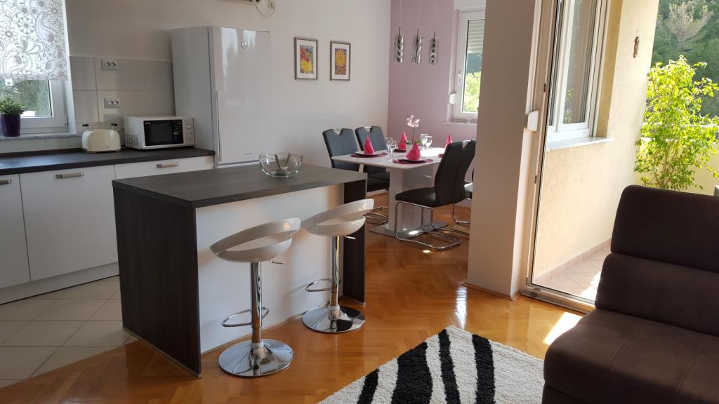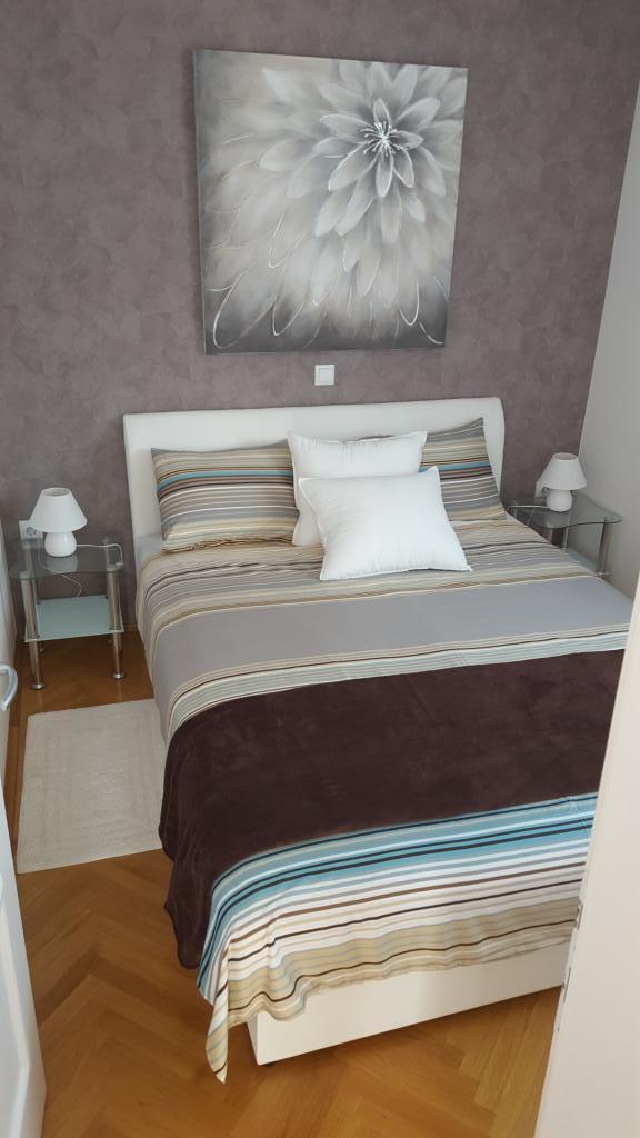 Apartman je novo moderno uređen i opremljen svim uređajima. Objekt se nalazi u mirnom predjelu, 4 kuća od mora i plaže, sa punim pogledom na more. Od centra udaljen 1200 m.