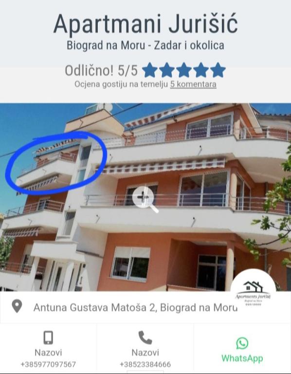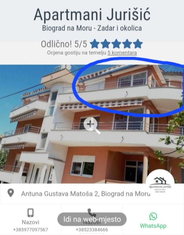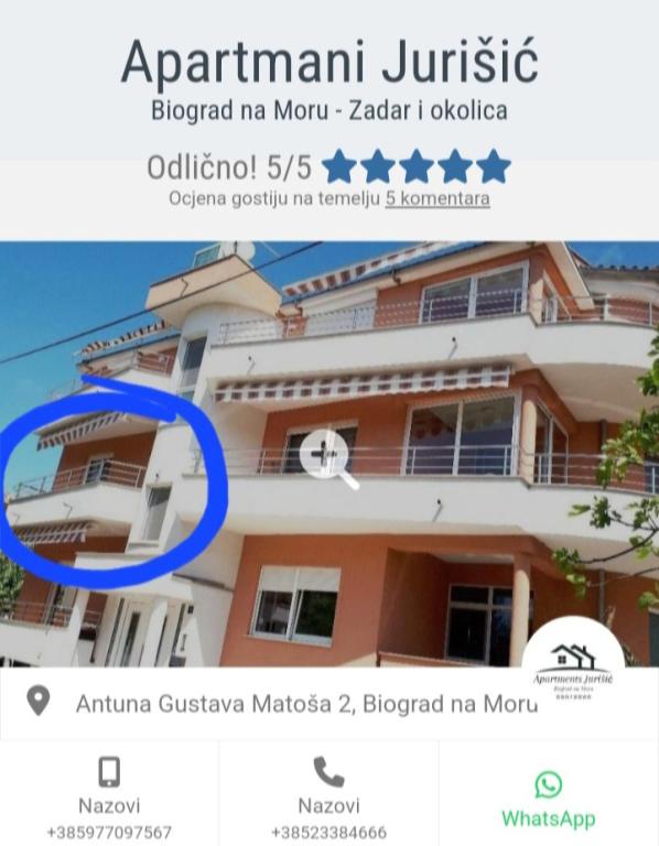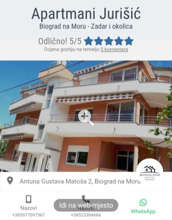 Mi smo obitelj Jurišić koja ima dugu tradiciju bavljenja turizmom, više od 40 godina. U mirnom dijelu centra grada Biograda na Moru (kod hotela "Ilirija") nalaze se naše dvije kuće, smještene svega 50-tak metara od mora, šetnice, rive i ostalih sadržaja... restorana, dućana, pošte... Svi apartmani imaju klimatiziran smještaj (u svakoj sobi i dnevnom boravku nalazi se klima uređaj), na prozorima su mrežice (zaštita od komaraca), te svaki od apartmana ima svoj balkon, osiguran parking, Wi-fi i roštilj na korištenje. Cijene (po terminima) navedene su u cjeniku svakog od apartmana (pomoćni ležaj - kauč za dodatne 2 osobe/djece plaća se +10 eura/noć).