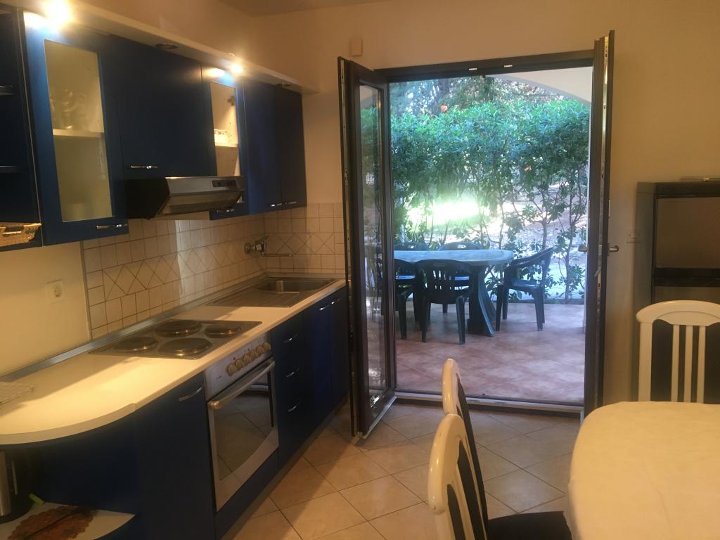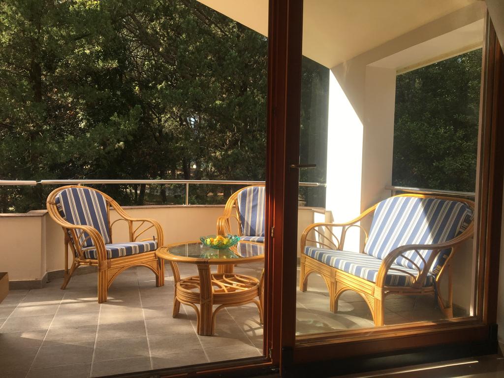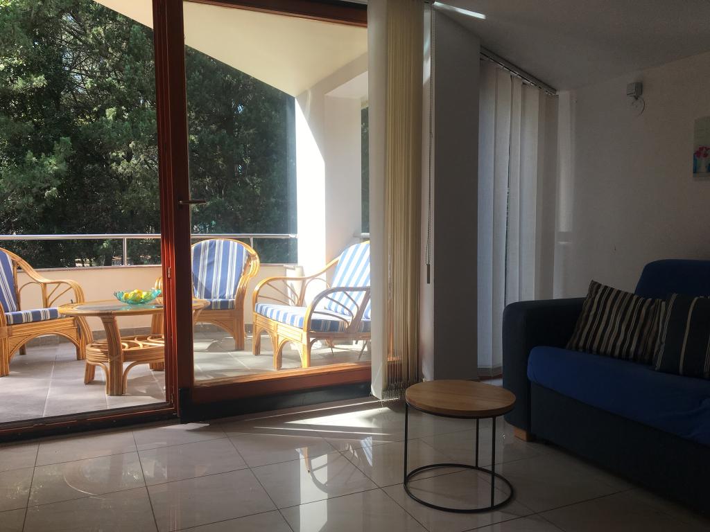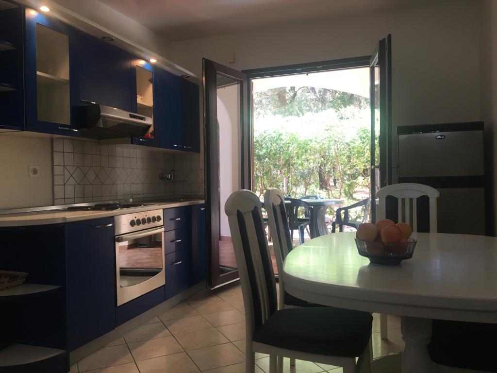 apartman ima dvije spavaće sobe, dnevni boravak, kuhinju s blagavaonom, kupaonicu s tuš kabinom i WC. Ima svoj vlastiti parking, Wi-Fi, klimatiziran je i opremljen između ostalog i perilicom rublja, a raspolaže i velikom terasom te roštiljem (grillom). Iz kuhinje se izlazi na natkriveni dio terase što pruža mogućnost objedovanja vani. Terasa je skrivena od pogleda zelenom ogradom i pruža mogućnost sunčanja. Apartman se nalazi u borovoj šumi cca 250 m od glavne plaže (plaža Soline) u Biogradu, a istovremeno nije daleko niti od centra Biograda (rive). U neposrednoj blizini apartmana (cca 150m od apartmana) nalaze se teniski tereni kao i drugi sadržaji.