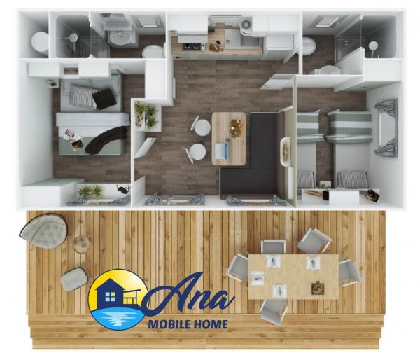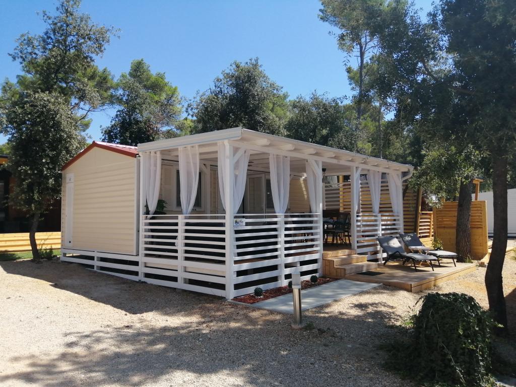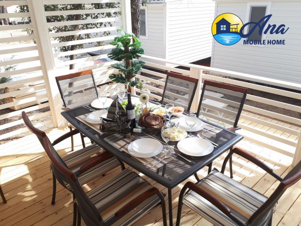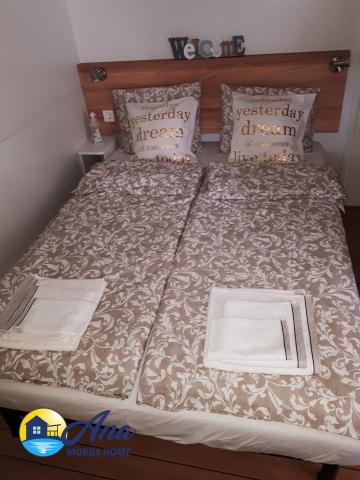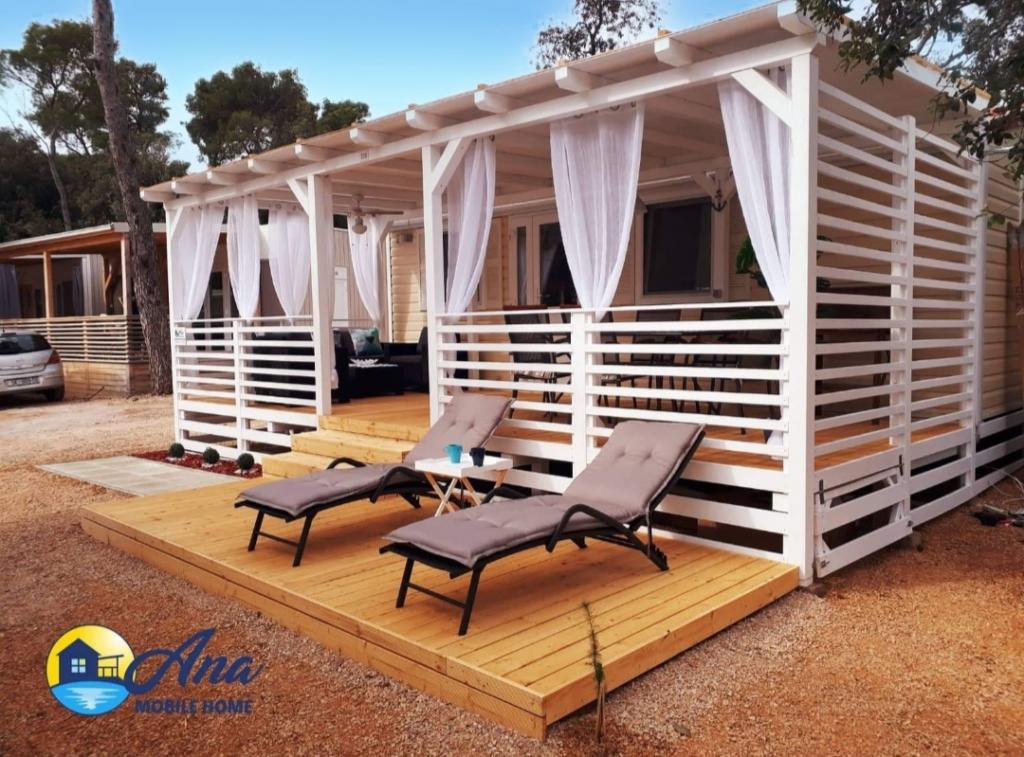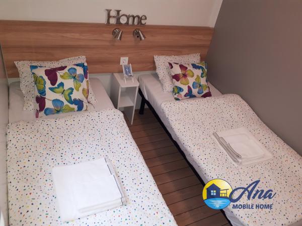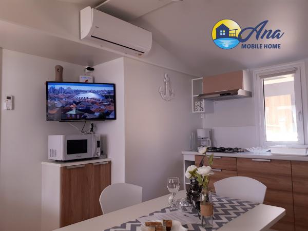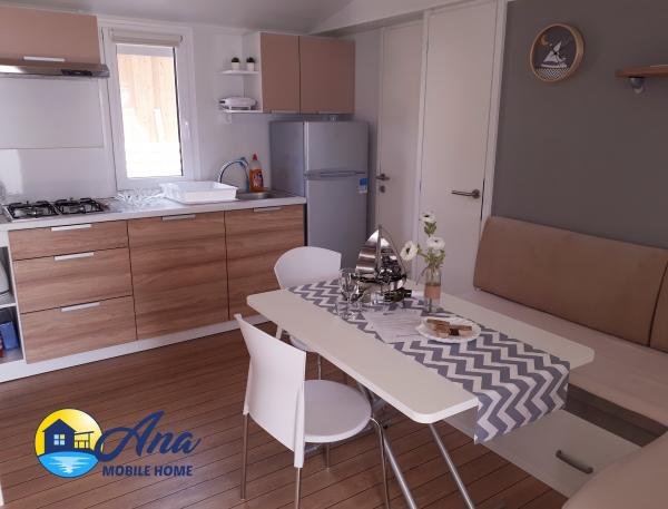 Mobile Home Ana je nova, kompletno i suvremeno opremljena mobilna kućica. Kućica ima spavaću sobu s bračnim krevetom, spavaću sobu s odvojenim krevetima te dvije kupaone s prostranim tuš kadama s ručnicima. Kuhinja je kompletno opremljena, klima uređajem, mikrovalnom, kuhalo za vodu, aparatom za kavu, tosterom, glačalom, hladnjakom sa ledenicom te priborom koji je potreban za ugodan boravak. U dnevnom boravku nalazi se trosjed i stol sa 2 stolice. Na prostranoj terasi nalazi se trosjed, fotelja i stol za dnevni odmor te dio s ležaljkama za relaksaciju i dio sa stolom i šest stolica za objedovanje na otvorenom ili samo ispijanje kavice te velikim vanjskim ventilatorom pogodnim za ugodan boravak. Terasa je opremljena i prozračnim zavjesama koje odaju dašak svježine. Na terasi se nalazi i električni roštilj i pekač. Parking mjesto uz kućicu, udaljenost do mora 5 min lagane šetnje. U sklopu kampa nalazi se predivno dječje igralište, trgovina, Internet/Wi-fi, smart tv te satelitski program