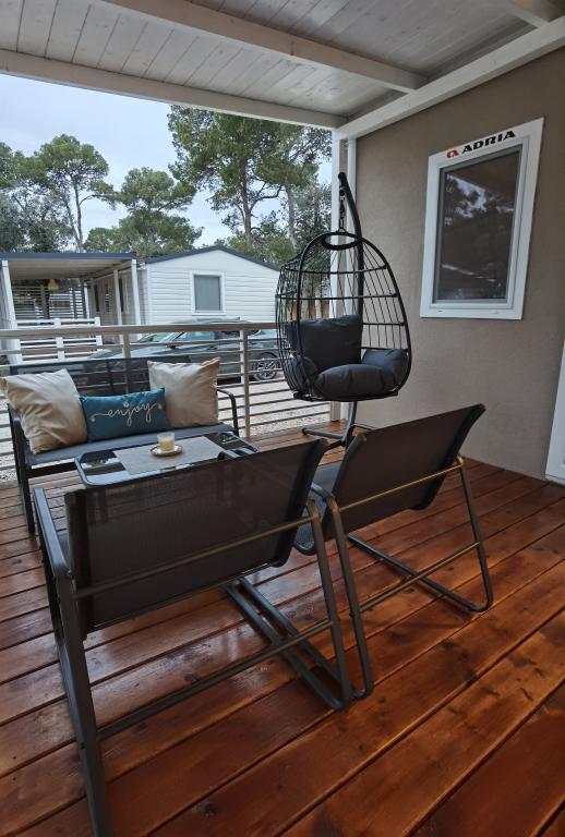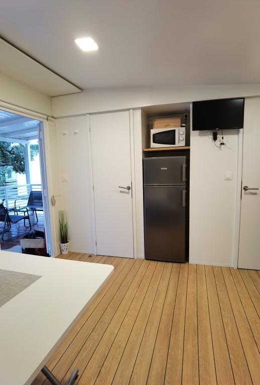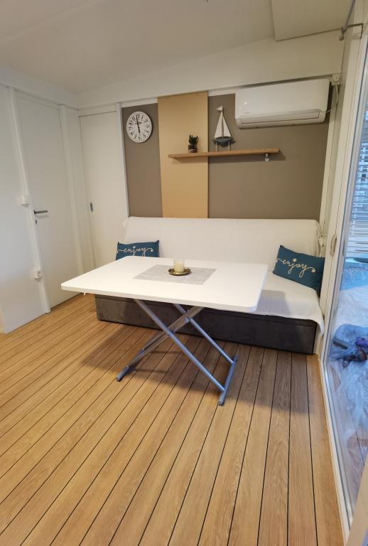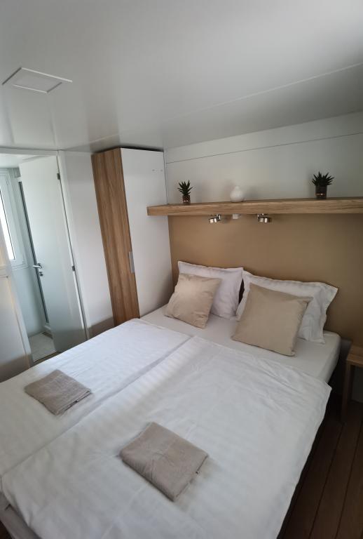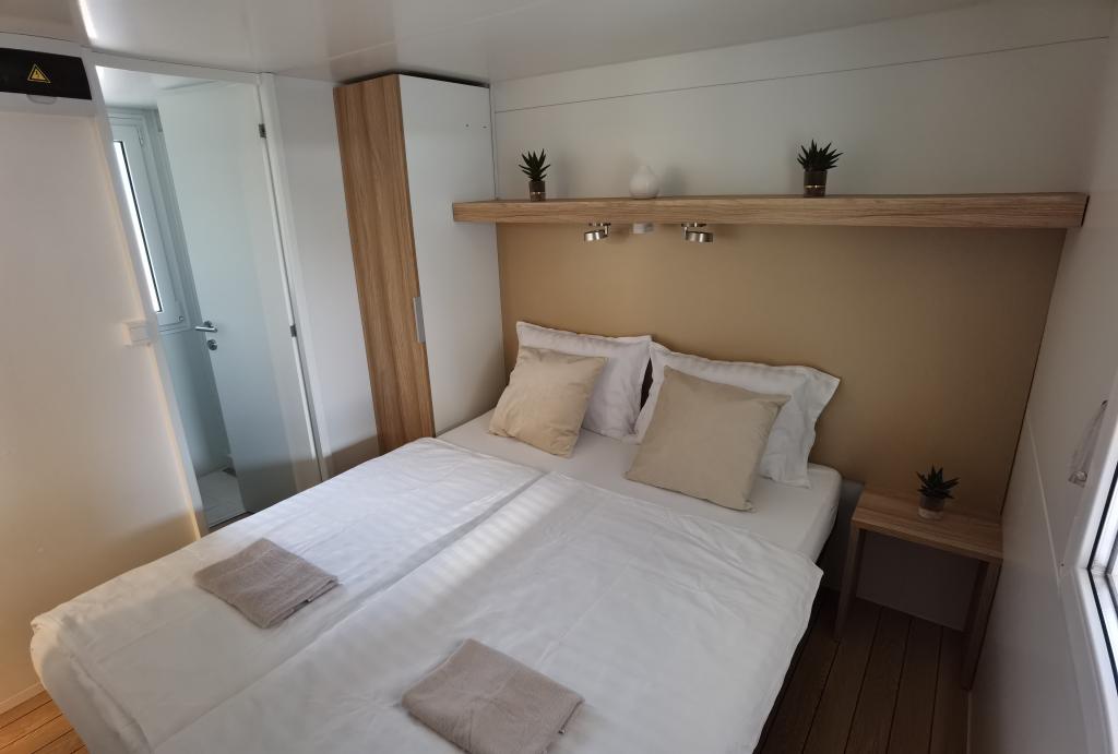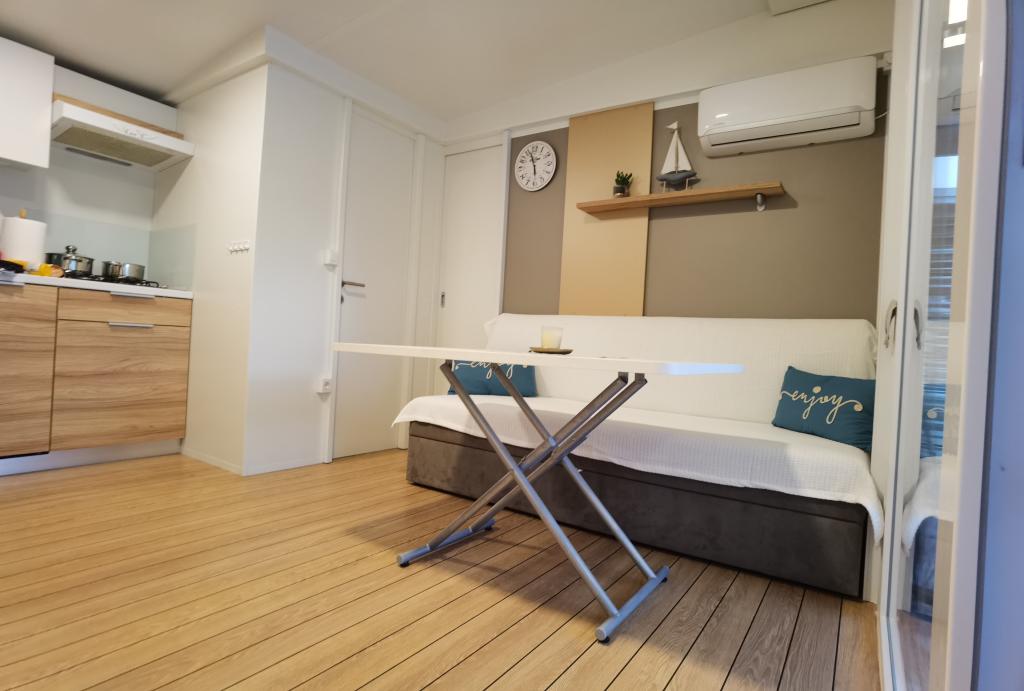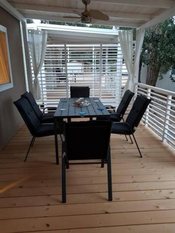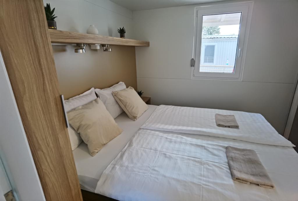 Kompletno i suvremeno opremljena mobilna kućica koja se nalazi u kampu u Solinama veličine 36m2 za 7 ljudi. Kućica ima 3 sobe, jedna sa bračnim krevetom, te dvije sobe sa po dva kreveta za jednu osobu. U kućici se nalaze i dvije kupaonice. Kuhinja je kompletno opremljena, uključujući i perilicu posuđa, mikrovalnu pećnicu, kuhalo za vodu, hladnjak s ledenicom, aparat za kavu, te kompletan pribor koji je potreban za ugodan i neometan boravak u kućici. U dnevnom boravku nalazi se trosjed sa stolom i stolicama i velikim televizorom. U dnevnom boravku je moguće dodati jedan dodatni ležaj za jednu osobu. U kućici se nalazi i klima kako bi boravak u njoj bio ugodan svima u vrijeme vrućih ljetnih mjeseci. Na terasi koja se prostire na 27m2 nalazi se dio s ležaljkama za odmor, te dio sa velikim stolom i šest stolica. Na terasi se nalazi i električni roštilj. Kamp je smješten u sredini borove šume, te je od plaže udaljen 5 minuta lagane šetnje. U kampu je moguće pronaći sve potrebno za ugodan odmor i boravak jer u ponudi ima nekoliko restorana, kafiće, mjenjačnice, mogućnost pranja i sušenja rublja, te se svakodnevno organiziraju različite aktivnosti kako za djecu, tako i za odrasle. Za sve one koji vole aktivniji odmor možete birati između raznih aktivnosti kao što su bicikliranje, ronjenje, stolni tenis, tenis, odbojka na pijesku, skijanje na vodi, jedrenje, te razni izleti u nekoliko nacionalnih parkova koji se nalaze u blizini.
