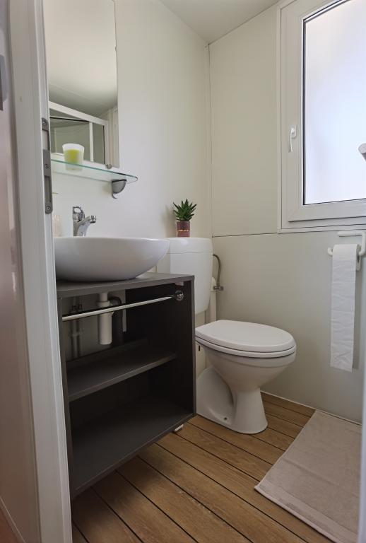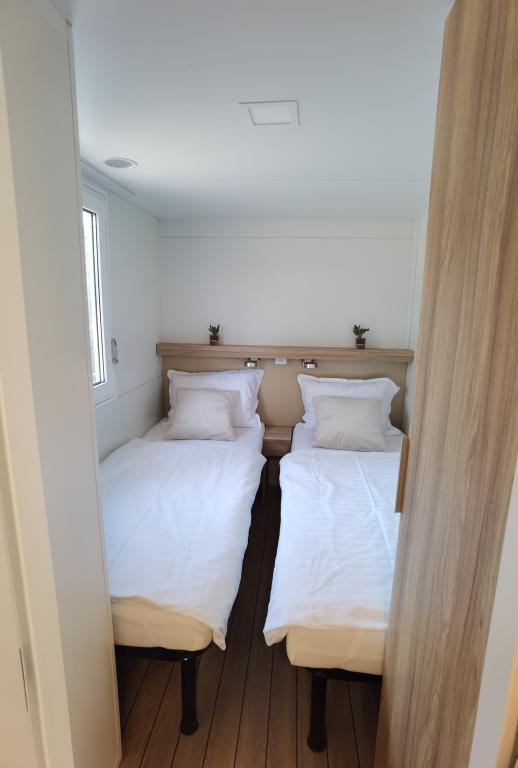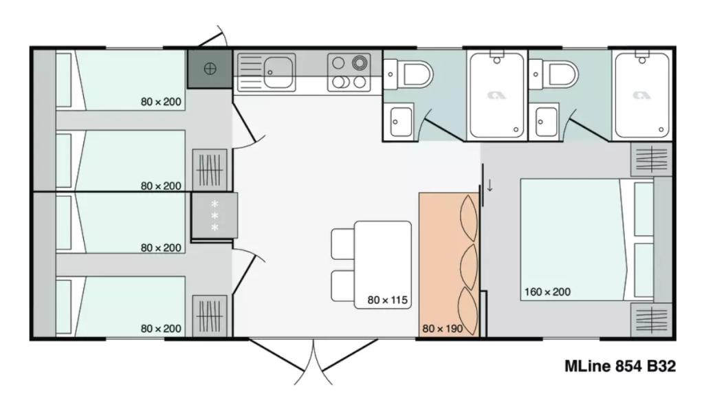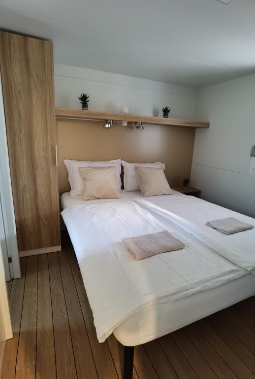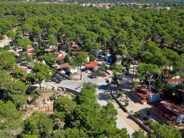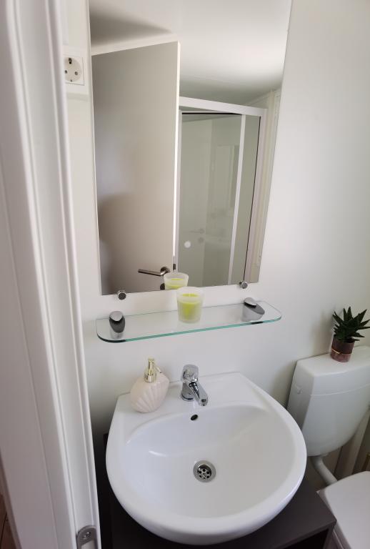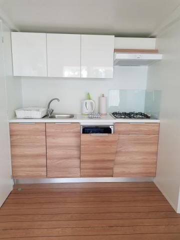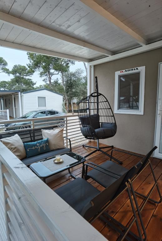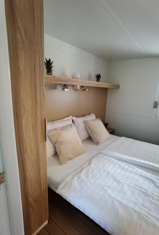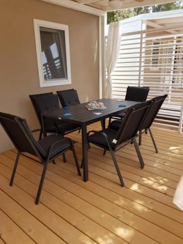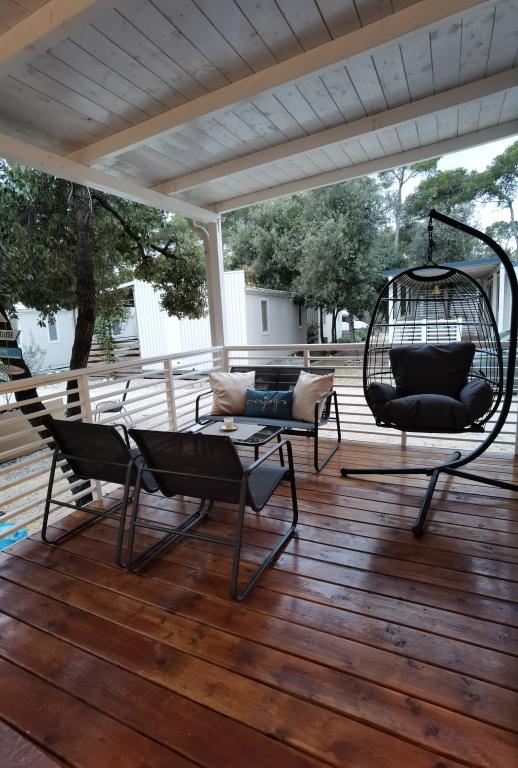 Kompletno i suvremeno opremljena mobilna kućica koja se nalazi u kampu u Solinama veličine 36m2 za 7 ljudi. Kućica ima 3 sobe, jedna sa bračnim krevetom, te dvije sobe sa po dva kreveta za jednu osobu. U kućici se nalaze i dvije kupaonice. Kuhinja je kompletno opremljena, uključujući i perilicu posuđa, mikrovalnu pećnicu, kuhalo za vodu, hladnjak s ledenicom, aparat za kavu, te kompletan pribor koji je potreban za ugodan i neometan boravak u kućici. U dnevnom boravku nalazi se trosjed sa stolom i stolicama i velikim televizorom. U dnevnom boravku je moguće dodati jedan dodatni ležaj za jednu osobu. U kućici se nalazi i klima kako bi boravak u njoj bio ugodan svima u vrijeme vrućih ljetnih mjeseci. Na terasi koja se prostire na 27m2 nalazi se dio s ležaljkama za odmor, te dio sa velikim stolom i šest stolica. Na terasi se nalazi i električni roštilj. Kamp je smješten u sredini borove šume, te je od plaže udaljen 5 minuta lagane šetnje. U kampu je moguće pronaći sve potrebno za ugodan odmor i boravak jer u ponudi ima nekoliko restorana, kafiće, mjenjačnice, mogućnost pranja i sušenja rublja, te se svakodnevno organiziraju različite aktivnosti kako za djecu, tako i za odrasle. Za sve one koji vole aktivniji odmor možete birati između raznih aktivnosti kao što su bicikliranje, ronjenje, stolni tenis, tenis, odbojka na pijesku, skijanje na vodi, jedrenje, te razni izleti u nekoliko nacionalnih parkova koji se nalaze u blizini.