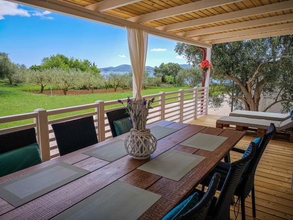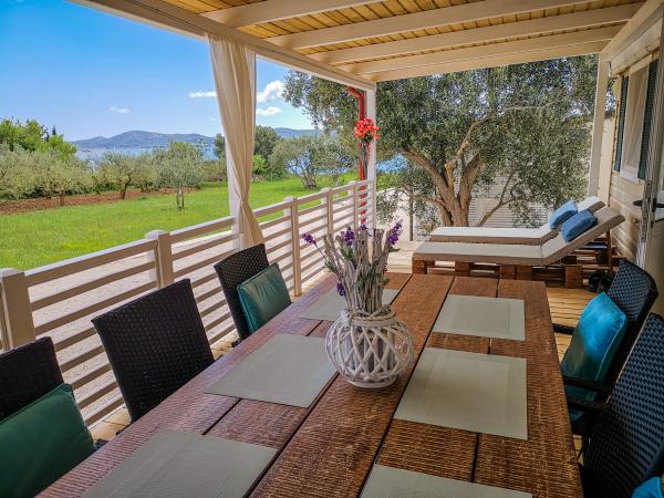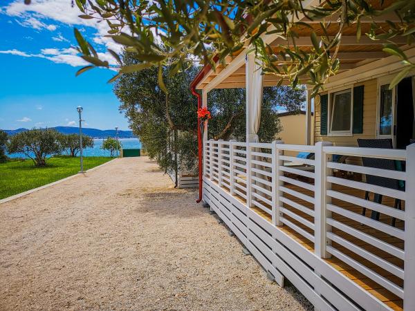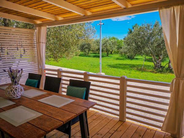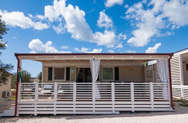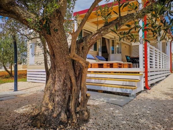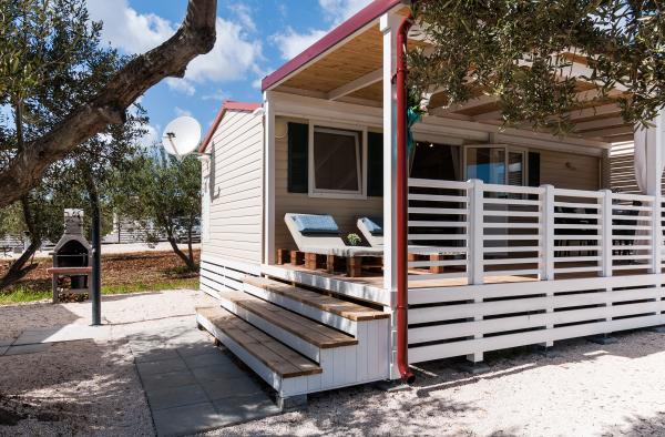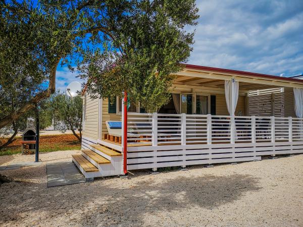 Mobilne kućice nalaze se u kampu TRSTIKE, privatni kamp smješten u masliniku, uz more, u neposrednoj blizini pješčane plaže Trstike i šljunčane plaže Bošana. Ovaj smještaj vam pruža uživanje u prirodi i tišini. Nalazi se nedaleko od centra Biograda na Moru, udaljen svega 15-20 min šetnje uz more, gdje imate sav zabavni i ugostiteljski sadržaj. Obližnji povijesni gradovi Zadar (30 km) i Šibenik (41 km) posjetiteljima pružaju zanimljivu i bogatu hrvatsku kulturnu baštinu. Tematski park Fun Park Mirnovec udaljen je 5, 6 km/10 min vožnje. Mobilna kućica: 2 spavaće sobe (jedna spavaća sa 1 velikim krevetom, druga spavaća ima 2 kreveta za jednu osobu, kutna garnitura za sjedenje (mogućnost pretvaranja u krevet za jednu odraslu osobu ili 2 djece) sa stolom, 2 x tuš/wc, terasa: 26 m2 sa vrtnom garniturom i 2 ležaljke. Ispred kućice nalazi se vanjski tuš i roštilj.