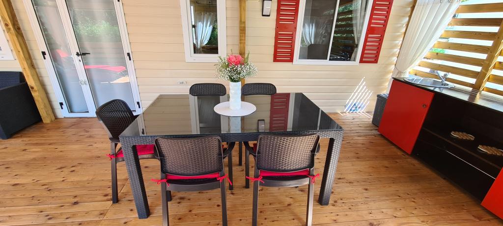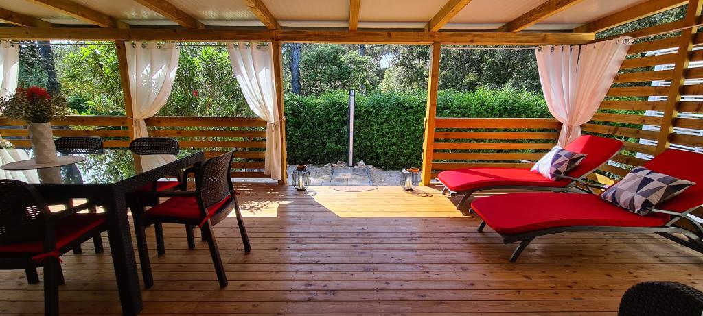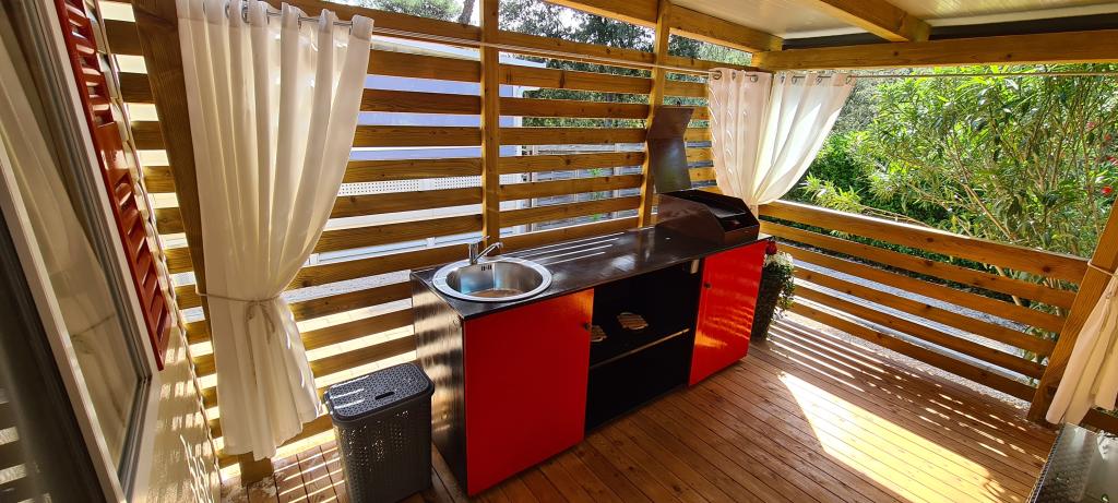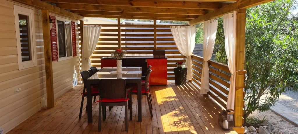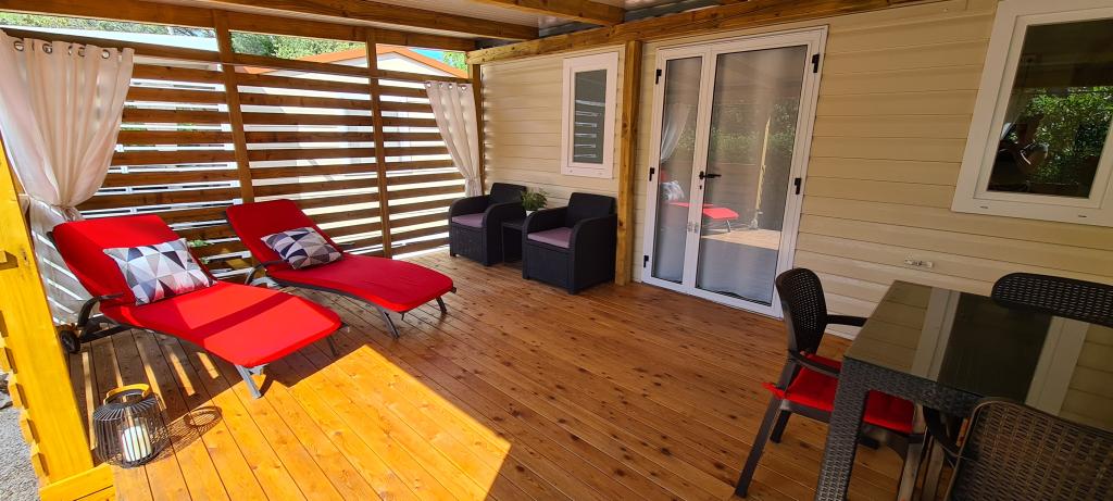 U prvom redu do uvale Soline, zasticena od pogleda, smjestila se Blue Wave Mobile Home II. Potpuno opremljena mobilna kucica s dvije odvojene spavace sobe s garderobnim ormarima, dnevnim boravkom u kojem se nalazi pomocni lezaj na razvlacenje (135x190), potpuno opremljena kuhinja s klima uredajem te velika terasa. Na terasi je smjesten rostilj, blagovanski stol te udobne lezaljke. Bezicni pristup internetu dostupan je u cijelom prostoru besplatno.