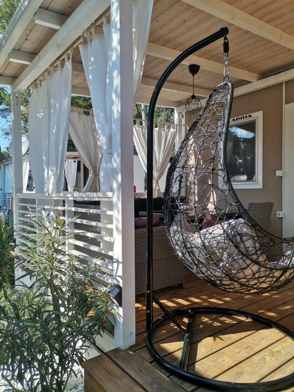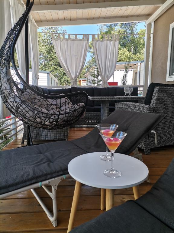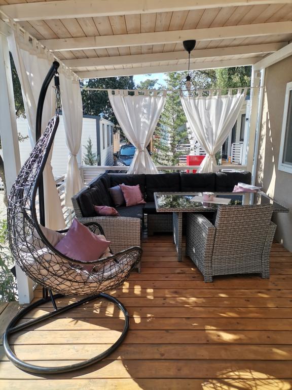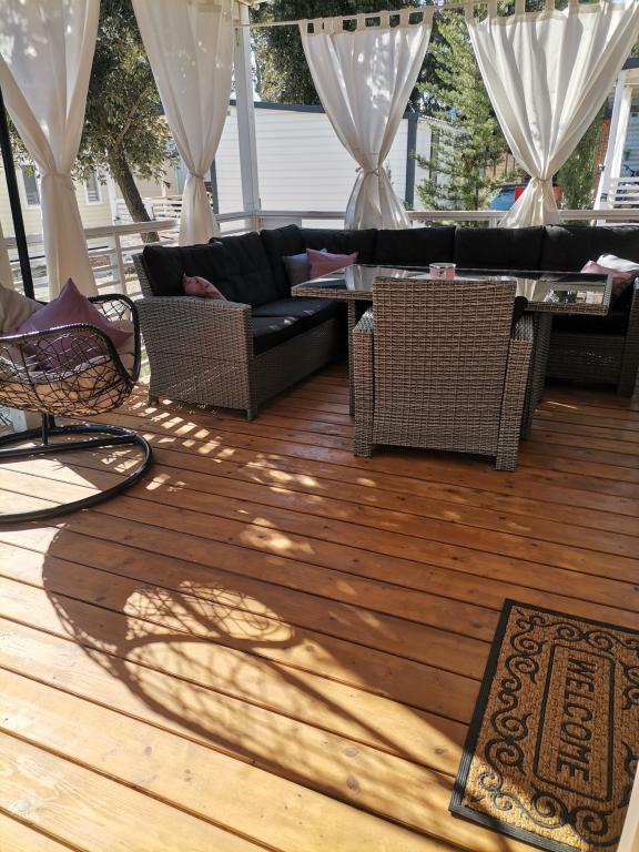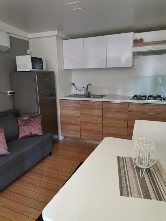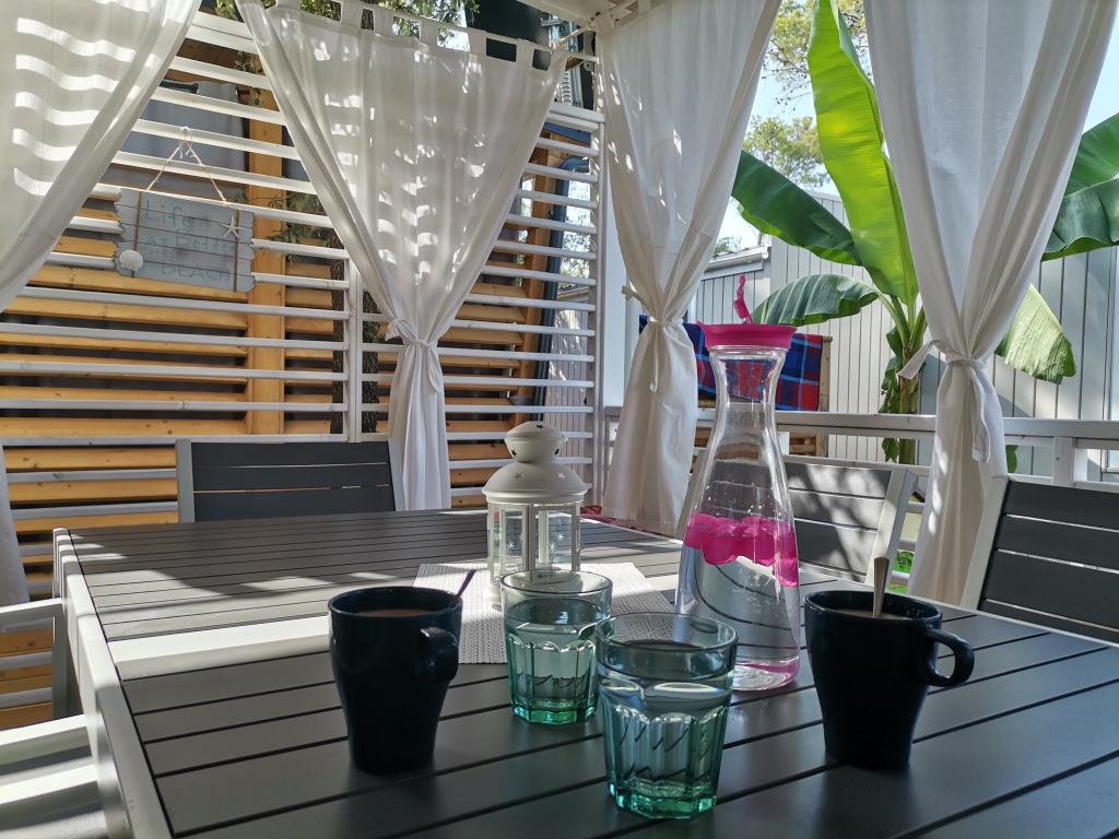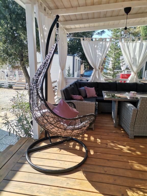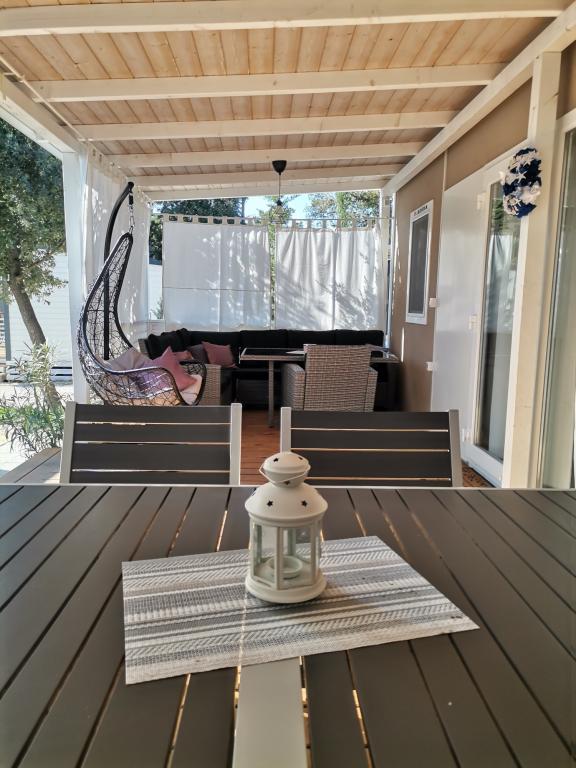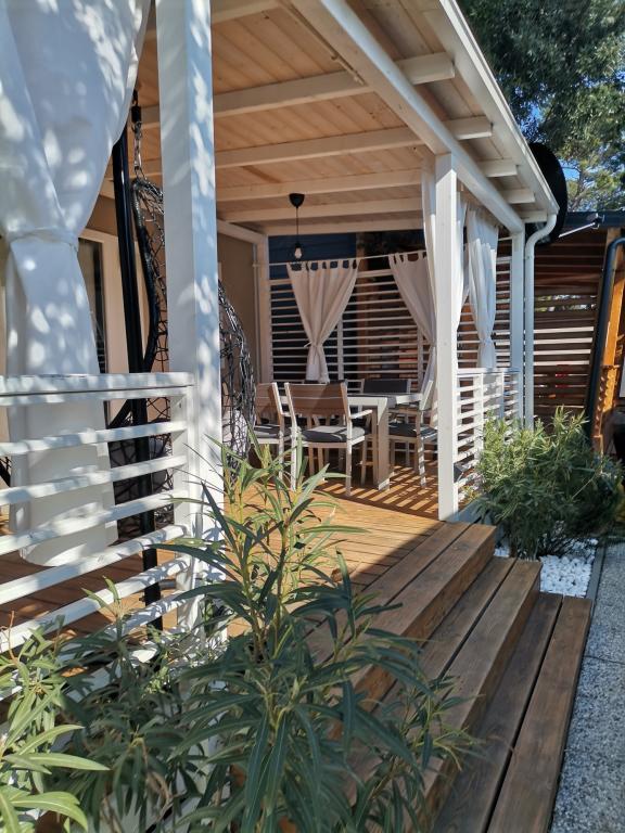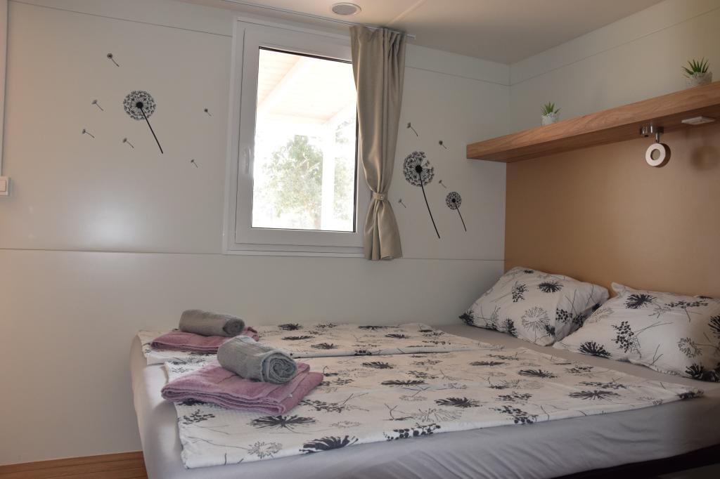 Mobilna kućica se nalazi u Kampu Soline, Biograd na moru. Sastoji se od dvije spavaće sobe, dvije kupaonice, dnevnog boravka sa kuhinjom, te kompletno opremljenom terasom sa vrtnom garniturom, ljuljačkom, stolom za šest osoba i dvijema ležaljkama. Kamp je smješten u borovoj šumi, udaljen je pet minuta od plaže uz koju se nalaze restorani, kafići, aktivnosti za djecu, štandovi sa suvenirima. U kampu se nalazi pekara i bankomat. Uz nadoknadu je moguće pranje rublja najam bicikla, romobila, sup daske, pedalina, teniski terena, ronjenja i itd.