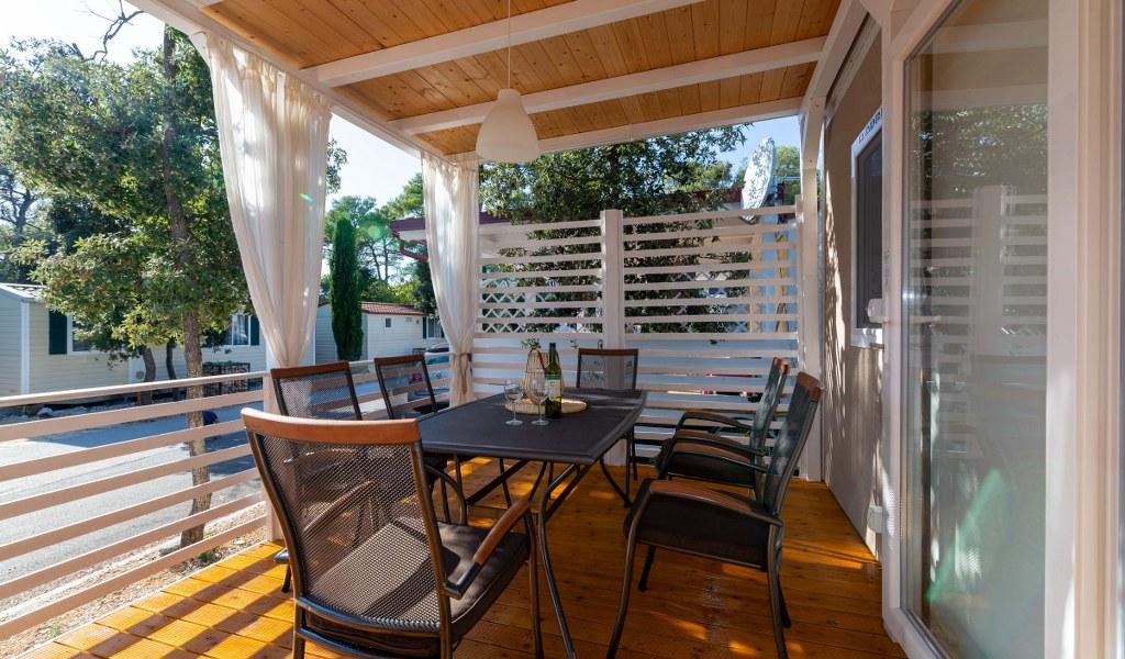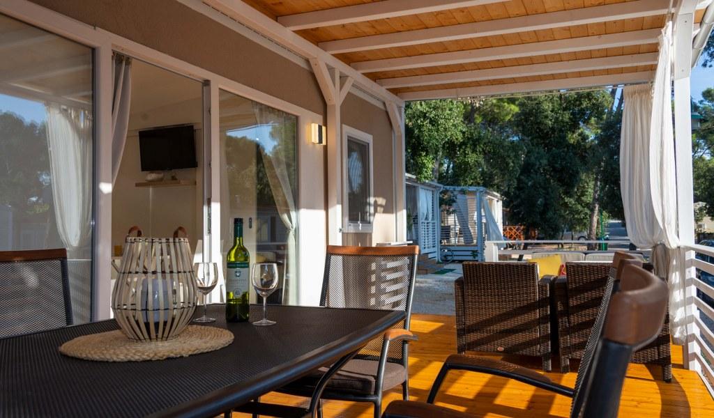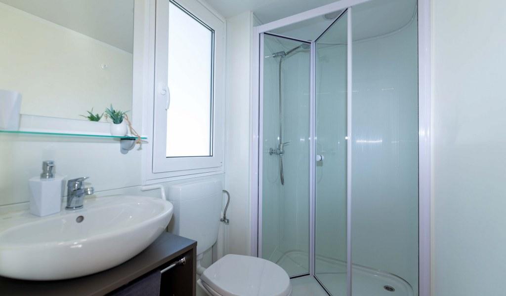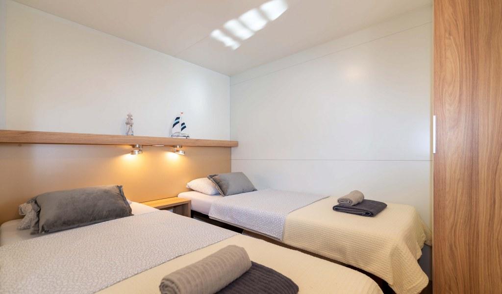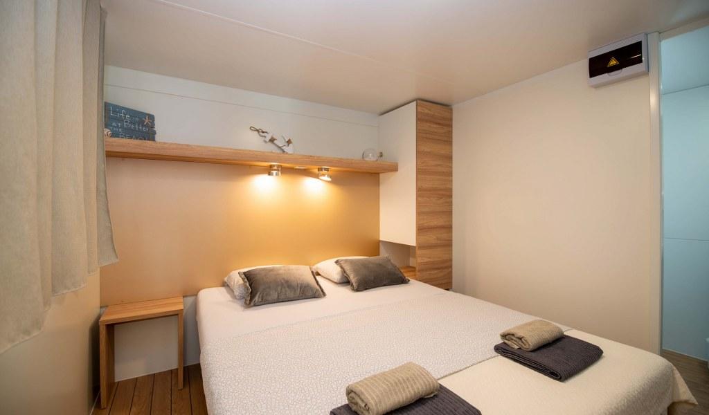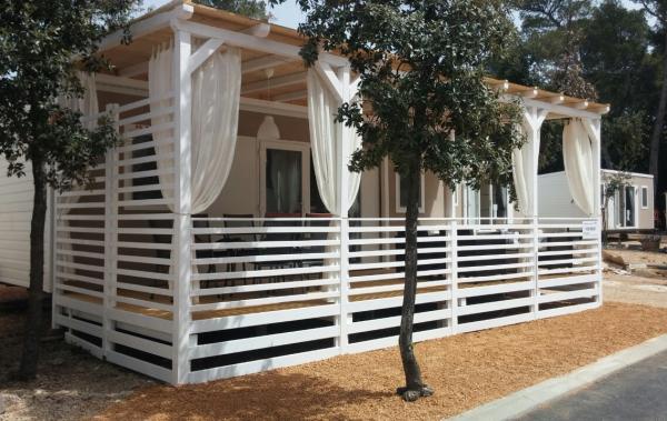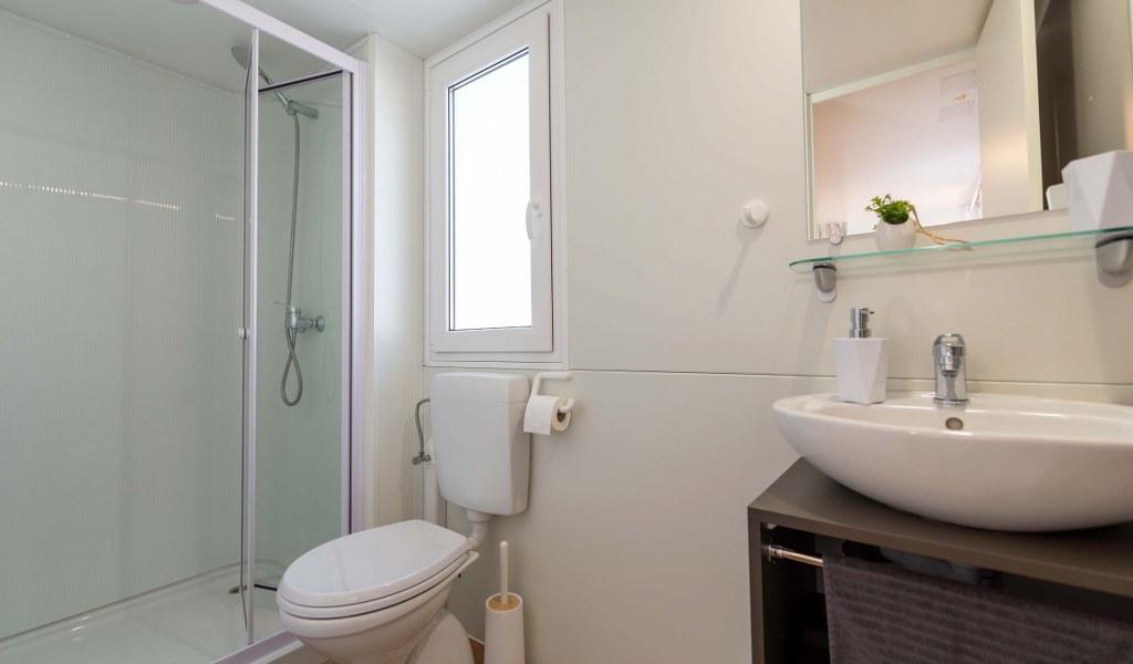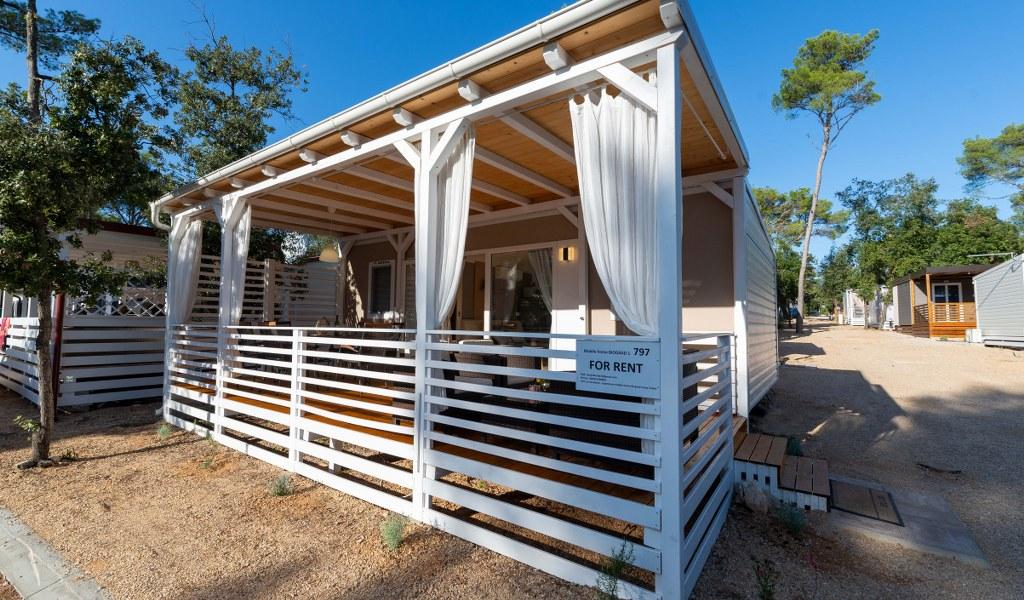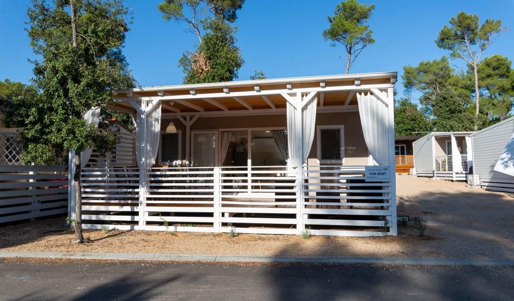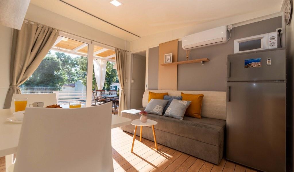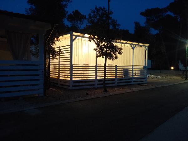 Nova, moderno i potpuno opremljena mobilna kućica sa dvije sobe, dnevnim boravkom u kojem se nalazi krevet na razvlačenje(135x180cm), potpuno opremljena kuhinja sa SAT TV, klimom, WI-FI, mikrovalnom, el. roštilj, malim kućanskim aparatima i dr, DVIJE KUPAONICE i velikom terasom 7, 5 X 3 metra, nalazi se u miru borove šume u kampu Soline u Biogradu na moru. Objekt je udaljen od plaže, caffe bara, restorana 250 metara, a u kampu se nalazi dječje igralište, aparati za pranje i sušenje rublja, bankomat, trgovina, pekara i sve što Vam je potrebno za ugodan boravak! U neposrednoj blizini kampa oko 1500 metara nalazi se središte Biograda u kojem su razni sadržaji, kao i marina Kornati!