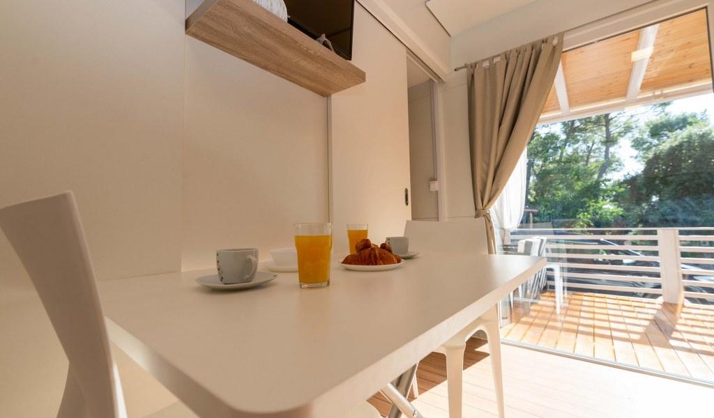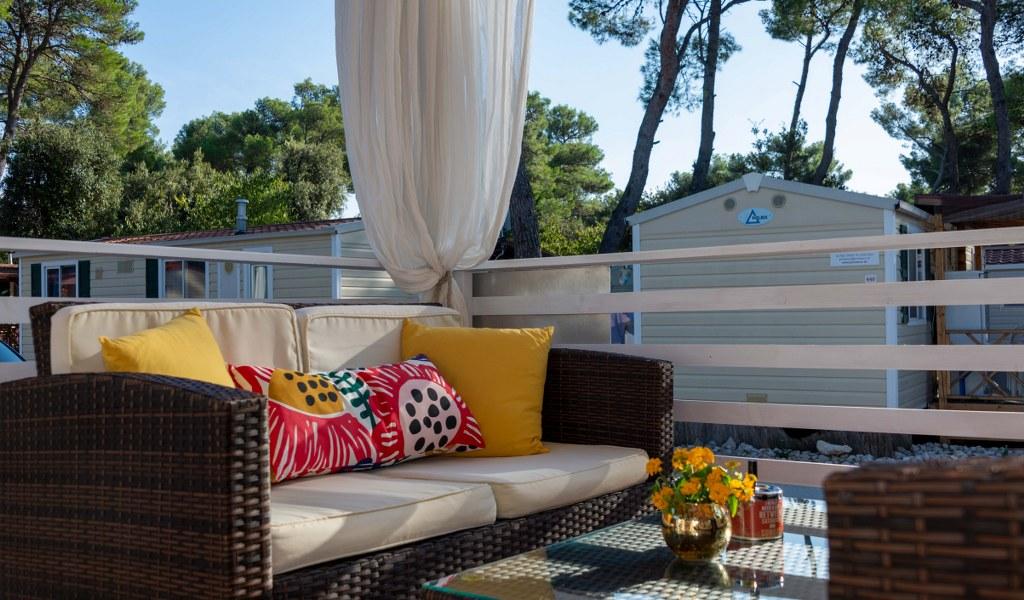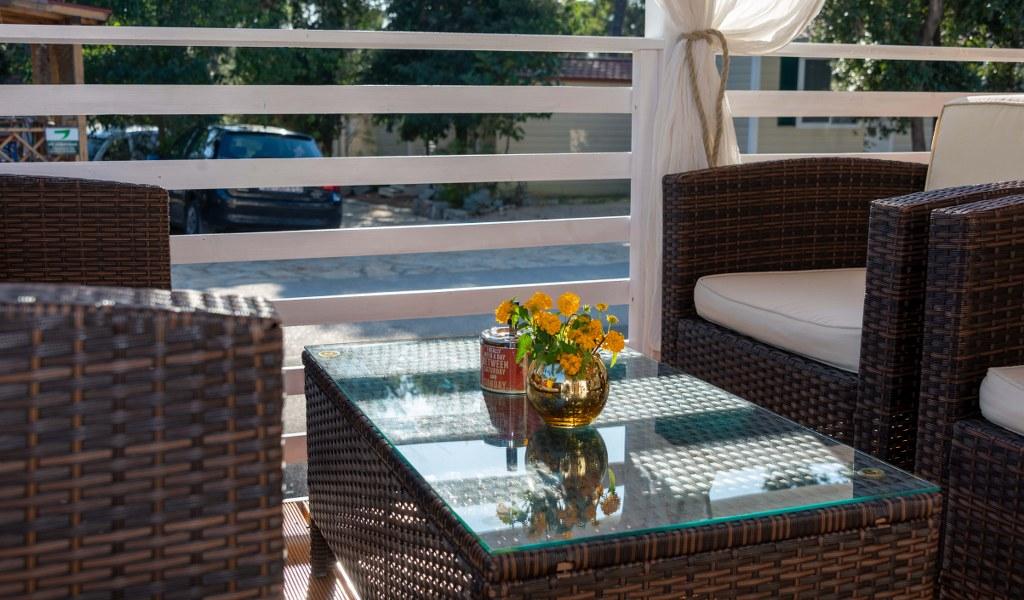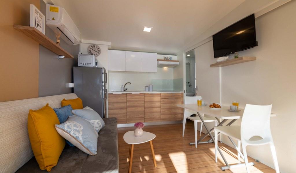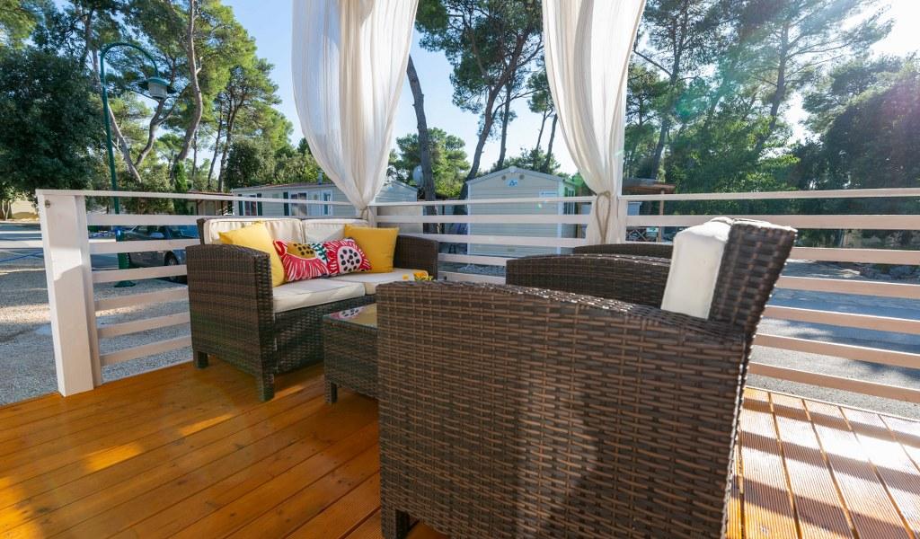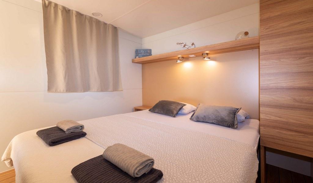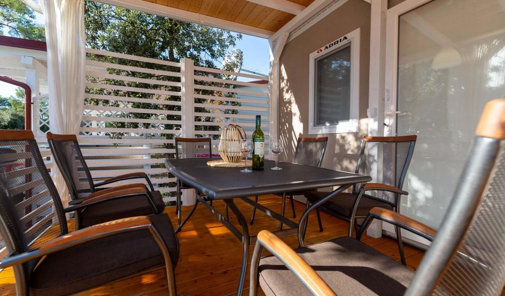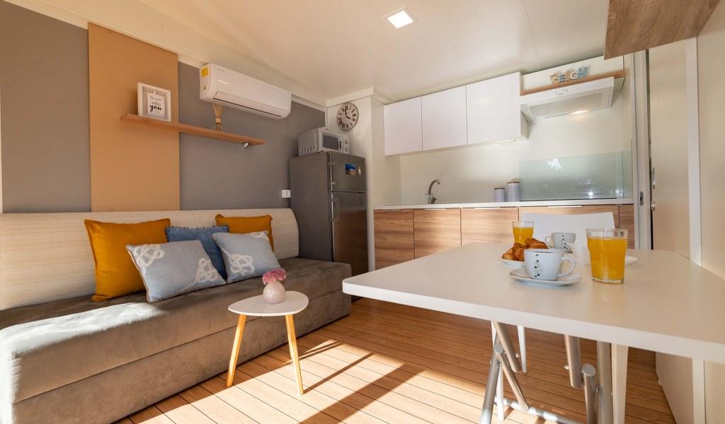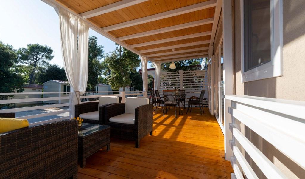 Nova, moderno i potpuno opremljena mobilna kućica sa dvije sobe, dnevnim boravkom u kojem se nalazi krevet na razvlačenje(135x180cm), potpuno opremljena kuhinja sa SAT TV, klimom, WI-FI, mikrovalnom, el. roštilj, malim kućanskim aparatima i dr, DVIJE KUPAONICE i velikom terasom 7, 5 X 3 metra, nalazi se u miru borove šume u kampu Soline u Biogradu na moru. Objekt je udaljen od plaže, caffe bara, restorana 250 metara, a u kampu se nalazi dječje igralište, aparati za pranje i sušenje rublja, bankomat, trgovina, pekara i sve što Vam je potrebno za ugodan boravak! U neposrednoj blizini kampa oko 1500 metara nalazi se središte Biograda u kojem su razni sadržaji, kao i marina Kornati!