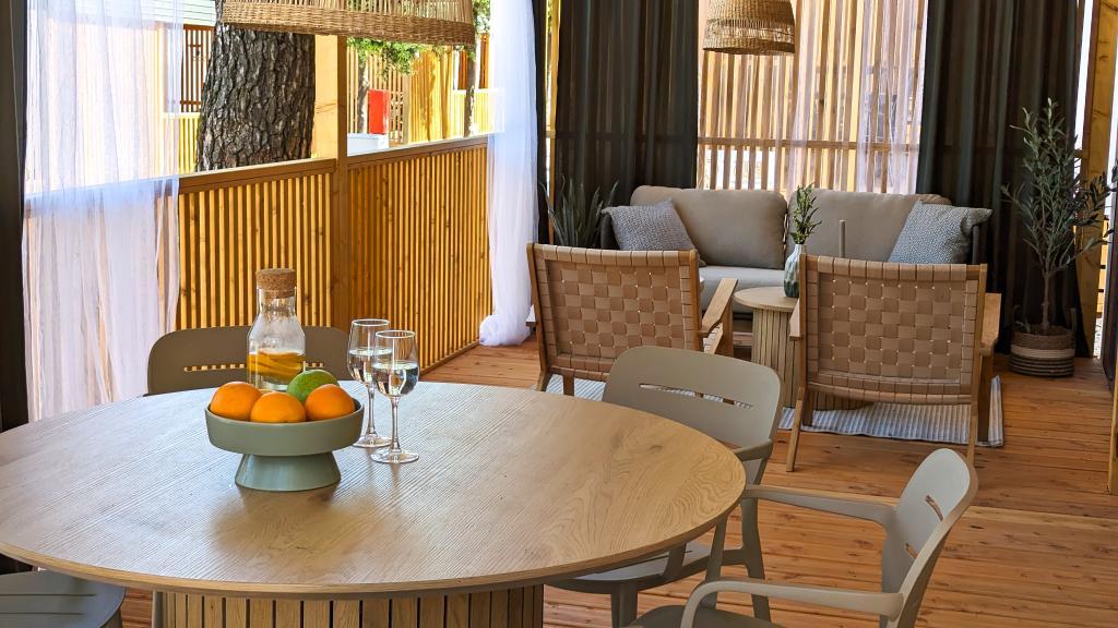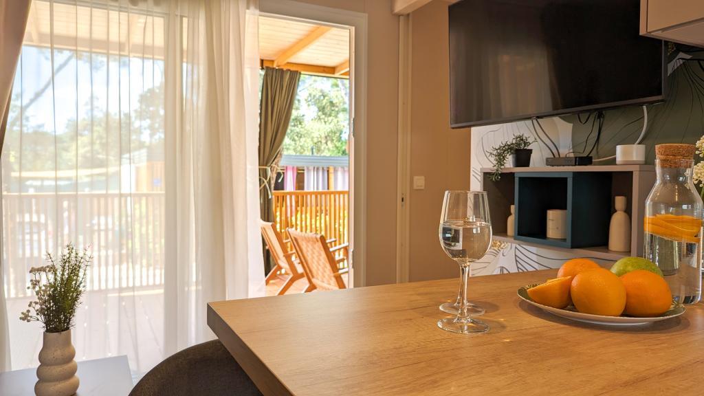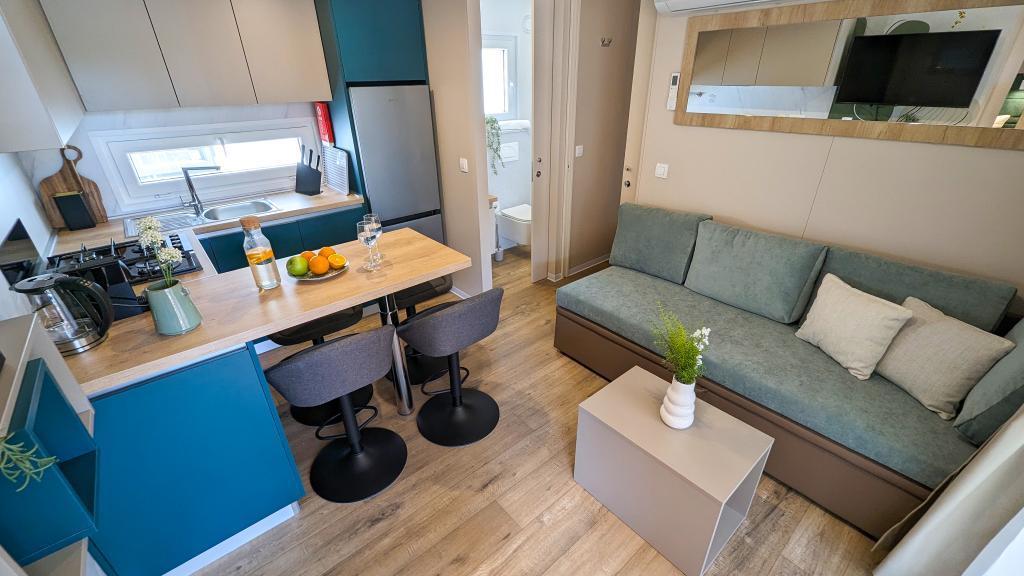 Uživajte u prirodi i udobnosti: Mobilne kućice Jaki u kampu Soline, Biograd na Moru. Smještene u mirnom dijelu kampa s 4 zvjezdice, okružene borovom šumom, naše moderno opremljene mobilne kućice idealne su za do 6 osoba. Uživajte u blizini plaže (2-5 minuta hoda), trgovina i restorana, te šetnici koja vodi do centra grada (15 minuta). Ove kućice nude 2 spavaće sobe i 2 kupaonice, dnevni boravak, veliku terasu s blagovaonskim stolom i lounge prostorom te potpuno opremljenu kuhinju - perilica suđa, mikrovalna pećnica, aparat za kavu, toster, blender, vanjski roštilj. Kućica također uključuje besplatan WiFi, besplatno parkirno mjesto odmah pored kuće, Smart TV, klima uređaj, ručnike i posteljinu. Kamp nudi mnoge sadržaje za cijelu obitelj: prekrasne pješčane i šljunčane plaže koje se protežu sve do centra grada, restoran s mediteranskim specijalitetima, dječje igralište, sportske aktivnosti i najam bicikla. Najveći hrvatski tematski vodeni park Dalmaland udaljen je 15 minuta vožnje autom.