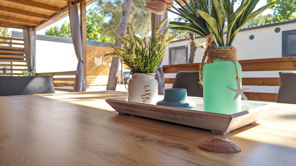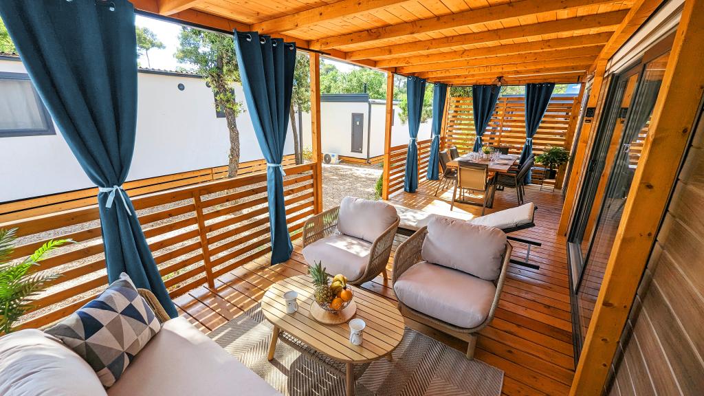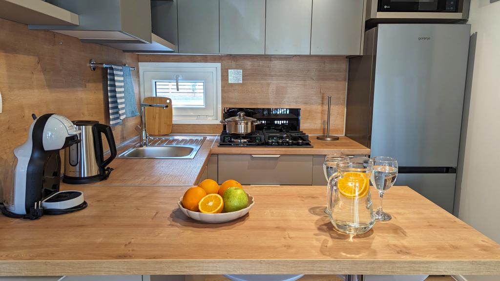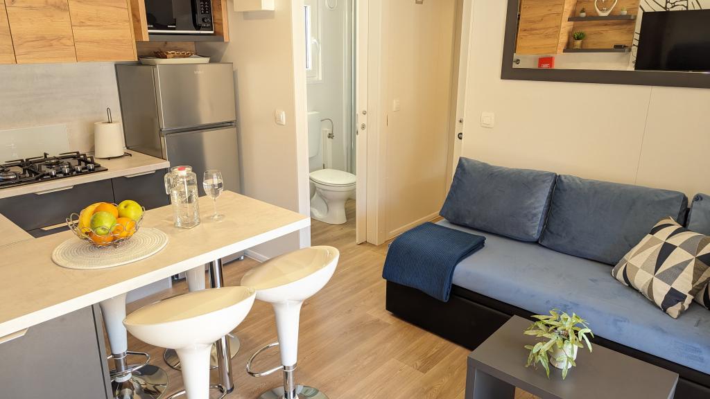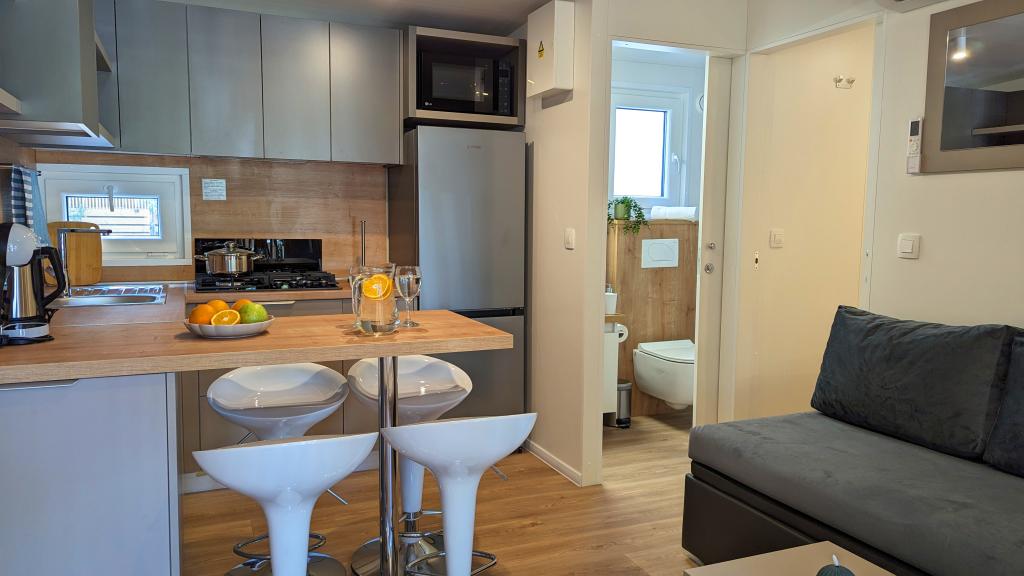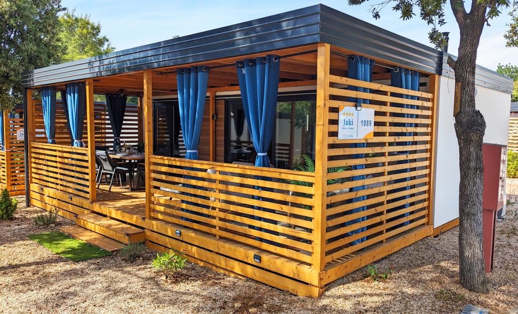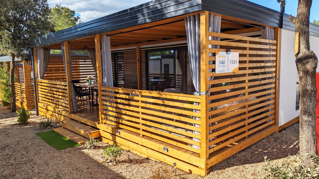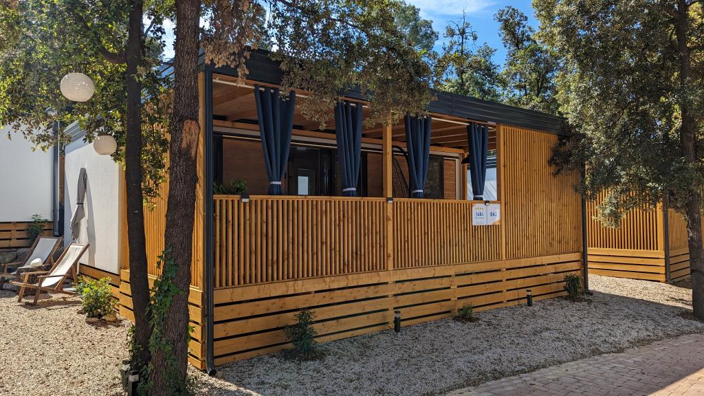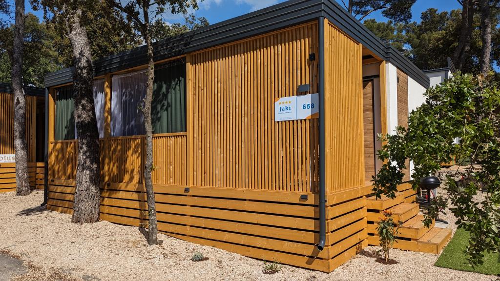 Uživajte u prirodi i udobnosti: Mobilne kućice Jaki u kampu Soline, Biograd na Moru. Smještene u mirnom dijelu kampa s 4 zvjezdice, okružene borovom šumom, naše moderno opremljene mobilne kućice idealne su za do 6 osoba. Uživajte u blizini plaže (2-5 minuta hoda), trgovina i restorana, te šetnici koja vodi do centra grada (15 minuta). Ove kućice nude 2 spavaće sobe i 2 kupaonice, dnevni boravak, veliku terasu s blagovaonskim stolom i lounge prostorom te potpuno opremljenu kuhinju - perilica suđa, mikrovalna pećnica, aparat za kavu, toster, blender, vanjski roštilj. Kućica također uključuje besplatan WiFi, besplatno parkirno mjesto odmah pored kuće, Smart TV, klima uređaj, ručnike i posteljinu. Kamp nudi mnoge sadržaje za cijelu obitelj: prekrasne pješčane i šljunčane plaže koje se protežu sve do centra grada, restoran s mediteranskim specijalitetima, dječje igralište, sportske aktivnosti i najam bicikla. Najveći hrvatski tematski vodeni park Dalmaland udaljen je 15 minuta vožnje autom.