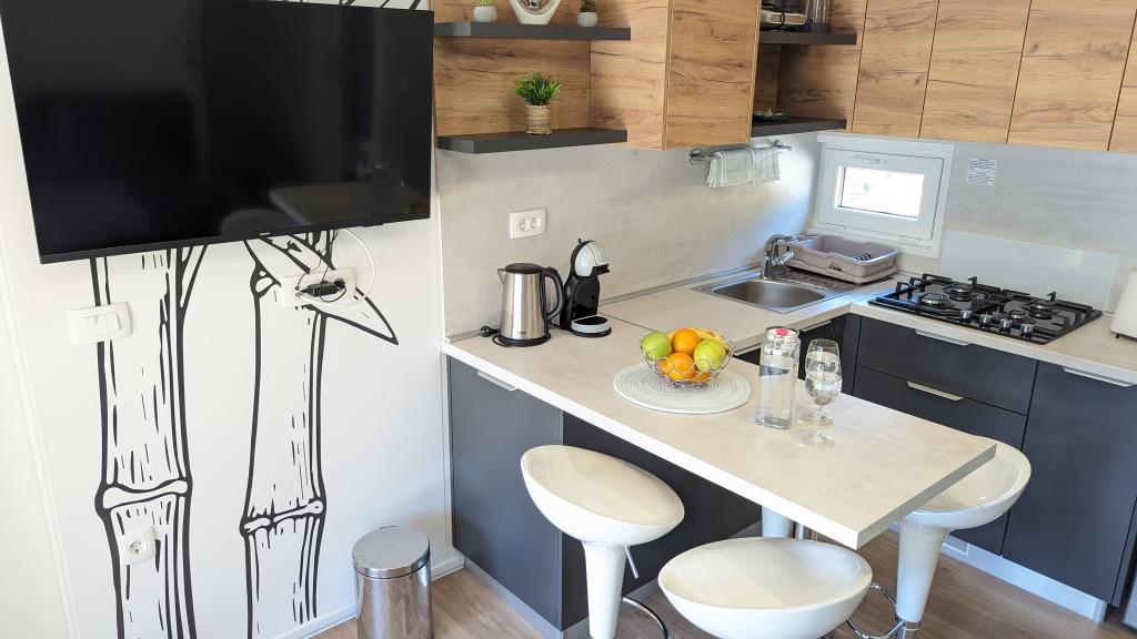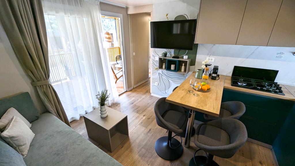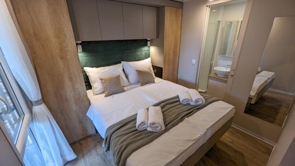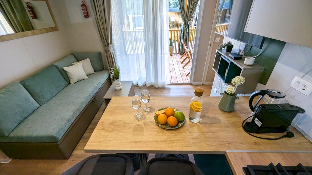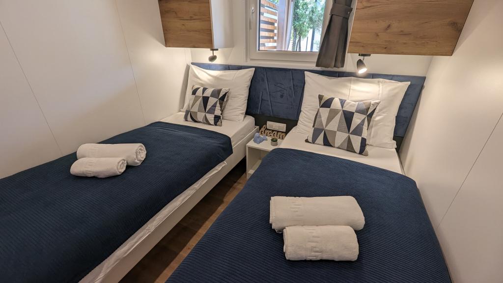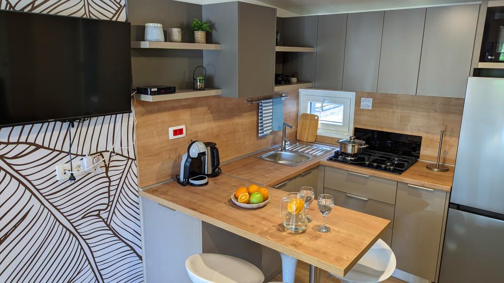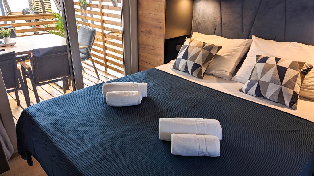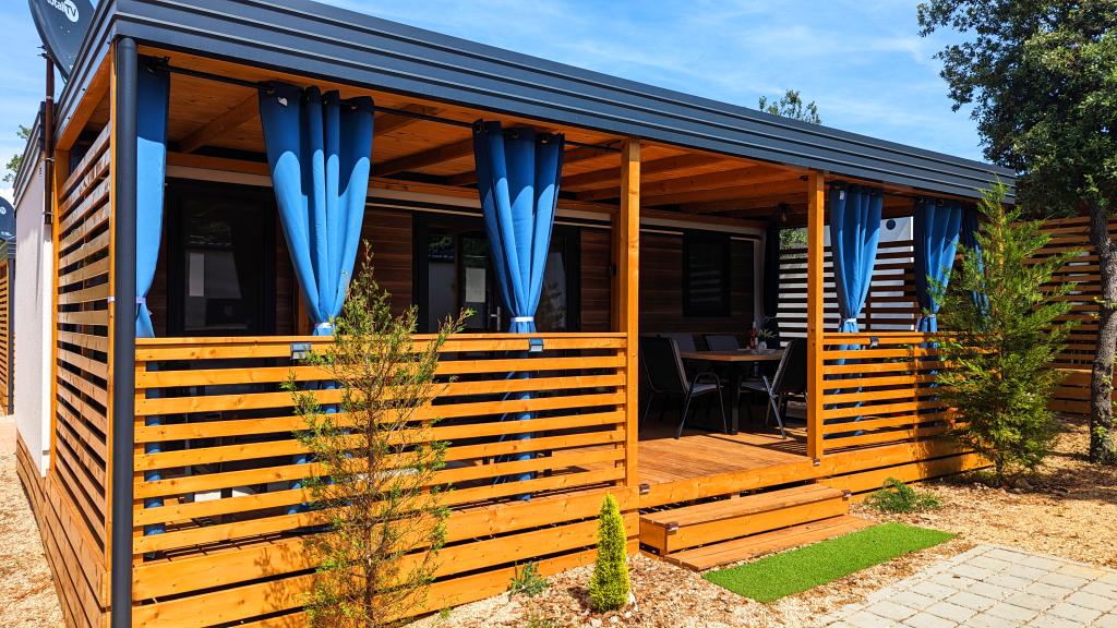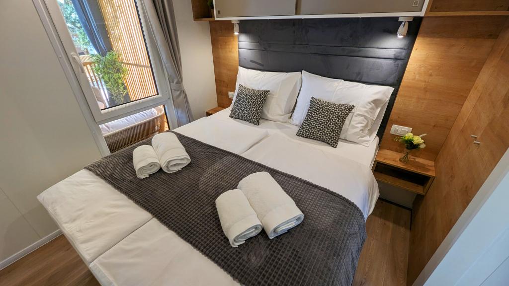 Uživajte u prirodi i udobnosti: Mobilne kućice Jaki u kampu Soline, Biograd na Moru. Smještene u mirnom dijelu kampa s 4 zvjezdice, okružene borovom šumom, naše moderno opremljene mobilne kućice idealne su za do 6 osoba. Uživajte u blizini plaže (2-5 minuta hoda), trgovina i restorana, te šetnici koja vodi do centra grada (15 minuta). Ove kućice nude 2 spavaće sobe i 2 kupaonice, dnevni boravak, veliku terasu s blagovaonskim stolom i lounge prostorom te potpuno opremljenu kuhinju - perilica suđa, mikrovalna pećnica, aparat za kavu, toster, blender, vanjski roštilj. Kućica također uključuje besplatan WiFi, besplatno parkirno mjesto odmah pored kuće, Smart TV, klima uređaj, ručnike i posteljinu. Kamp nudi mnoge sadržaje za cijelu obitelj: prekrasne pješčane i šljunčane plaže koje se protežu sve do centra grada, restoran s mediteranskim specijalitetima, dječje igralište, sportske aktivnosti i najam bicikla. Najveći hrvatski tematski vodeni park Dalmaland udaljen je 15 minuta vožnje autom.