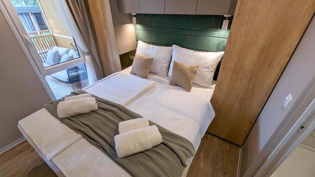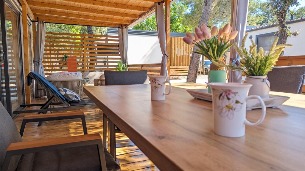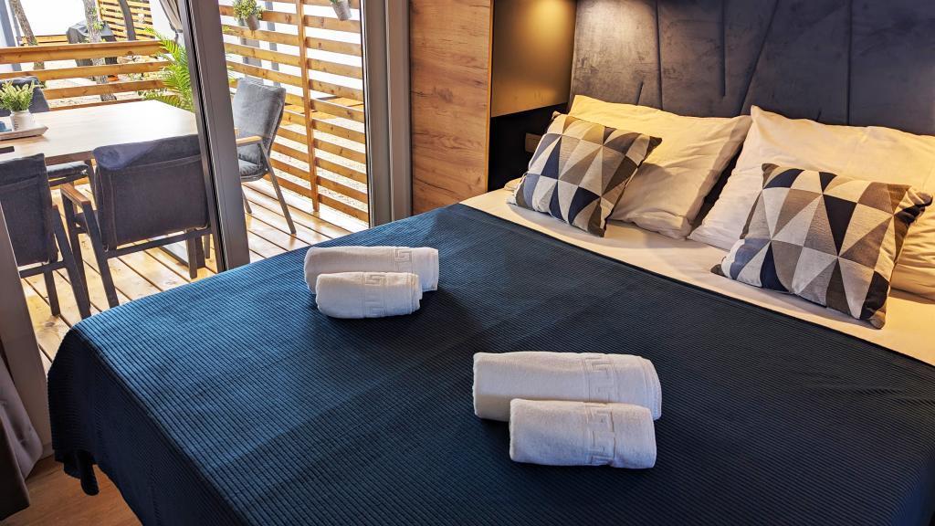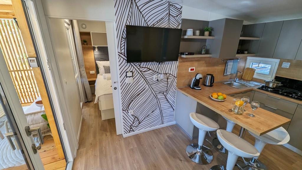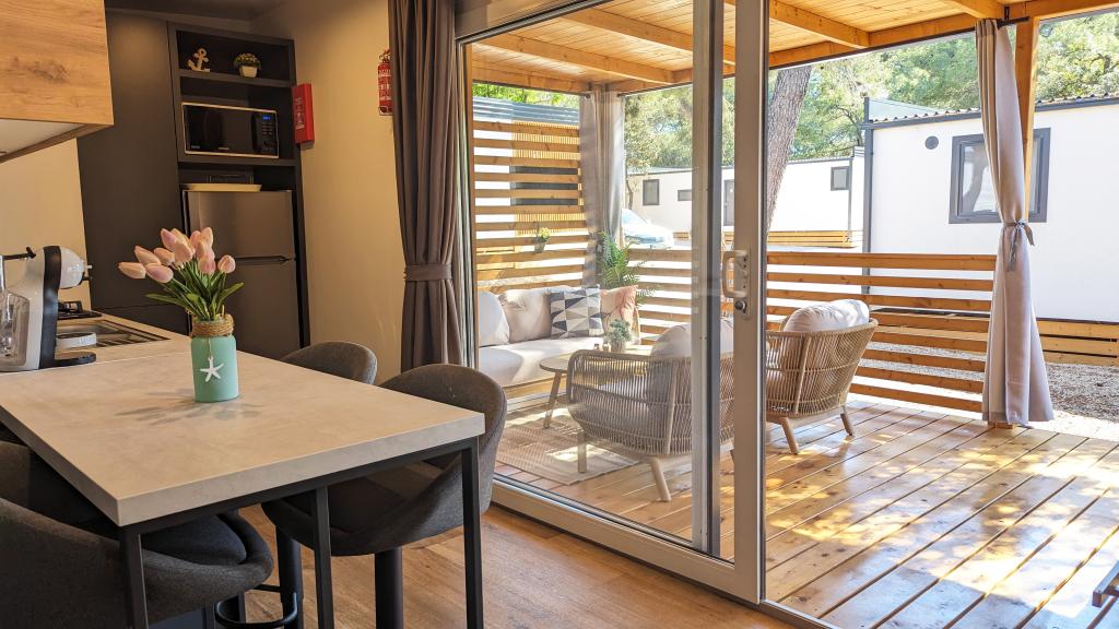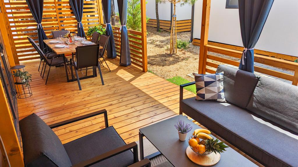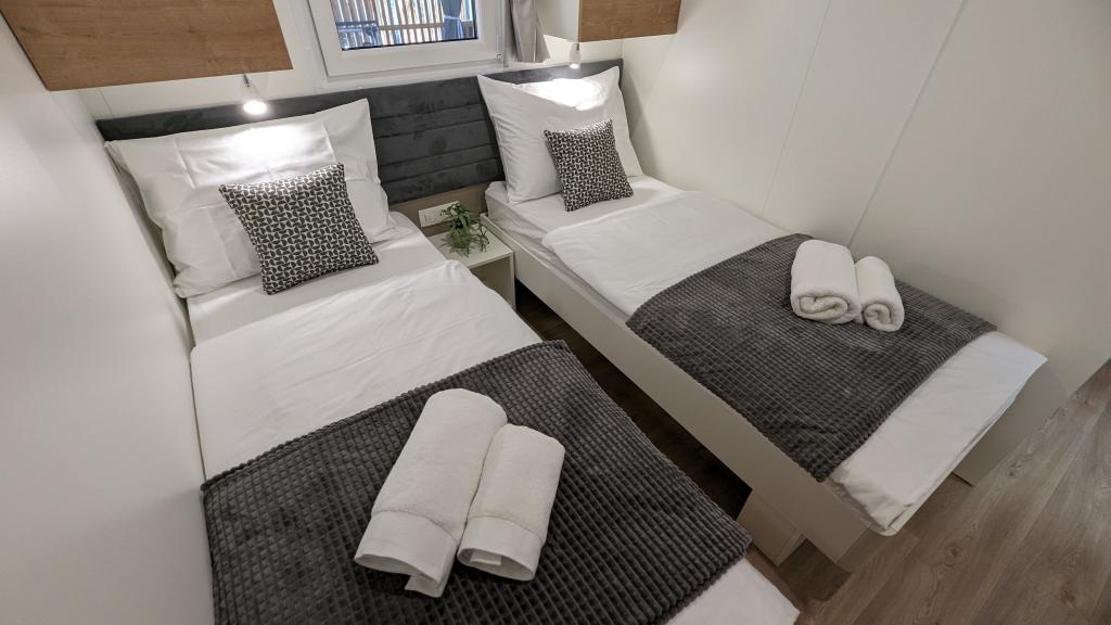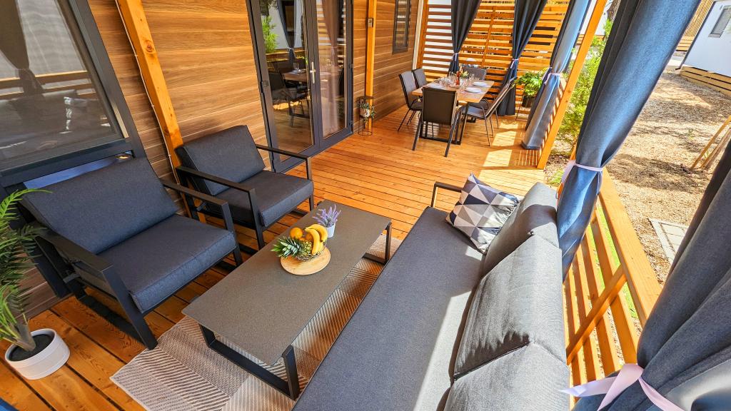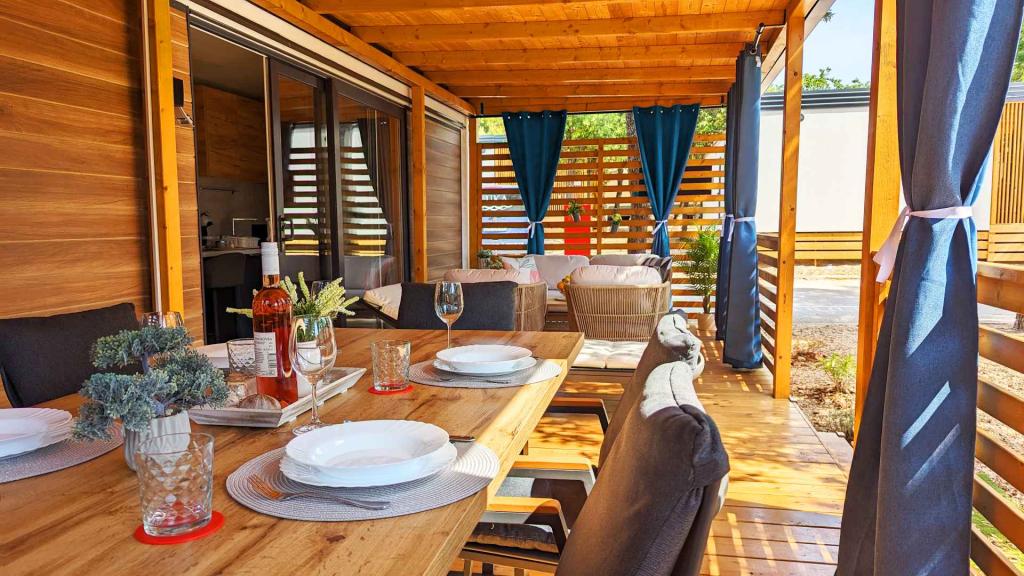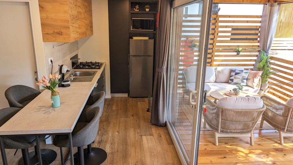 Uživajte u prirodi i udobnosti: Mobilne kućice Jaki u kampu Soline, Biograd na Moru. Smještene u mirnom dijelu kampa s 4 zvjezdice, okružene borovom šumom, naše moderno opremljene mobilne kućice idealne su za do 6 osoba. Uživajte u blizini plaže (2-5 minuta hoda), trgovina i restorana, te šetnici koja vodi do centra grada (15 minuta). Ove kućice nude 2 spavaće sobe i 2 kupaonice, dnevni boravak, veliku terasu s blagovaonskim stolom i lounge prostorom te potpuno opremljenu kuhinju - perilica suđa, mikrovalna pećnica, aparat za kavu, toster, blender, vanjski roštilj. Kućica također uključuje besplatan WiFi, besplatno parkirno mjesto odmah pored kuće, Smart TV, klima uređaj, ručnike i posteljinu. Kamp nudi mnoge sadržaje za cijelu obitelj: prekrasne pješčane i šljunčane plaže koje se protežu sve do centra grada, restoran s mediteranskim specijalitetima, dječje igralište, sportske aktivnosti i najam bicikla. Najveći hrvatski tematski vodeni park Dalmaland udaljen je 15 minuta vožnje autom.