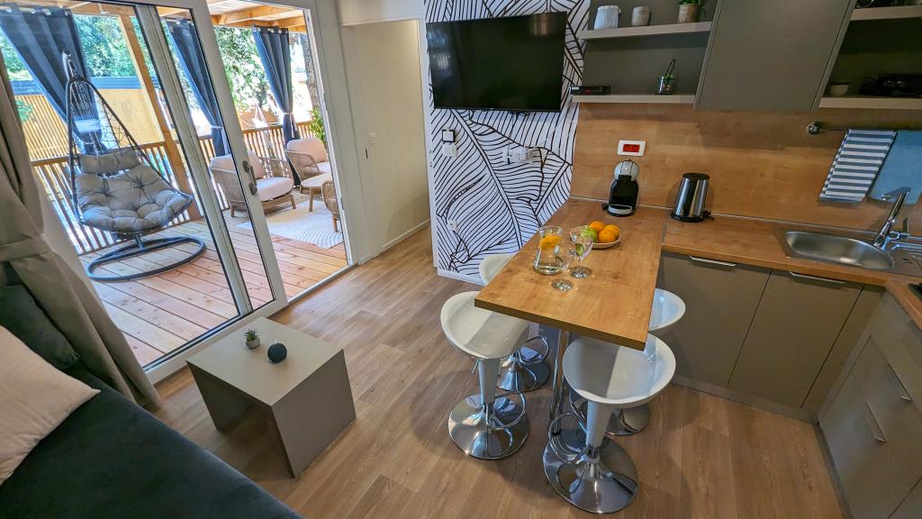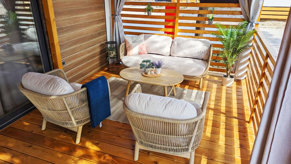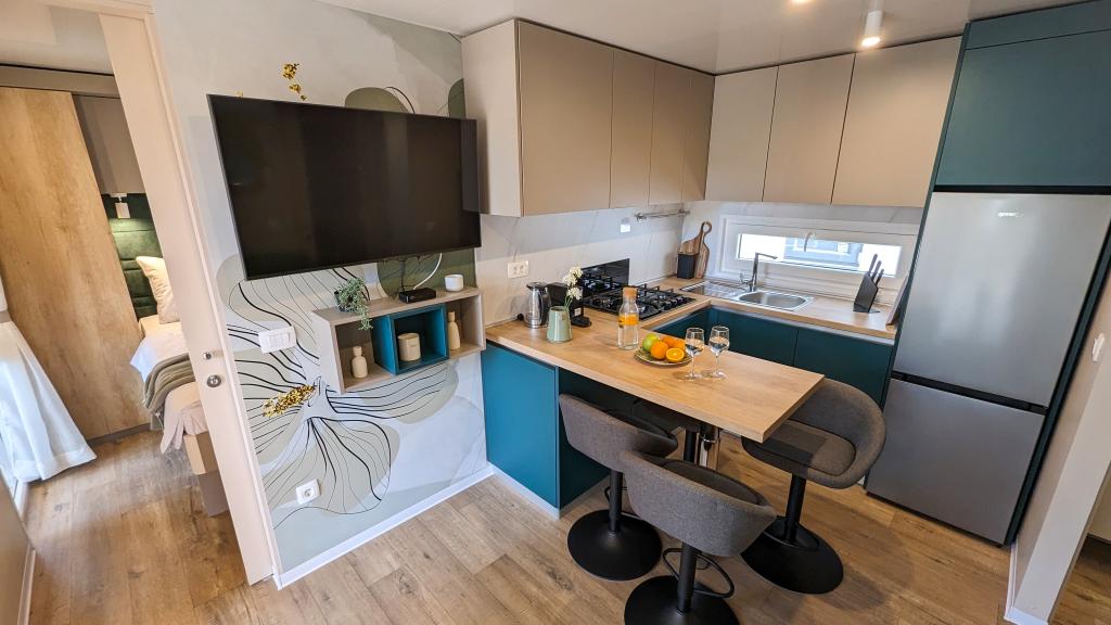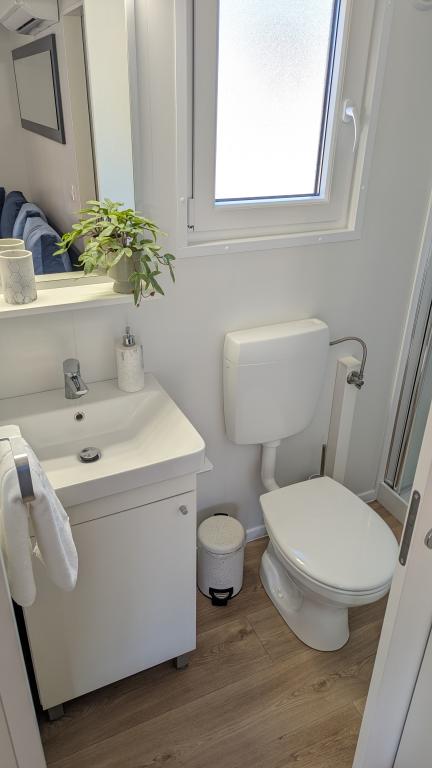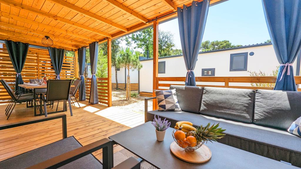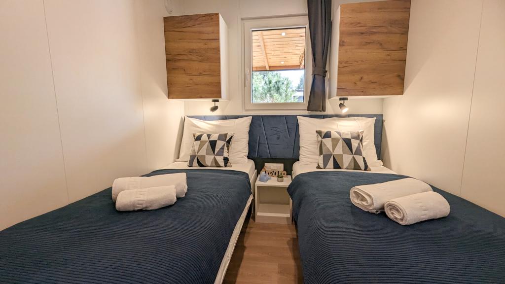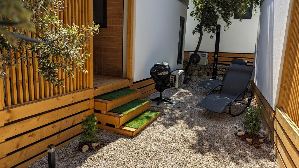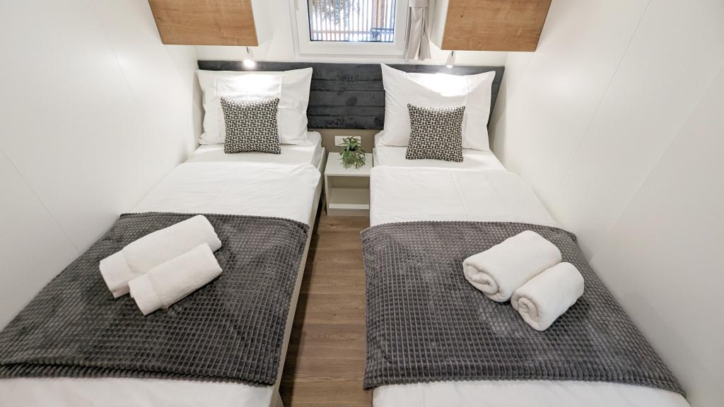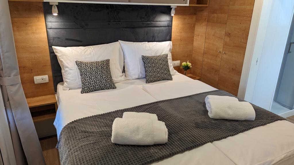 Uživajte u prirodi i udobnosti: Mobilne kućice Jaki u kampu Soline, Biograd na Moru. Smještene u mirnom dijelu kampa s 4 zvjezdice, okružene borovom šumom, naše moderno opremljene mobilne kućice idealne su za do 6 osoba. Uživajte u blizini plaže (2-5 minuta hoda), trgovina i restorana, te šetnici koja vodi do centra grada (15 minuta). Ove kućice nude 2 spavaće sobe i 2 kupaonice, dnevni boravak, veliku terasu s blagovaonskim stolom i lounge prostorom te potpuno opremljenu kuhinju - perilica suđa, mikrovalna pećnica, aparat za kavu, toster, blender, vanjski roštilj. Kućica također uključuje besplatan WiFi, besplatno parkirno mjesto odmah pored kuće, Smart TV, klima uređaj, ručnike i posteljinu. Kamp nudi mnoge sadržaje za cijelu obitelj: prekrasne pješčane i šljunčane plaže koje se protežu sve do centra grada, restoran s mediteranskim specijalitetima, dječje igralište, sportske aktivnosti i najam bicikla. Najveći hrvatski tematski vodeni park Dalmaland udaljen je 15 minuta vožnje autom.